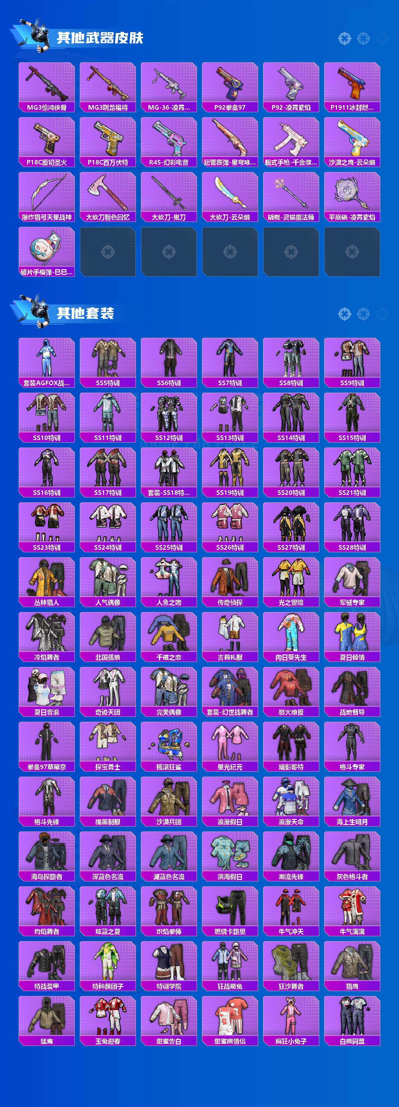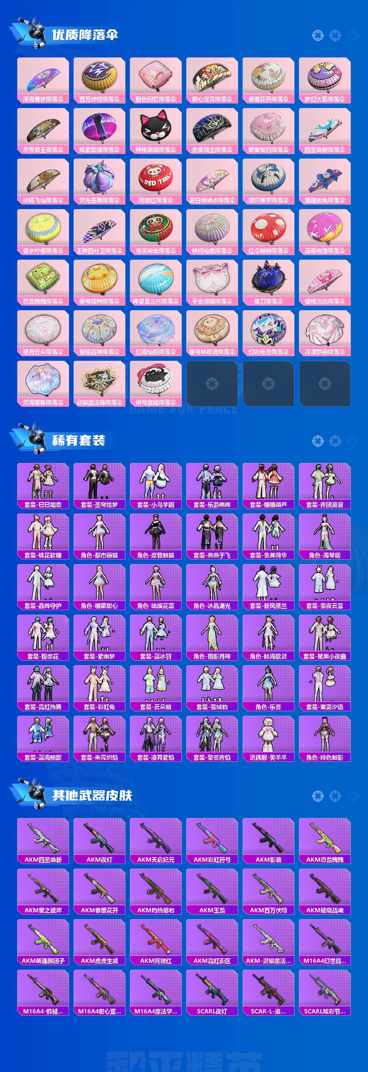 - [12349855]【商品标题】:有巧克力三姐妹!苹果 微信-30粉装-10特效枪-2载具-13粉色飞行器-106127热力值-14王牌印记-216套装-290枪皮 【热门品类】:粉装-梦幻火箭,粉装-缤纷油彩,套装-都市猎人,套装-深海小丑鱼,套装-奇异狩猎者,套装-胖达圆圆,套装-暗影哥特,套装-红红火火,角色-Mark.06,撬棍-龙胆亮银枪 【粉色载具】:宾利飞驰(布罗德盖棕双色),护世瑞兽 【粉色套装】:粉装-快乐主宰,粉装-甜心巧克力,粉装-宝贝奶油派,粉装-天使彩虹糖,粉装-金曜白虎,粉装-梦幻火箭,粉装-缤纷油彩,粉装-冰霜白皇,粉装-炙焰红王,粉装-暗夜玫瑰,粉装-彩虹鹿灵,角色-洛天依,角色-初号机款机体服,角色-白勺歌姬,角色-小可学妹,粉装-未来歌姬,粉装-闲梦青缨,角色-茉莉星,角色-水仙星,角色-烟云彩露,角色-严莉莉,角色-小蓝,角色-美雪,角色-美琪,角色-光极星,角色-星空武士,角色-千金淑猫,粉装-星穹咏叹调,角色-狂魇小丑,角色-罗征 【粉色枪皮等级】:AKM-梦之光华(五级),SCAR-L-纯梦嫁纱(五级),M416-五爪金龙(七级),AUG-暖羊咩咩(五级),UMP45-量子极限(五级),Kar98K-未来歌姬(五级),Kar98K-巳巳如意(五级),DP-28-豹影疾电(五级),MG3-洛神天依(五级),破片手榴弹-热量炸弹(七级) 【粉色枪皮】:AKM-梦之光华,SCAR-L-纯梦嫁纱,M416-五爪金龙,AUG-暖羊咩咩,UMP45-量子极限,Kar98K-未来歌姬,Kar98K-巳巳如意,DP-28-豹影疾电,MG3-洛神天依,破片手榴弹-热量炸弹 【粉色飞行器】:齐天大圣飞行器,梦幻舞会飞行器,白勺歌姬飞行器,拂晓神骑飞行器,超新星飞行器,鎏金朋克飞行器,星空武士飞行器,龙翔九天飞行器,BEARBRICK飞行器,凤舞九天飞行器,戏水时光飞行器,桃源时光飞行器 【粉色降落伞】:快乐主宰降落伞,至尊龙雀降落伞,梦幻火箭降落伞,童趣迷兔降落伞,暗夜玫瑰降落伞,齐天大圣降落伞,洛神天依降落伞,恐龙拽拽降落伞,旋转彩虹降落伞,白勺歌姬降落伞,未来歌姬降落伞,变形金刚降落伞,粉樱探戈降落伞,万古烈焰降落伞,祥瑞锦鲤降落伞,江南烟雨降落伞,巴啦啦小魔仙降落伞,电糖天使降落伞,精灵梦叶罗丽降落伞,金丰海韵降落伞,忍者神龟降落伞,金蛇镇世降落伞,鬼刀