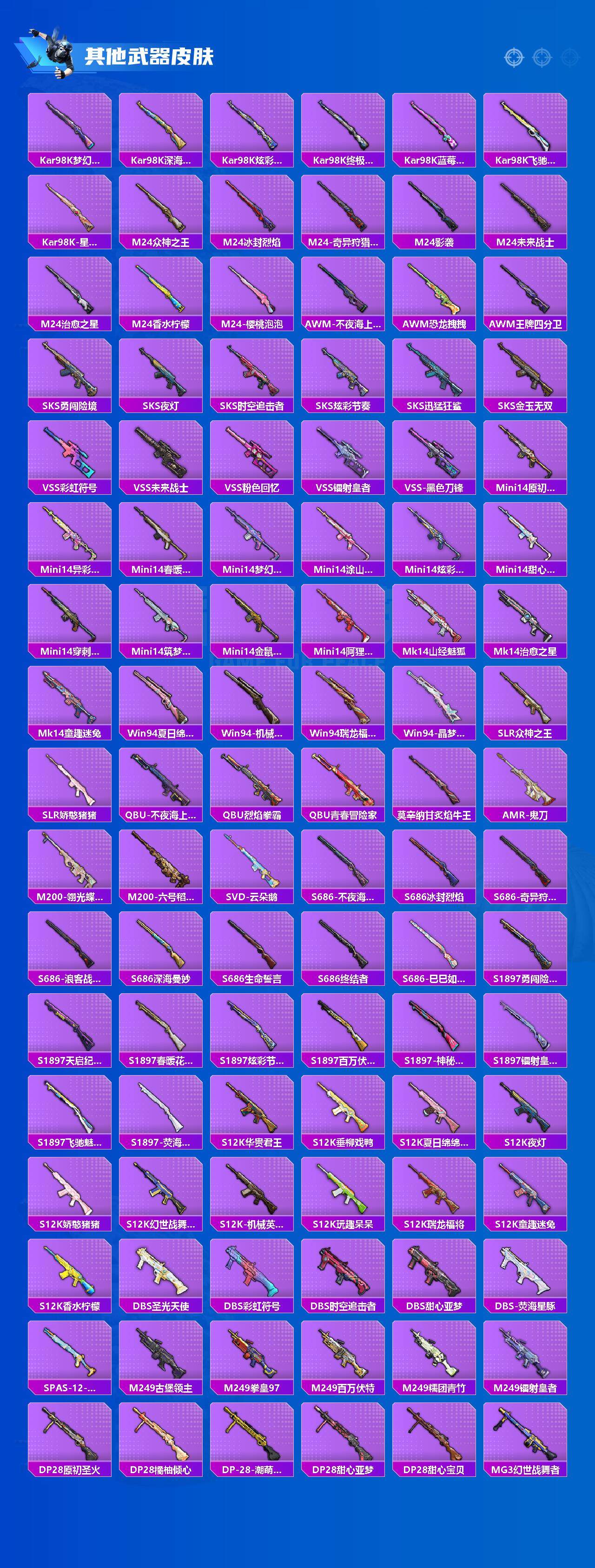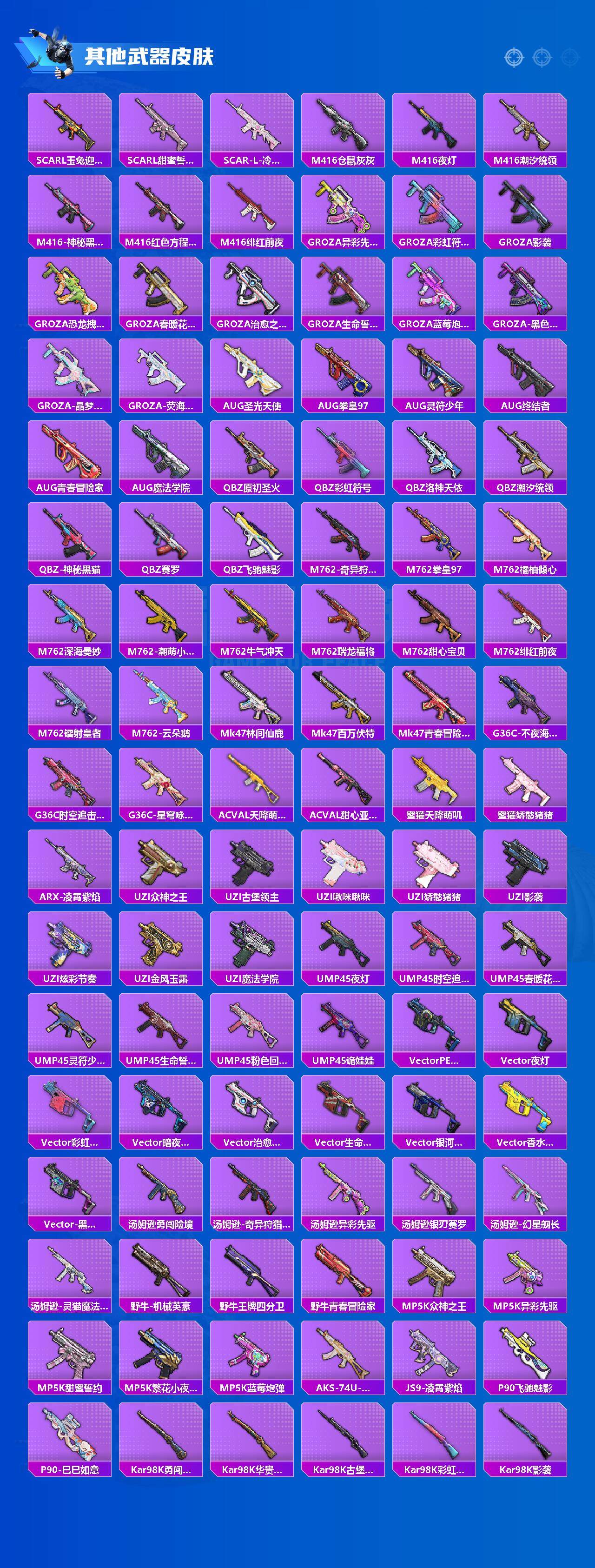 【粉色枪皮】:AKM-炫紫旋律,SCAR-L-梦幻火箭,SCAR-L-童趣迷兔,M416-心之恋语,M416-灵猫魔法师,GROZA-香水柠檬,GROZA-镜光银凌,AUG-暖羊咩咩,M762-甜蜜誓约,Kar98K-巳巳如意,Mk14-甜梦熊击,DP-28-千金淑猫,DP-28-豹影疾电
