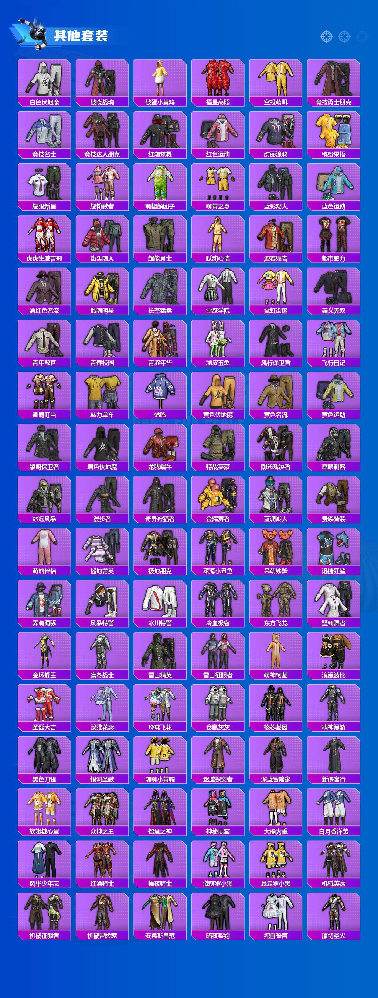 套装-浪漫天命,套装-暗影哥特,套装-狂沙舞者,套装-破蛋小黄鸡,套装-漫步者,套装-弄潮海豚,套装-雪山精英,套装-黑色刀锋,新侠客行套装,套装-软嫩糖心蛋,白月香洋装套装,风华少年志套装,套装-机械英豪,套装-安第斯皇冠,套装-暗夜契约,套装-纯白誓言,粉甜马卡龙套装,套装-静谧青瓷,套装-韶华初心,套装-梦之呓语,薄荷蓝莓套装,套装-冰爽海盐,套装-梦起落英,套装-瑞龙福将,套装-团圆交子,套装-豚鼠丹丹