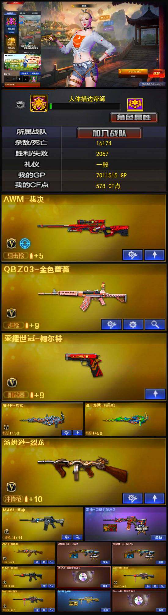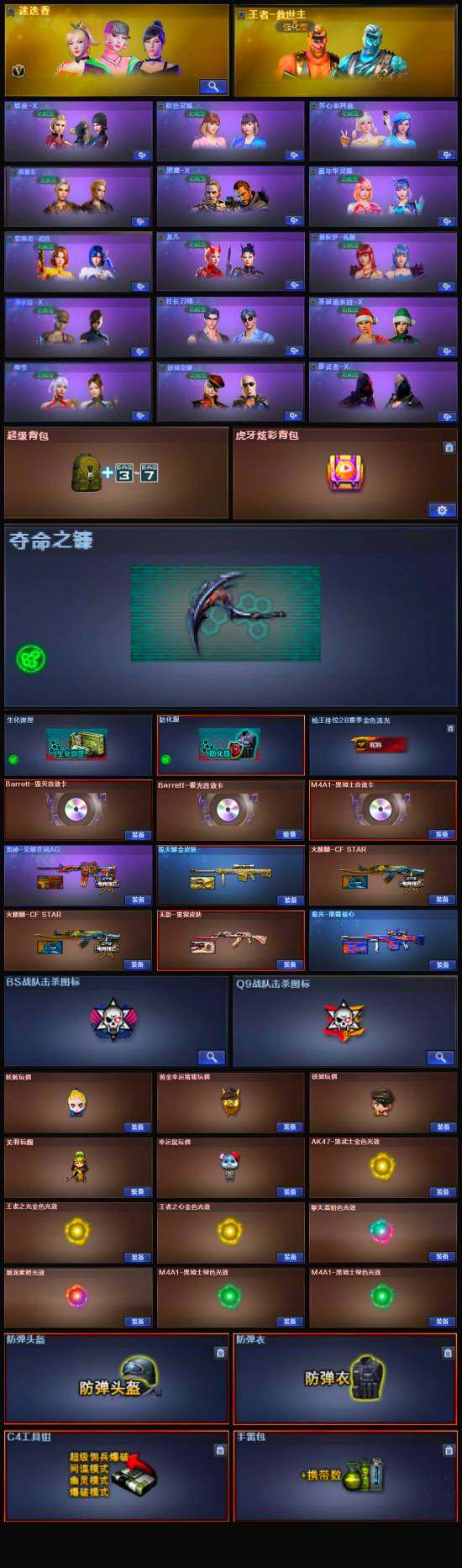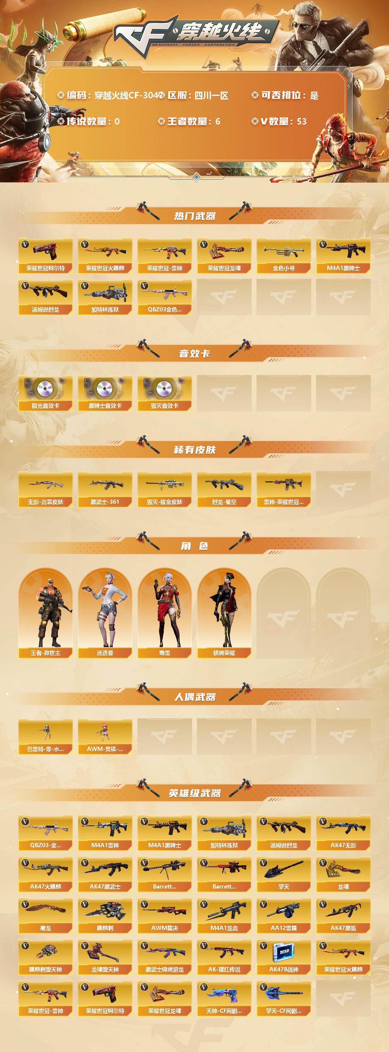 [12908389]四川一区-53V-6王者-0炫金 【热门武器】:QBZ03-金色蔷薇,荣耀世冠-火麒麟,荣耀世冠-雷神,荣耀世冠-柯尔特,金色小号,M4A1-黑骑士,汤姆逊-烈龙,加特林-炼狱,荣耀世冠-龙啸 【音效卡】:M4A1-黑骑士音效卡,Barrett-毁灭音效卡,Barrett-极光音效卡 【稀有皮肤】:雷神-荣耀世冠AG,毁灭耀金皮肤,无影-霓裳皮肤,AK47-黑武士-361,烈龙-星空 【角色】:迷迭香,王者-救世主,蜀雪,铁骑荣耀 【人偶武器】:巴雷特-零-水下丽影*2,AWM-灵狐-15周年嘉年华 【英雄级武器】:AK47-火麒麟,M4A1-雷神,M4A1-黑骑士,AK47-无影,AK47-黑武士,AK47-黑鲨,M4A1-龙血,黑武士-锦绣游龙,QBZ03-金色蔷薇,AK-47-猩红传说*5,AK47-B-战神,荣耀世冠-火麒麟,荣耀世冠-雷神,Barrett-毁灭*2,Barrett-极光,AWM-裁决,加特林-炼狱,汤姆逊-烈龙,AA-12-雷霆,荣耀世冠-柯尔特,天神-CF网剧冠军,屠龙*2,龙啸,麒麟刺-堕天神,擎天,麒麟刺,荣耀世冠-龙啸,龙啸-堕天神,擎天-CF网剧冠军 【特殊枪械】:1黑骑士,1烈龙,1炼狱