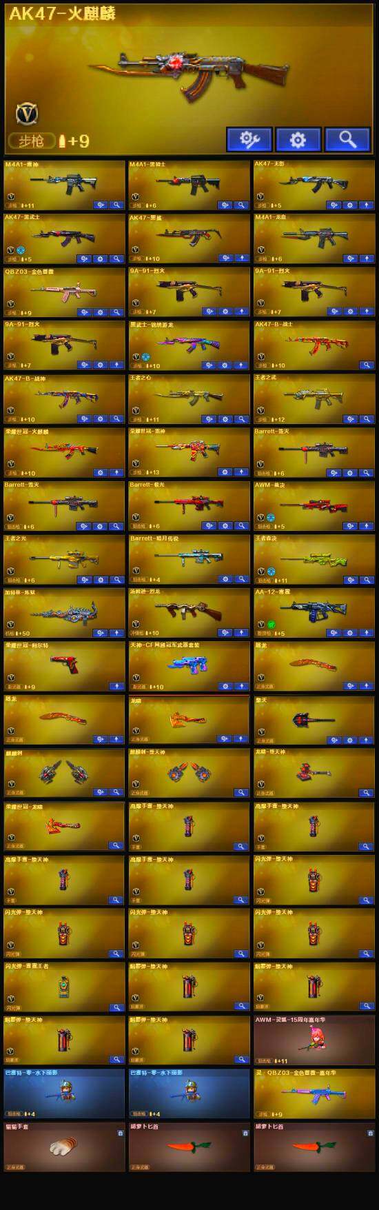 【英雄级武器】:AK47-火麒麟,M4A1-雷神,M4A1-黑骑士,AK47-无影,AK47-黑武士,AK47-黑鲨,M4A1-龙血,黑武士-锦绣游龙,QBZ03-金色蔷薇,AK-47-猩红传说*5,AK47-B-战神,荣耀世冠-火麒麟,荣耀世冠-雷神,Barrett-毁灭*2,Barrett-极光,AWM-裁决,加特林-炼狱,汤姆逊-烈龙,AA-12-雷霆,荣耀世冠-柯尔特,天神-CF网剧冠军,屠龙*2,龙啸,麒麟刺-堕天神,擎天,麒麟刺,荣耀世冠-龙啸,龙啸-堕天神,擎天-CF网剧冠军