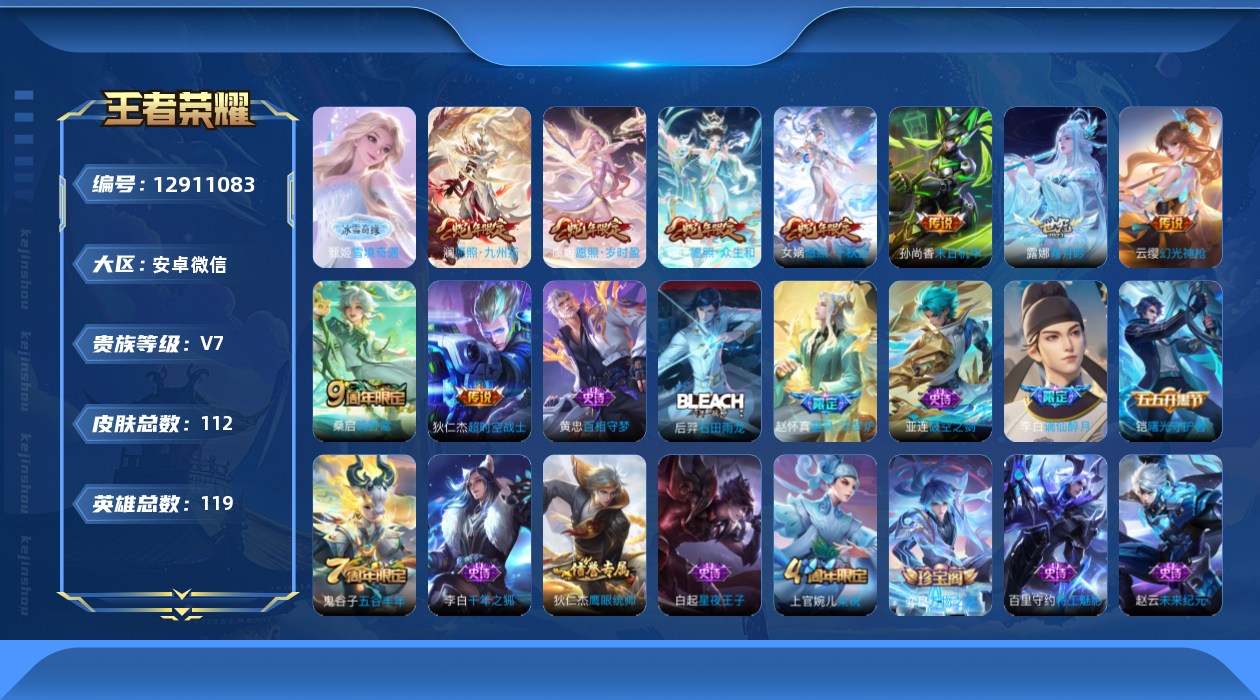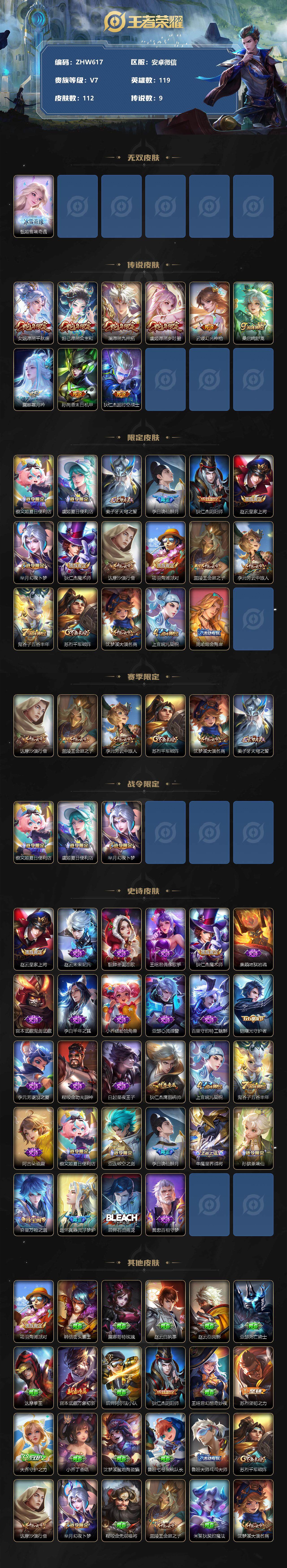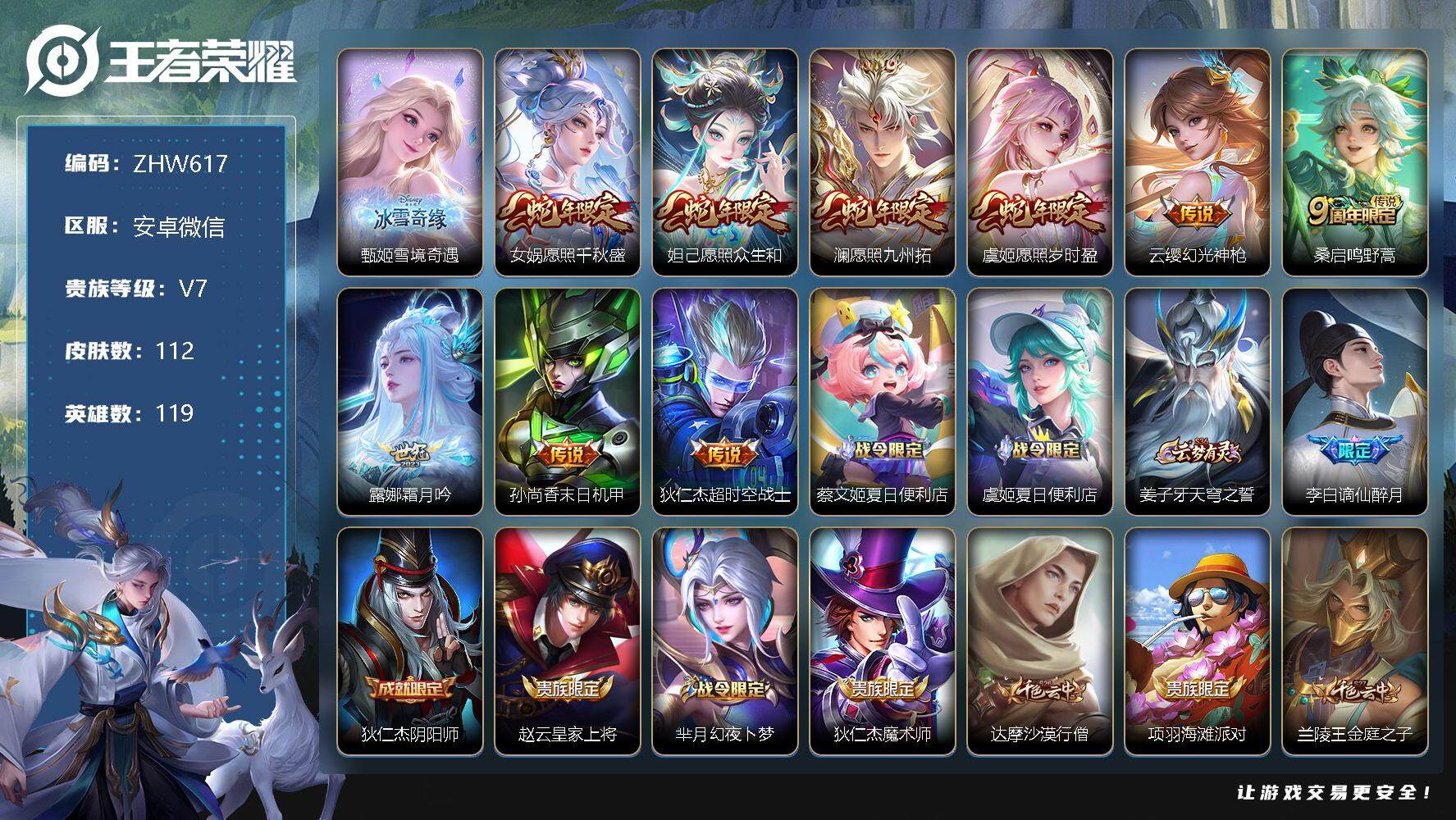 [12911083]【特价!急出!】安卓WX-V7-最强王者段位-119英雄-112皮肤-0典藏-0珍品无双-1无双-0珍品传说-9传说-28史诗