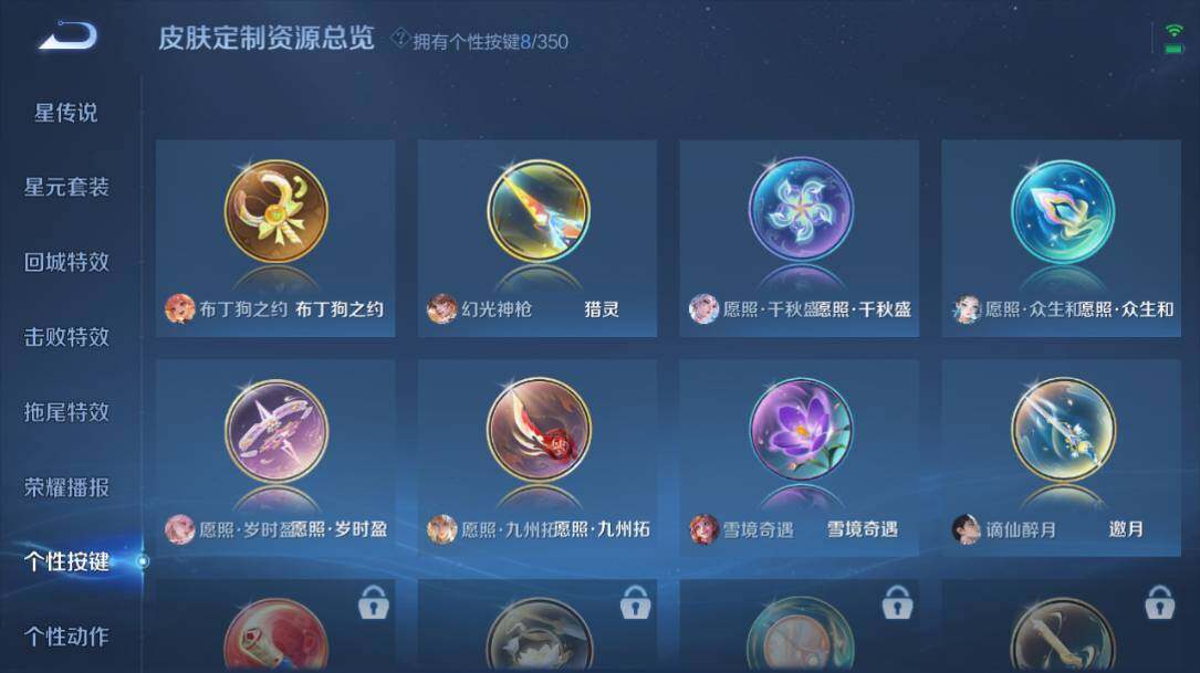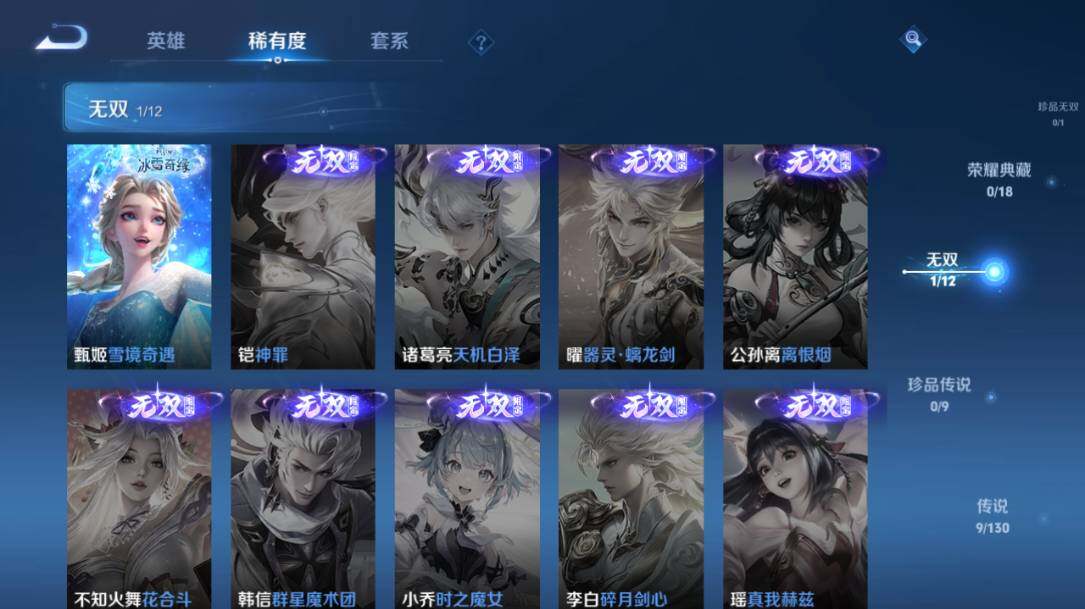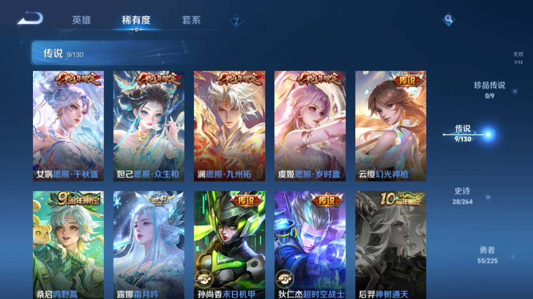 【传说皮肤】:女娲愿照千秋盛,妲己愿照众生和,澜愿照九州拓,虞姬愿照岁时盈,云缨幻光神枪,桑启鸣野蒿,露娜霜月吟,孙尚香末日机甲,狄仁杰超时空战士