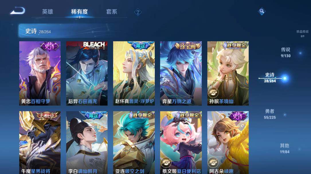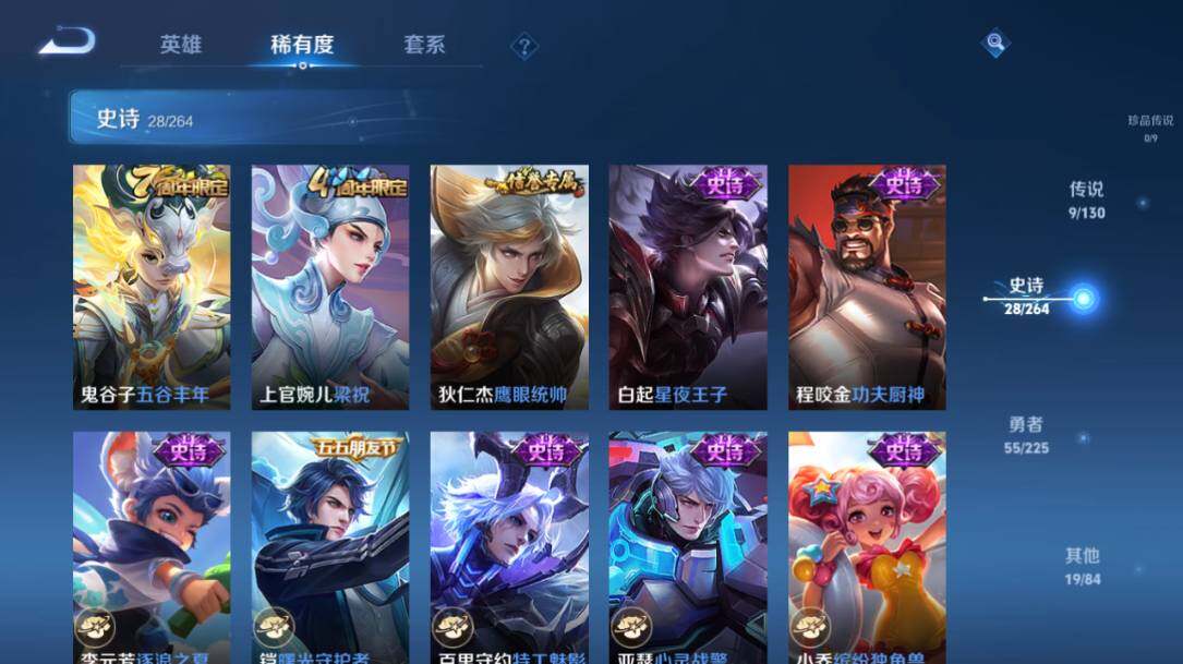【史诗皮肤】:赵云皇家上将,赵云未来纪元,貂蝉圣诞恋歌,王昭君偶像歌手,狄仁杰魔术师,廉颇地狱岩魂,宫本武藏鬼剑武藏,李白千年之狐,小乔缤纷独角兽,亚瑟心灵战警,百里守约特工魅影,铠曙光守护者,李元芳逐浪之夏,程咬金功夫厨神,白起星夜王子,狄仁杰鹰眼统帅,上官婉儿梁祝,鬼谷子五谷丰年,阿古朵顽趣,蔡文姬夏日便利店,亚连破空之剑,李白谪仙醉月,牛魔星界战将,孙膑茶境仙,弈星万物之道,赵怀真器灵浮梦炉,后羿石田雨龙,黄忠百相守梦