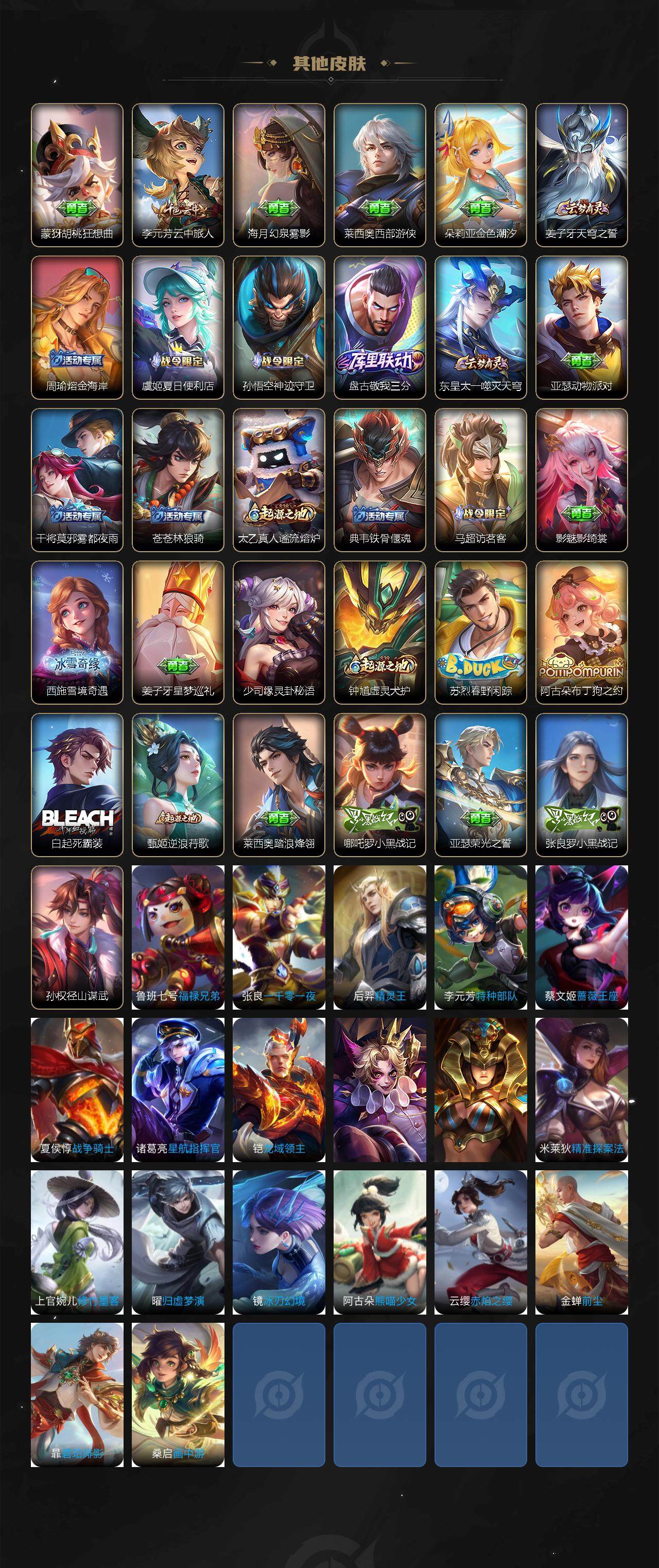 【其他皮肤】:项羽海滩派对,韩信街头霸王,露娜哥特玫瑰,赵云白执事,赵云忍炎影,亚瑟死亡骑士,达摩拳王,宫本武藏万象初新,后羿阿尔法小队,狄仁杰阴阳师,王昭君幻想奇妙夜,苏烈坚韧之力,大乔守护之力,小乔丁香结,沈梦溪鲨炮海盗猫,鲁班七号黑桃队长,鲁班大师乓乓大师,苏烈千军破阵,达摩沙漠行僧,芈月幻夜卜梦,程咬金无双福将,兰陵王金庭之子,米莱狄契约魔法,沈梦溪大漠名商,蒙犽胡桃狂想曲,李元芳云中旅人,海月幻泉雾影,莱西奥西部游侠,朵莉亚金色潮汐,姜子牙天穹之誓,周瑜熔金海岸,虞姬夏日便利店,孙悟空神迹守卫,盘古敬我三分,东皇太一噬灭天穹,亚瑟动物派对,干将莫邪雾都夜雨,苍苍林狼骑,太乙真人谧流熔炉,典韦铁骨偃魂,马超访茗客,影魅影绮裳,西施雪境奇遇,姜子牙星梦巡礼,少司缘灵卦秘语,钟馗虚灵犬护,苏烈春野闲踪,阿古朵布丁狗之约,白起死霸装,甄姬逆浪荇歌,莱西奥踏浪烽翎,哪吒罗小黑战记,亚瑟