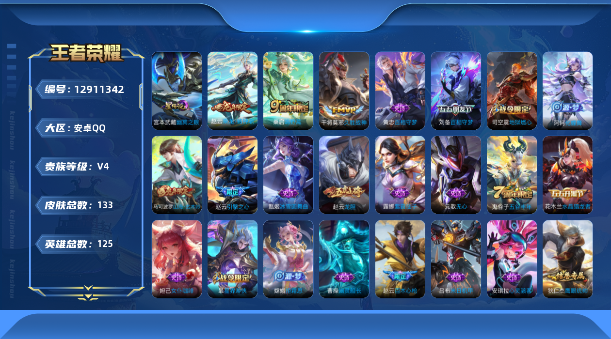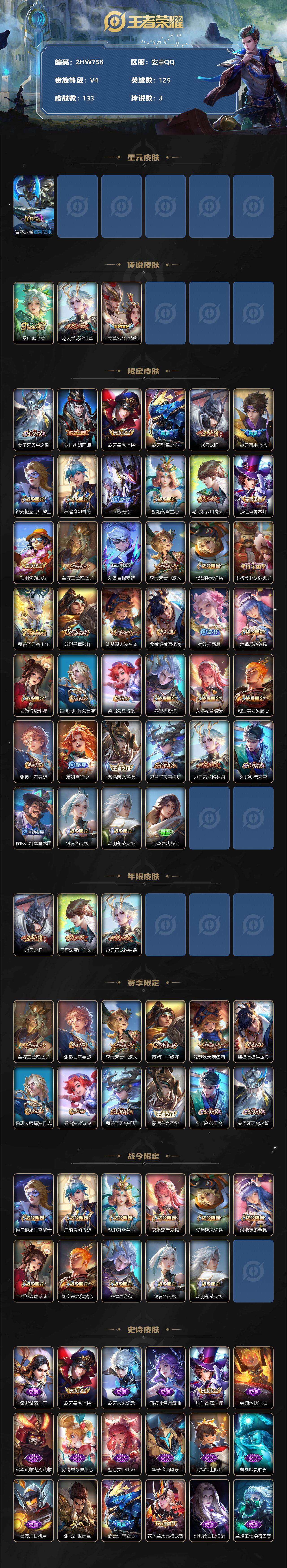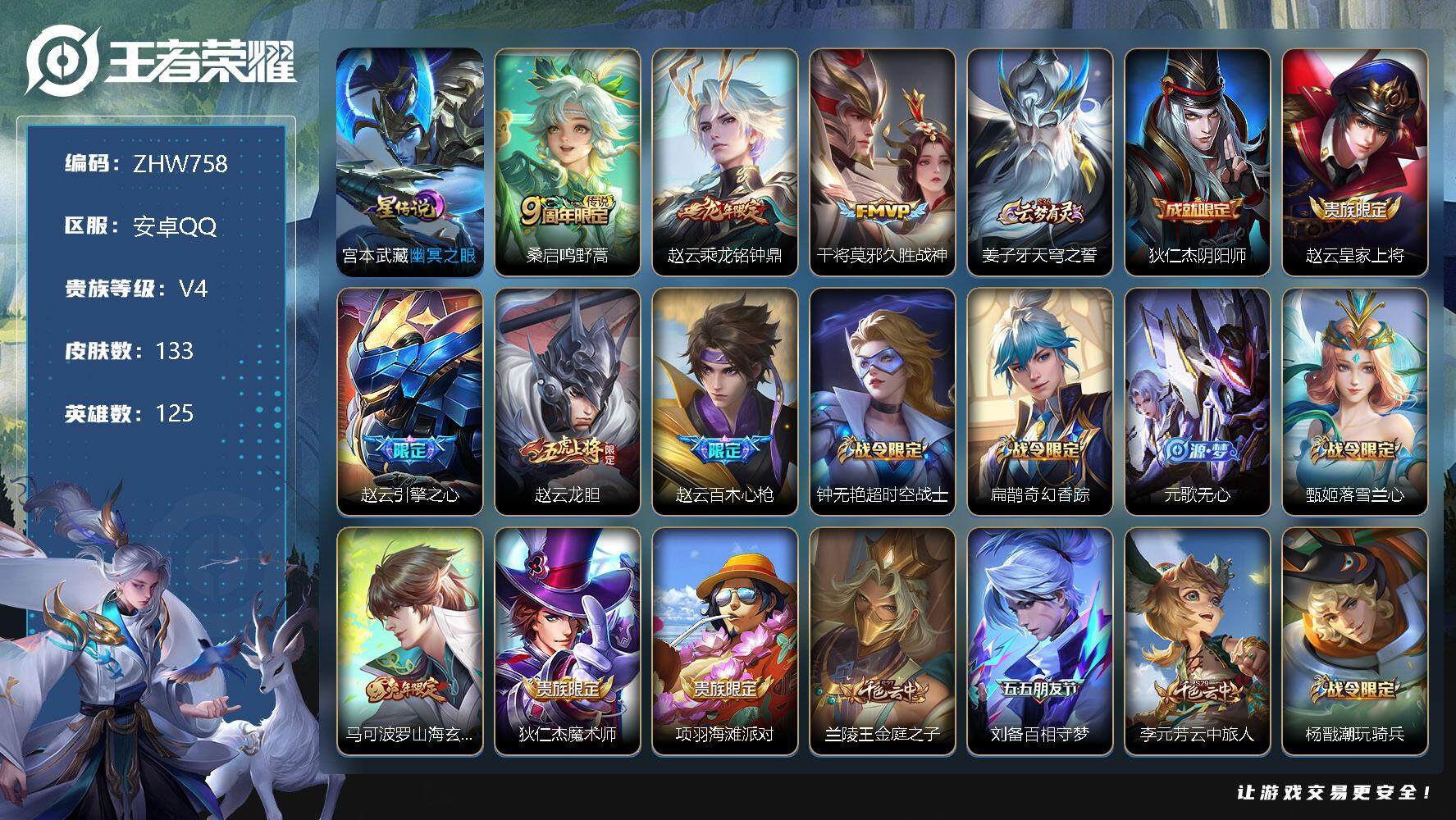[12911342]【特价急出/详情看图/背包一颗荣耀水晶】:安卓Q-V4-至尊星耀IV段位-125英雄-133皮肤-1星元-3传说-44史诗