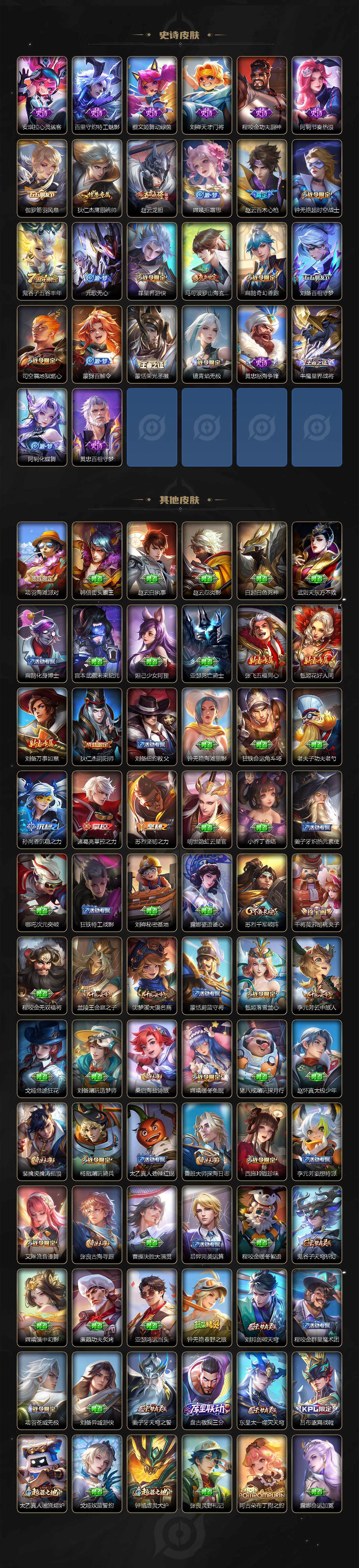 【史诗皮肤】:露娜紫霞仙子,赵云皇家上将,赵云未来纪元,甄姬冰雪圆舞曲,狄仁杰魔术师,廉颇地狱岩魂,宫本武藏鬼剑武藏,孙尚香水果甜心,妲己女仆咖啡,墨子金属风暴,刘禅绅士熊喵,曹操幽灵船长,吕布末日机甲,张飞乱世虎臣,赵云引擎之心,花木兰水晶猎龙者,刘邦德古拉伯爵,兰陵王暗隐猎兽者,安琪拉心灵骇客,百里守约特工魅影,蔡文姬舞动绿茵,刘禅天才门将,程咬金功夫厨神,阿轲节奏热浪,伽罗箭羽风息,狄仁杰鹰眼统帅,赵云龙胆,嫦娥拒霜思,赵云百木心枪,钟无艳超时空战士,鬼谷子五谷丰年,元歌无心,暃星界游侠,马可波罗山海玄木吟,扁鹊奇幻香踪,刘备百相守梦,司空震地狱燃心,蒙犽百解令,蒙恬荣光圣徽,镜青焰无极,黄忠怒海争锋,牛魔星界战将,阿轲化蝶舞,黄忠百相守梦