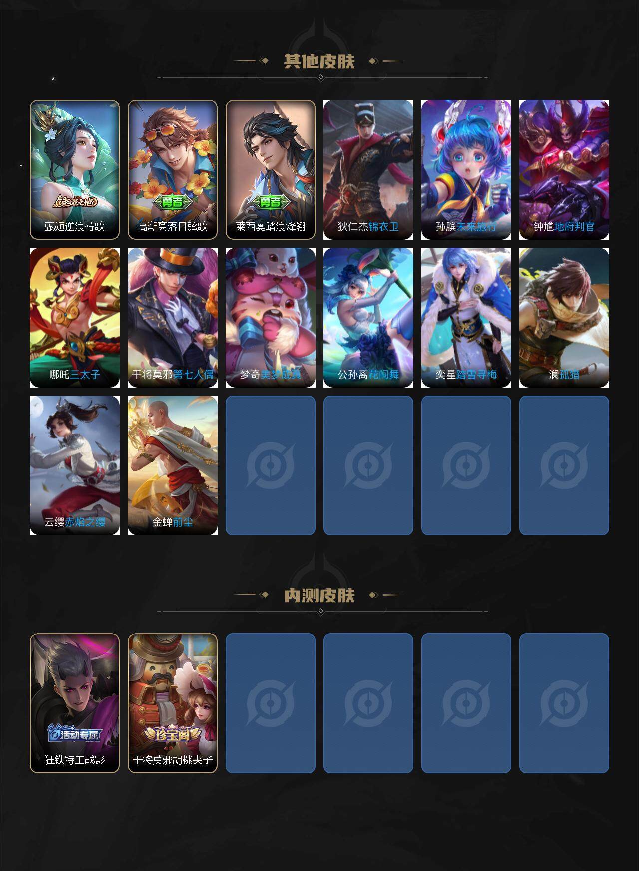 伽罗箭羽风息,阿轲节奏热浪,露娜紫霞仙子,吕布末日机甲,刘禅绅士熊喵,刘禅天才门将,安琪拉心灵骇客,程咬金功夫厨神,刘邦德古拉伯爵,兰陵王暗隐猎兽者,曹操幽灵船长,宫本武藏鬼剑武藏,蔡文姬舞动绿茵,廉颇地狱岩魂,花木兰水晶猎龙者,墨子金属风暴,百里守约特工魅影,嫦娥拒霜思,刘备百相守梦,蒙犽百解令