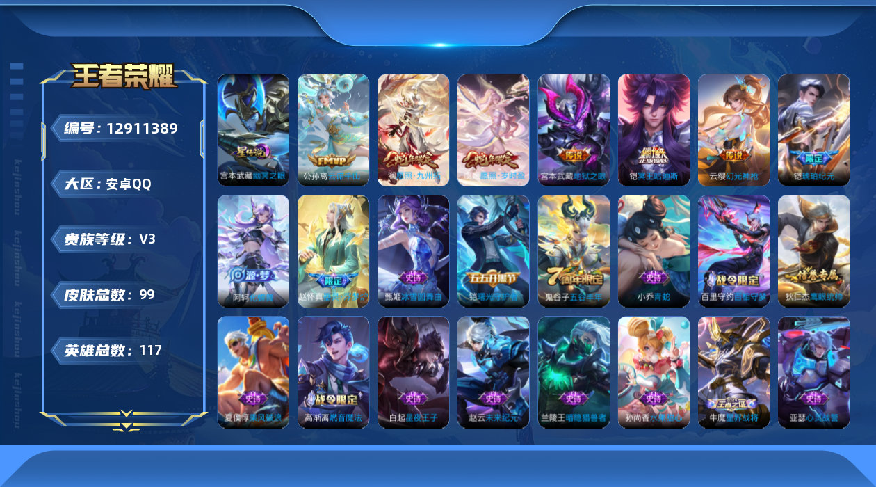 [12911389]【特价急出/详情看图/w战省标影】:安卓Q-V3-永恒钻石IV段位-116英雄-99皮肤--1星元7传说-24史诗