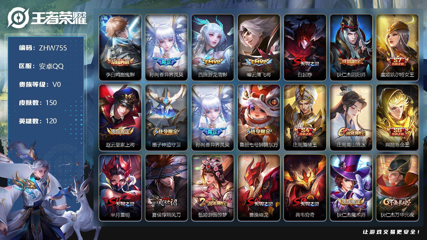 [12911397]【特价急出/详情看图】:安卓Q-V0-永恒钻石I段位-120英雄-150皮肤-1典藏-3传说-38史诗 【荣耀典藏】:李白鸣剑曳影 【传说皮肤】:孙尚香异界灵契,西施游龙清影,曜云鹰飞将 【限定皮肤】:白起狰,狄仁杰阴阳师,虞姬凯尔特女王,赵云皇家上将,墨子神迹守卫,孙尚香异界灵契,鲁班七号狮舞东方,庄周蜃楼王,庄周高山流水,扁鹊炼金王,芈月重明,夏侯惇朔风刀,甄姬游园惊梦,曹操烛龙,典韦穷奇,狄仁杰魔术师,狄仁杰万华元夜,达摩沙漠行僧,项羽海滩派对,老夫子醍醐杖,老夫子航海奇遇记,程咬金演武夺筹,露娜一生所爱,兰陵王金庭之子,牛魔御旌,后羿圣弓游侠,钟馗神迹守卫,钟馗驱傩正仪,干将莫邪真爱魔法,太乙真人饕餮,鬼谷子原初探秘者,苏烈千军破阵,百里守约朱雀志,弈星混沌棋,沈梦溪大漠名商,明世隐疑决卦,裴擒虎天狼狩猎者,裴擒虎李小龙,裴擒虎擒涛扼浪,狂铁御狮,米莱狄御霄,盾山御銮,猪八戒猪悟能,上官婉儿梁祝,鲁班大师探海日志,桑启海盐诗旅,艾琳女武神,张良古海寻踪,刘邦剑破天穹,程咬金群星魔术团 【年限皮肤】:百里守约朱雀志 【赛季限定】:庄周蜃楼王,扁鹊炼金王,白起狰,芈月重明,夏侯惇朔风刀,曹操烛龙,典韦穷奇,狄仁杰万华元夜,达摩沙漠行僧,老夫子醍醐杖,程咬金演武夺筹,兰陵王金庭之子,张良古海寻踪,牛魔御旌,虞姬凯尔特女王,钟馗驱傩正仪,太乙真人饕餮,鬼谷子原初探秘者,苏烈千军破阵,弈星混沌棋,沈梦溪大漠名商,明世隐疑决卦,裴擒虎擒涛扼浪,狂铁御狮,米莱狄御霄,盾山御銮,鲁班大师探海日志,桑启海盐诗旅,刘邦剑破天穹 【战令限定】:墨子神迹守卫,鲁班七号狮舞东方,老夫子航海奇遇记,后羿圣弓游侠,钟馗神迹守卫,干将莫邪真爱魔法 【史诗皮肤】:露娜紫霞仙子,赵云皇家上将,貂蝉圣诞恋歌,狄仁杰魔术师,廉颇地狱岩魂,宫本武藏鬼剑武藏,孙尚香水果甜心,妲己魅力维加斯,妲己女仆咖啡,墨子金属风暴,刘禅绅士熊喵,曹操幽灵船长,李白千年之狐,刘邦德古拉伯爵,小乔缤纷独角兽,甄姬游园惊梦,雅典娜冰冠公主,安琪拉心灵骇客,蔡文姬舞动绿茵,刘禅天才门将,百里守约朱雀志,露娜一生所爱,裴擒虎天狼狩猎者,鲁班七号狮舞东方,狄仁杰鹰眼统帅,公孙离无限星赏官,上官婉儿梁祝,娜可露露晚萤,橘右京修罗,瑶遇见神鹿,裴擒虎李小龙,老夫子航海奇遇记,干将莫邪真爱魔法,沈梦溪月团寄思,安琪拉时之奇旅,猪八
