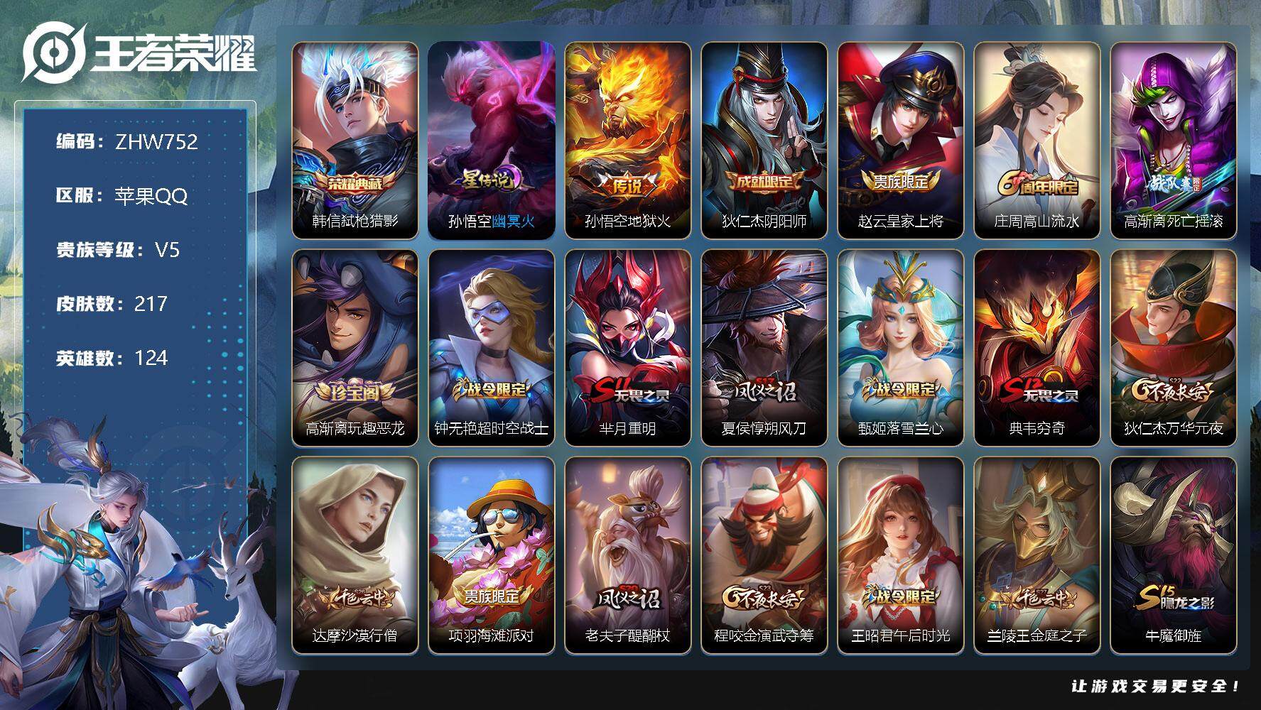 [12911425]苹果Q-V5-永恒钻石III段位-124英雄-217皮肤-1典藏-1星传说-1传说-52史诗