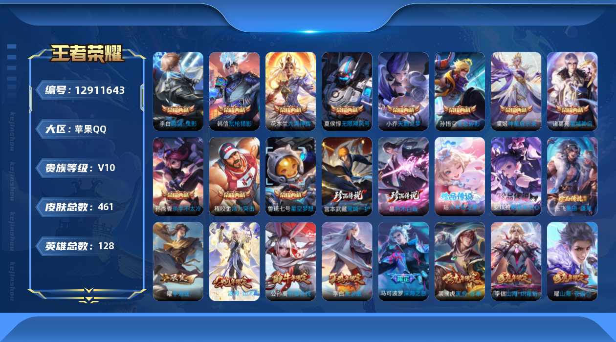 [12911643]苹果Q-V10-最强王者段位-126英雄-460皮肤-11典藏-0珍品无双-0无双-5珍品传说-58传说-152史诗