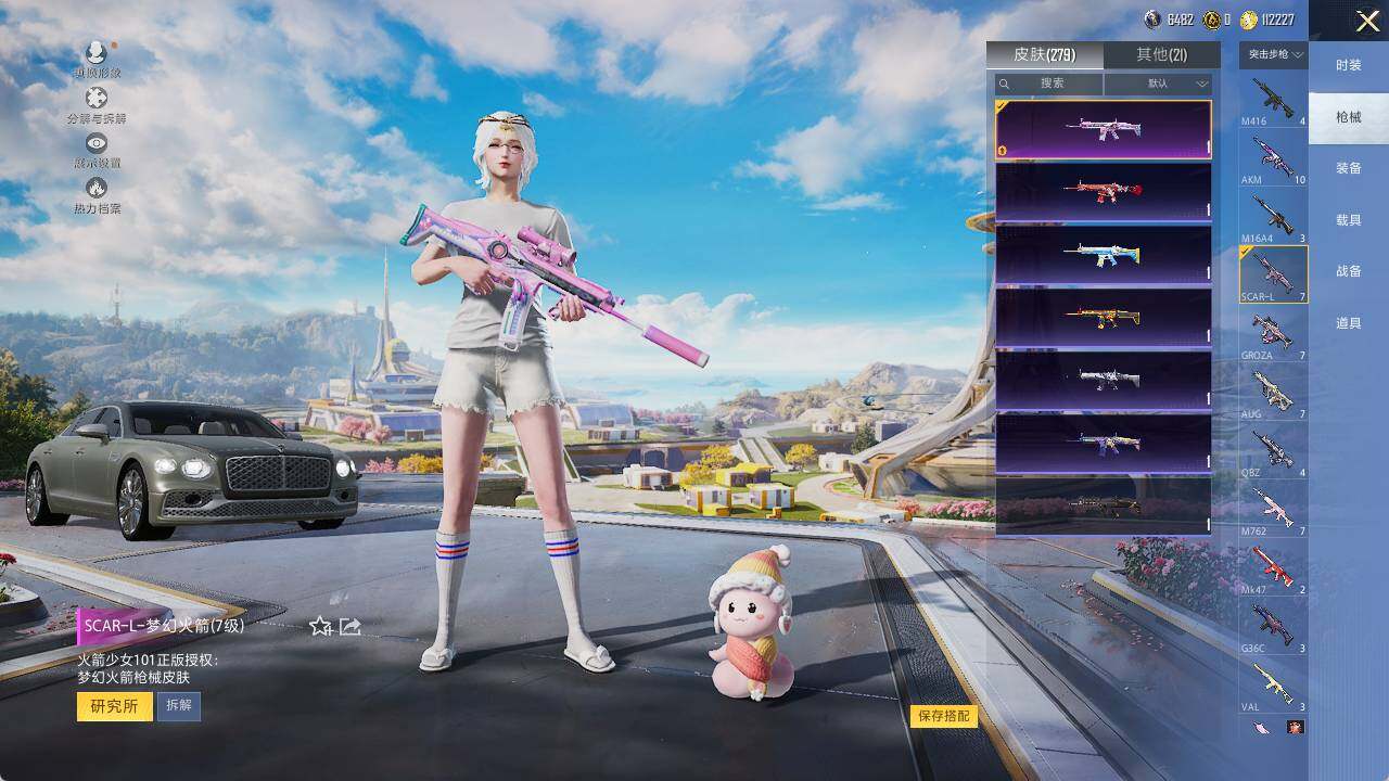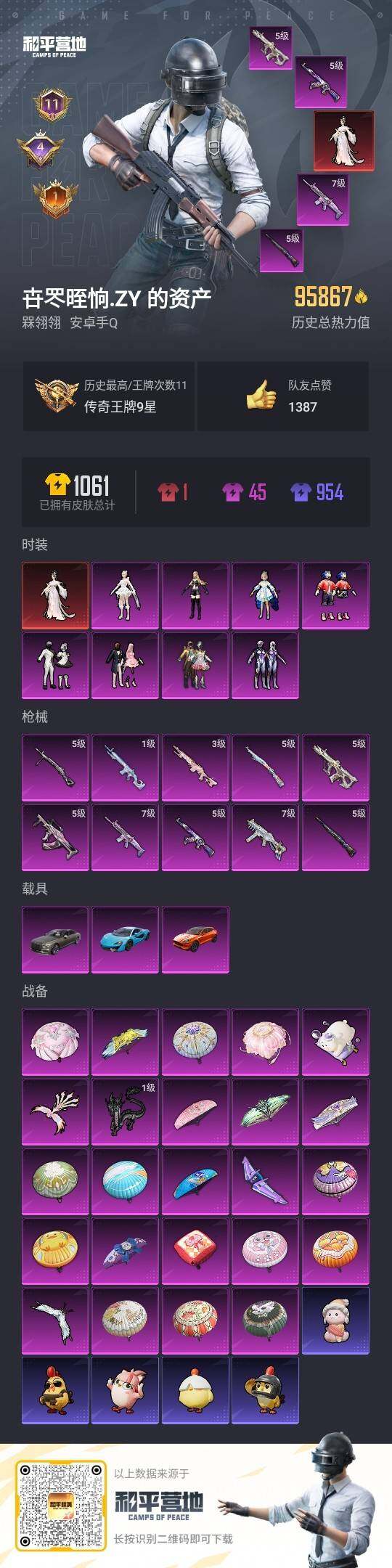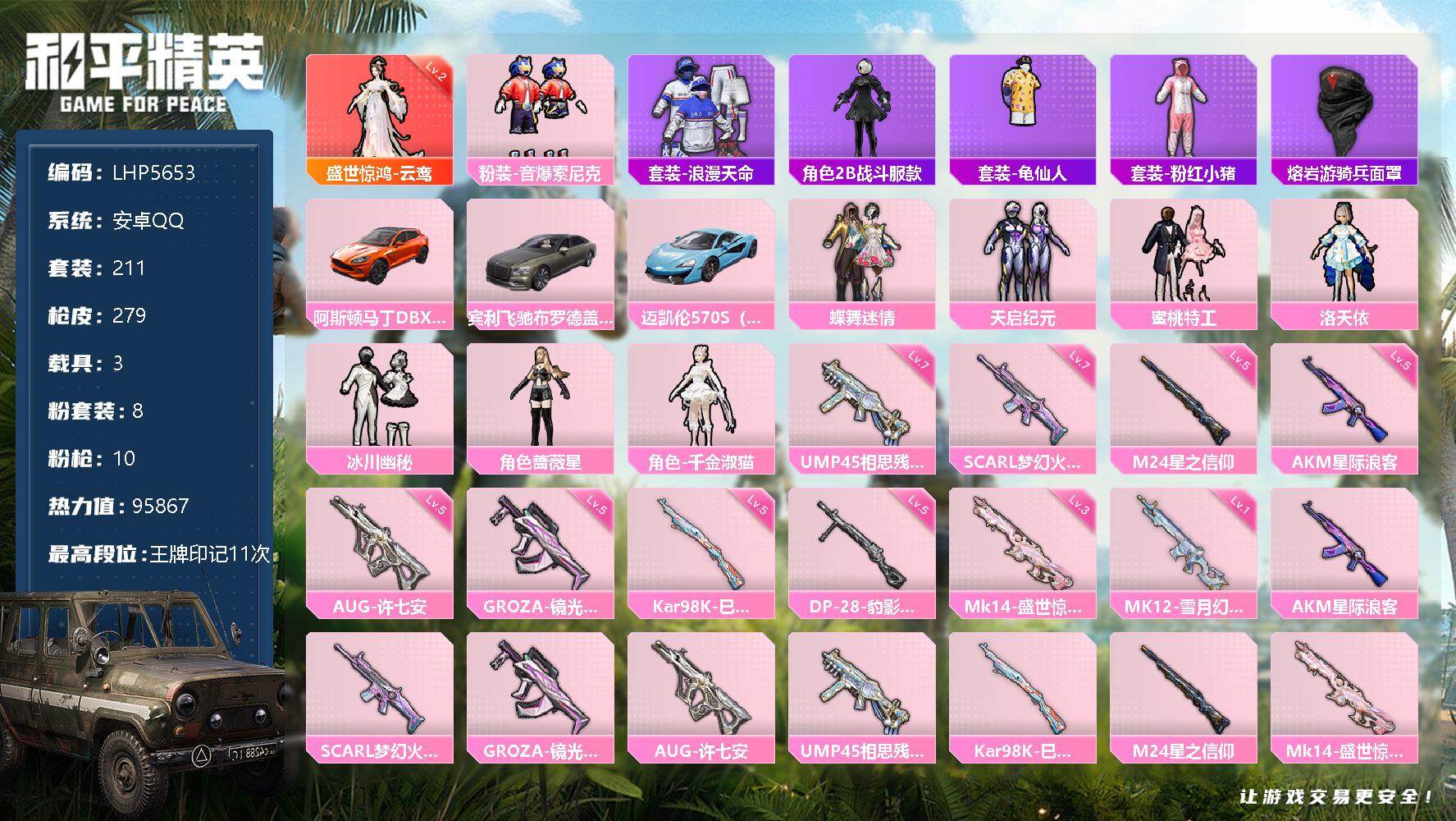 [12911779]素材身法号/地铁满天赋 安卓 手Q-1神装-8粉装-10特效枪-3载具-5粉色飞行器-9.5w热力值-11王牌印记-211套装-279枪皮【红色神装等级】:盛世惊鸿-云鸾(二级)【热门品类】:粉装-音爆索尼克,套装-浪漫天命,角色-2B战斗服款,套装-龟仙人,套装-粉红小猪,熔岩游骑兵面罩【粉色载具】:阿斯顿马丁DBX(橙),宾利飞驰(布罗德盖棕双色),迈凯伦570S(天际蓝)【粉色套装】:粉装-蝶舞迷情,粉装-天启纪元,粉装-蜜桃特工,角色-洛天依,粉装-冰川幽秘,粉装-音爆索尼克,角色-蔷薇星,角色-千金淑猫【粉色枪皮等级】:AKM-星际浪客(五级),SCAR-L-梦幻火箭(七级),GROZA-镜光银凌(五级),AUG-许七安(五级),UMP45-相思残雪(七级),Kar98K-巳巳如意(五级),M24-星之信仰(五级),Mk14-盛世惊鸿(三级),MK12-雪月幻音(一级),DP-28-豹影疾电(五级)【粉色飞行器】:酣梦熊熊飞行器,梦幻火箭飞行器,天之羽翼飞行器,龙翔九天飞行器,凤舞九天飞行器