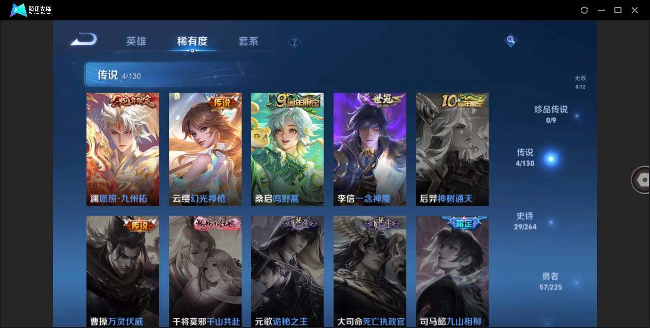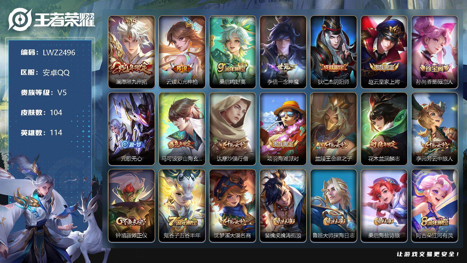 [12911748]安卓Q-V5-至尊星耀V段位-114英雄-104皮肤-4传说-29史诗 【传说皮肤】:澜愿照九州拓,云缨幻光神枪,桑启鸣野蒿,李信一念神魔 【限定皮肤】:狄仁杰阴阳师,赵云皇家上将,孙尚香蔷薇恋人,元歌无心,马可波罗山海玄木吟,达摩沙漠行僧,项羽海滩派对,兰陵王金庭之子,花木兰瑞麟志,李元芳云中旅人,钟馗驱傩正仪,鬼谷子五谷丰年,沈梦溪大漠名商,裴擒虎擒涛扼浪,鲁班大师探海日志,桑启海盐诗旅,阿古朵江河有灵,张良古海寻踪,蒙犽百解令,鬼谷子天穹祈灯 【年限皮肤】:花木兰瑞麟志,马可波罗山海玄木吟 【赛季限定】:达摩沙漠行僧,兰陵王金庭之子,张良古海寻踪,李元芳云中旅人,钟馗驱傩正仪,沈梦溪大漠名商,裴擒虎擒涛扼浪,鲁班大师探海日志,桑启海盐诗旅,鬼谷子天穹祈灯,狄仁杰万华元夜 【史诗皮肤】:露娜紫霞仙子,赵云皇家上将,甄姬冰雪圆舞曲,宫本武藏鬼剑武藏,孙尚香蔷薇恋人,孙尚香水果甜心,嬴政摇滚巨星,妲己魅力维加斯,曹操幽灵船长,吕布末日机甲,花木兰水晶猎龙者,刘邦德古拉伯爵,兰陵王暗隐猎兽者,安琪拉心灵骇客,百里守约特工魅影,铠曙光守护者,孙策猫狗日记,花木兰瑞麟志,狄仁杰鹰眼统帅,鬼谷子五谷丰年,元歌无心,马可波罗山海玄木吟,阿古朵江河有灵,蒙犽百解令,大司命东方月初,阿轲化蝶舞,后羿石田雨龙,黄忠百相守梦,公孙离涂山容容 【其他皮肤】:项羽海滩派对,韩信街头霸王,露娜哥特玫瑰,达摩大发明家,赵云忍炎影,白起白色死神,扁鹊化身博士,宫本武藏未来纪元,安琪拉玩偶对对碰,孙膑天使之翼,妲己少女阿狸,典韦黄金武士,亚瑟死亡骑士,刘备万事如意,宫本武藏万象初新,后羿阿尔法小队,狄仁杰阴阳师,刘备纽约教父,李元芳黑猫爱糖果,关羽龙腾万里,墨子进击墨子号,鬼谷子幻乐之宴,苏烈坚韧之力,盾山圆桌骑士,刘禅秘密基地,钟馗驱傩正仪,鲁班大师乓乓大师,达摩沙漠行僧,刘邦虎啸剑宗,兰陵王金庭之子,沈梦溪大漠名商,蒙犽胡桃狂想曲,蒙恬蔚蓝守将,李元芳云中旅人,刘备潮玩造梦师,桑启海盐诗旅,海月幻泉雾影,牛魔牛运亨通,白起乐园追猎者,赵怀真太极少年,裴擒虎擒涛扼浪,鲁班大师探海日志,李元芳妄想特派,张良古海寻踪,后羿完美运算,鬼谷子天穹祈灯,东皇太一金福满堂,达摩爆裂喵拳,戈娅玫蓝誓约,钟馗虚灵犬护,苏烈春野闲踪,白起死霸装,甄姬逆浪荇歌,莱西奥踏浪烽翎,鬼谷子克喵,哪吒罗小黑战记,亚瑟荣