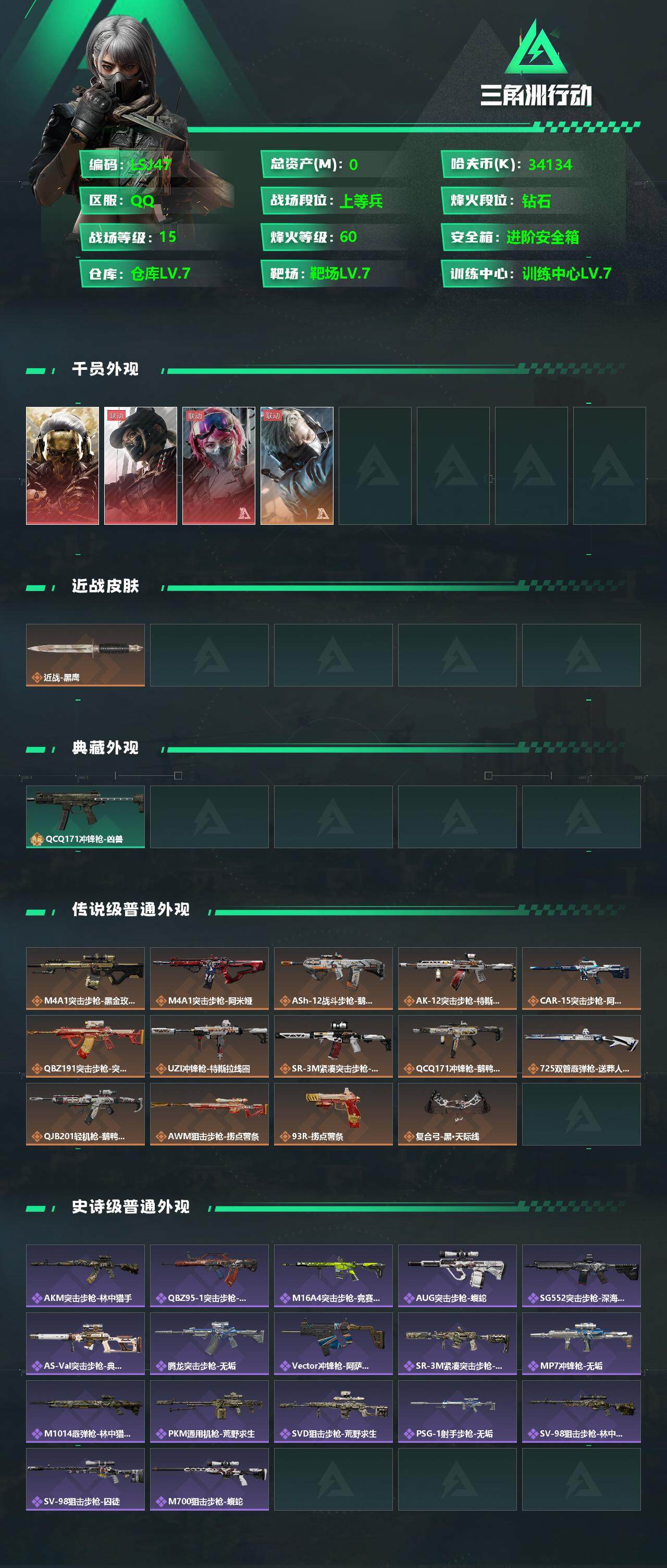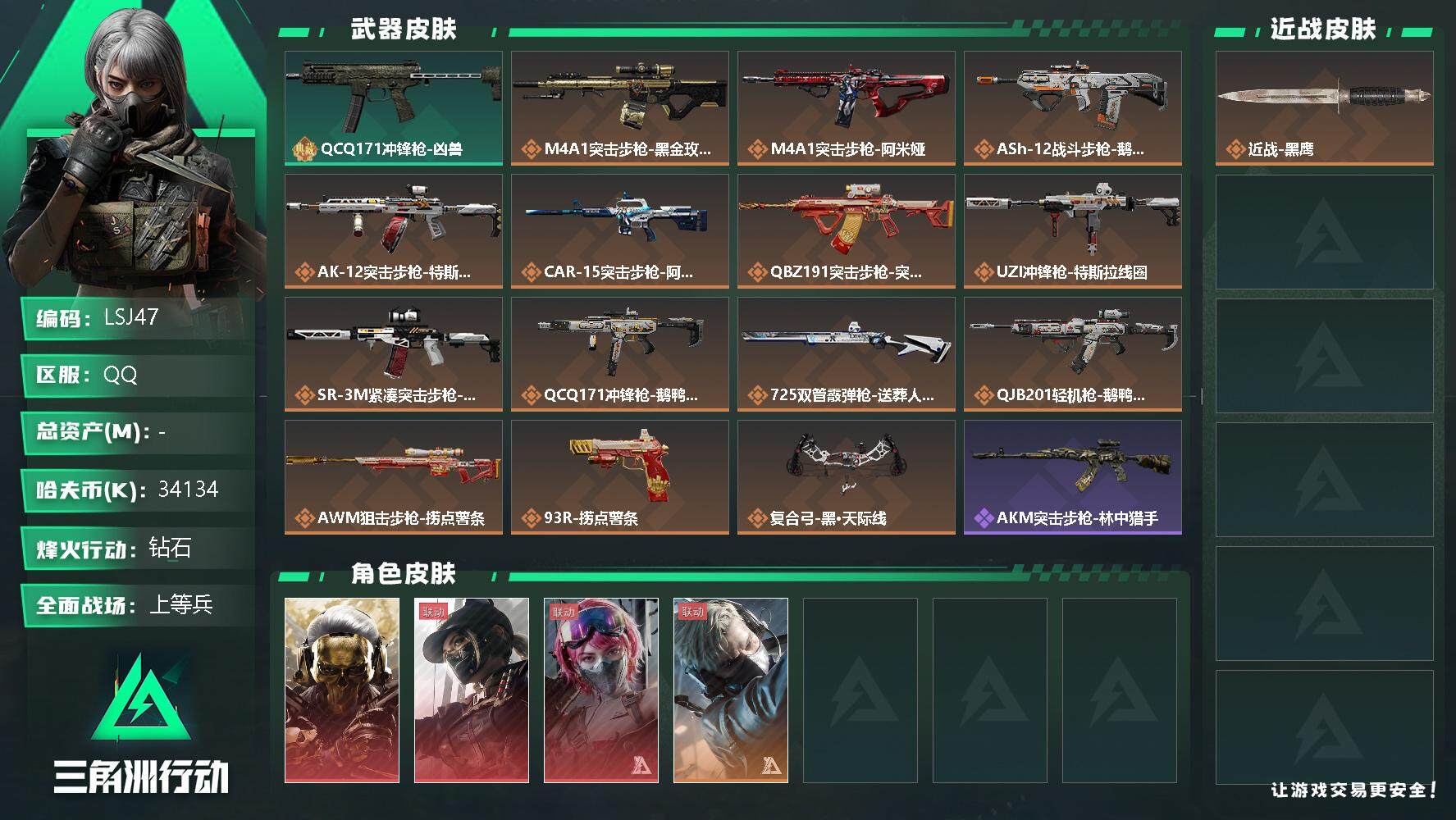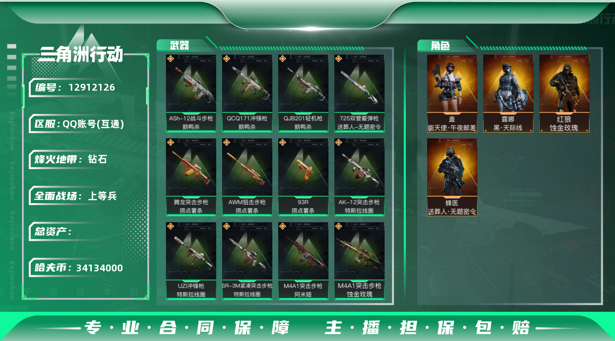 [12912126]34134k哈伏币-148m流动资产-60烽火等级-钻石-15战场等级-上等兵 【干员外观】:红狼-蚀金玫瑰,露娜-黑·天际线,蛊-能天使午夜邮差,蜂医-送葬人·无题密令 【近战皮肤】:近战-黑鹰 【典藏外观】:QCQ171冲锋枪-凶兽 【传说级普通外观】:M4A1突击步枪-蚀金玫瑰,M4A1突击步枪-阿米娅,ASh-12战斗步枪-鹅鸭杀,AK-12突击步枪-特斯拉线圈,CAR-15突击步枪-阿米娅,腾龙突击步枪-捞点薯条,UZI冲锋枪-特斯拉线圈,SR-3M紧凑突击步枪-特斯拉线圈,QCQ171冲锋枪-鹅鸭杀,725双管霰弹枪-送葬人-无题密令,QJB201轻机枪-鹅鸭杀,AWM狙击步枪-捞点薯条,93R-捞点薯条,复合弓-黑·天际线 【史诗级普通外观】:AKM突击步枪-林中猎手,QBZ95-1突击步枪-曙光,M16A4突击步枪-竞赛选手,AUG突击步枪-蝮蛇,SG552突击步枪-深海恐惧,AS Val突击步枪-典狱官,腾龙突击步枪-无垢,Vector冲锋枪-阿萨拉文明,SR-3M紧凑突击步枪-荒野求生,MP7冲锋枪-无垢,M1014霰弹枪-林中猎手,PKM通用机枪-荒野求生,SVD狙击步枪-荒野求生,PSG-1射手步枪-无垢,SV-98狙击步枪-林中猎手,SV-98狙击步枪-囚徒,M700狙击步枪-蝮蛇 【稀有级普通外观】:K416突击步枪-虎啸,SCAR-H战斗步枪-荣耀列队,PTR-32突击步枪-天网,PTR-32突击步枪-英雄,腾龙突击步枪-雪崩,K437突击步枪-天狼星,MP5冲锋枪-弄臣,MP5冲锋枪-虎啸,P90冲锋枪-新生,Vector冲锋枪-先锋,SMG-45-行动开启,SMG-45冲锋枪-幻影结构,SMG-45冲锋枪-天网,SR-3M紧凑突击步枪-雪崩,M1014霰弹枪-幻影结构,M250通用机枪-虎啸,M250通用机枪-天网,Mini-14射手步枪-荣耀列队,SKS射手步枪-弄臣,SKS射手步枪-雪崩,SR-25射手步枪-开拓,SR-9射手步枪-街头涂鸦,SV-98狙击步枪-星链科技,G18-星链科技 【普通级普通外观】:M4A1突击步枪-粉色涂装,M4A1突击步枪-高雅黑,M4A1突击步枪-海色,AKM突击步枪-彩墨喷涂,QBZ95-1突击步枪-高雅黑,QBZ95-1突击步枪-海浪,QBZ95-1突击步枪-海色,QBZ191突击步枪-三角