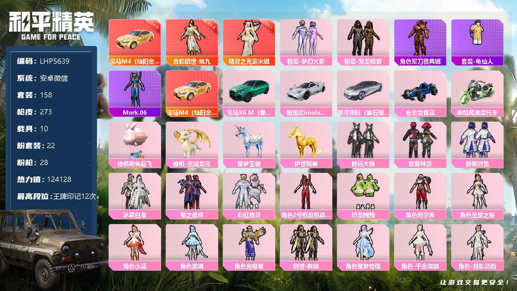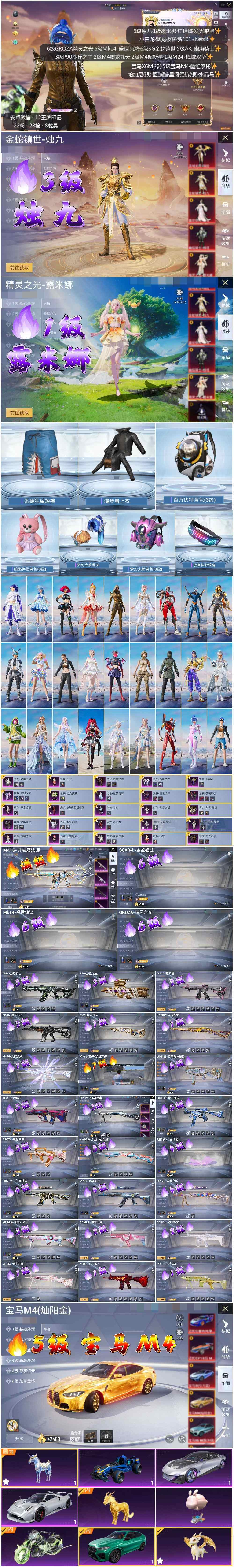[12912090]素材身法号/宝马M4(灿阳金)(五级)/M416-灵猫魔法师(九级) 安卓 微信-2神装-22粉装-28特效枪-10载具-23粉色飞行器-12.4w热力值-12王牌印记-158套装-273枪皮【红色载具】:宝马M4(灿阳金)(五级)【红色神装等级】:金蛇镇世-烛九(三级),精灵之光-露米娜(一级)【热门品类】:粉装-梦幻火箭,粉装-繁龙极客,角色-军刀雅典娜,套装-龟仙人,角色-Mark.06【粉色载具】:宝马M4(灿阳金),宝马X6 M(曼岛绿),帕加尼imola(艺术银),星河领航(磐石银),合金龙骨(蓝),幽焰风驰摩托车,僚机-萌兔起飞,僚机-圣域龙宝,星梦玉骢,护世瑞兽【粉色套装】:粉装-数码大师,粉装-梦幻火箭,粉装-放客神游,粉装-新星烈龙,粉装-冰霜白皇,粉装-星之彼岸,粉装-彩虹鹿灵,角色-2号机款机体服,粉装-恐龙拽拽,角色-阿尔茜,角色-圣堂之誓,粉装-繁龙极客,角色-小蓝,角色-美琪,角色-光极星,套装-创世·救赎,角色-星梦奇缘,角色-千金淑猫,角色-月影灵韵,角色-女娲灵识,角色-智耀战神,角色-绯穹魔姬【粉色枪皮等级】:AKM-幽焰骑士(五级),SCAR-L-甜梦小狐(二级),SCAR-L-纯梦嫁纱(二级),SCAR-L-金蛇镇世(六级),M416-风花雪月(一级),M416-超新星(二级),M416-墨龙九天(二级),M416-女娲灵识(一级),M416-灵猫魔法师(九级),GROZA-焦糖拿铁(五级),GROZA-精灵之光(六级),AUG-星之彼岸(五级),M762-激战未来(四级),UMP45-相思残雪(六级),UMP45-量子极限(五级),AKS-74U-信仰神谕(四级),P90-沙丘之主(三级),Kar98K-巳巳如意(五级),Kar98K-圣域龙灵(一级),M24-镜域双华(一级),Mk14-精灵梦叶罗丽(三级),Mk14-盛世惊鸿(六级),DP-28-圣堂之誓(四级),DP-28-千金淑猫(一级),DP-28-豹影疾电(五级),烟雾弹-丁香清露(四级),破片手榴弹-热量炸弹(七级)【粉色飞行器】:酣梦熊熊飞行器,梦幻火箭飞行器,星之彼岸飞行器,齐天大圣飞行器,变形金刚飞行器,沙丘之主天马,镜域双华-灵镜之阶,电糖天使飞行器,龙翔九天飞行器,深渊漩涡飞行器,曦光华影飞行器,幽焰列车飞行器,脆鲨七海飞行器,凤舞九天飞行器,万象