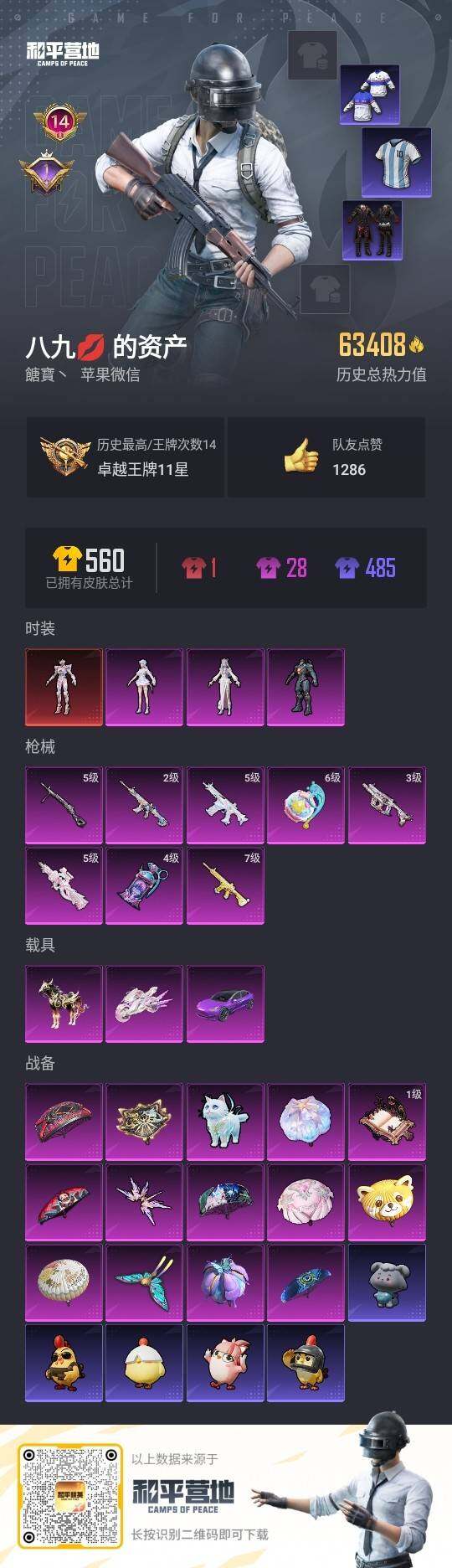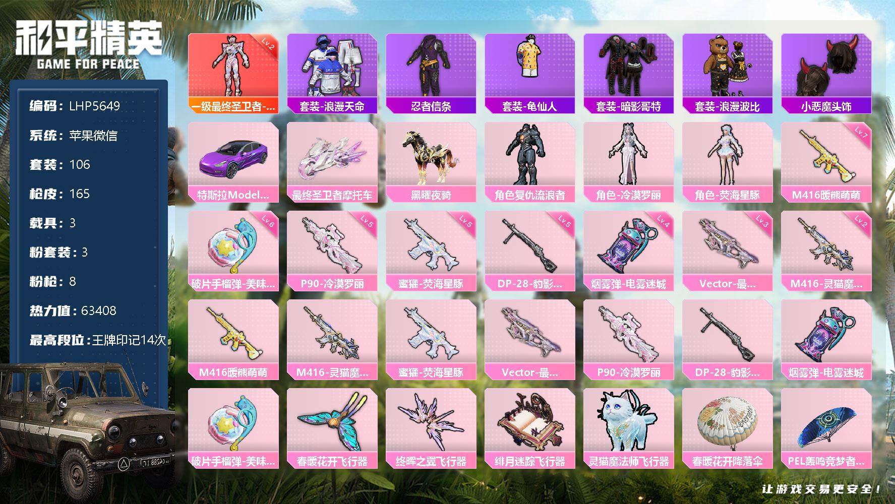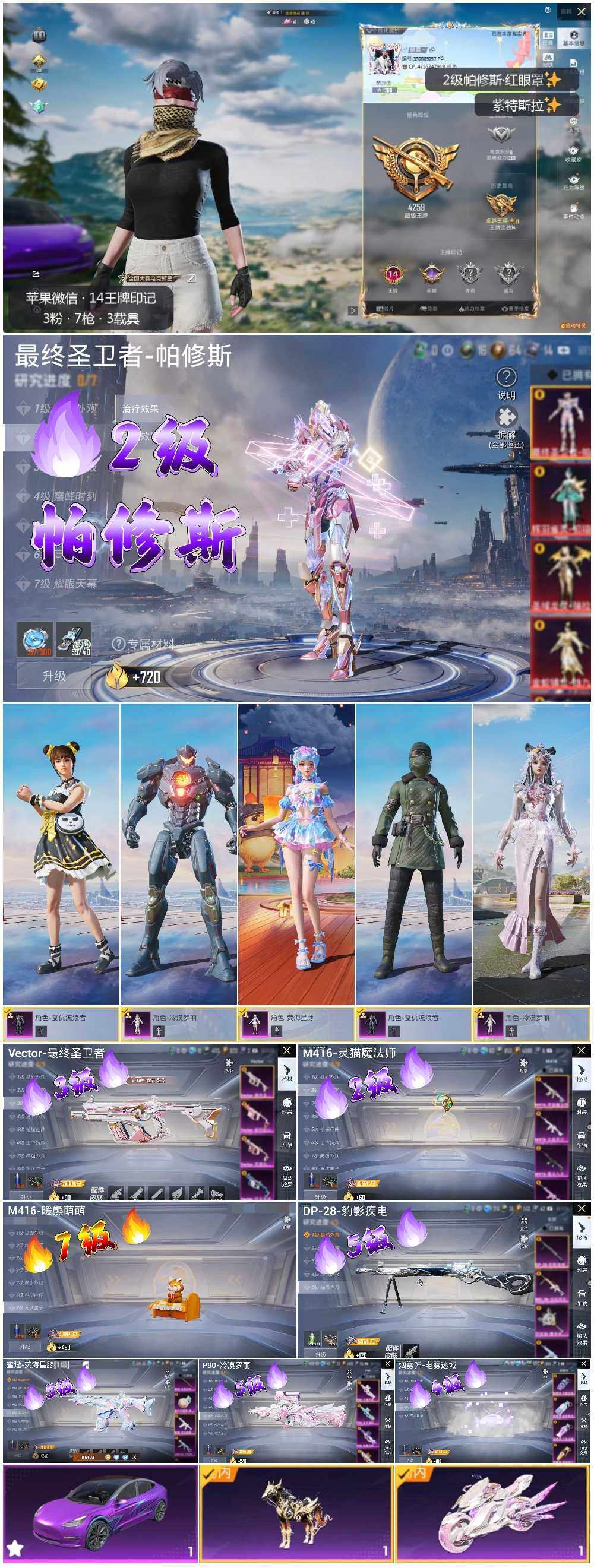 [12912141]素材身法号 苹果 微信-1神装-3粉装-8特效枪-3载具-4粉色飞行器-6.3w热力值-14王牌印记-106套装-165枪皮【红色神装等级】:最终圣卫者-帕修斯(二级)【热门品类】:套装-浪漫天命,套装-忍者信条,套装-龟仙人,套装-暗影哥特,套装-浪漫波比,小恶魔头饰【粉色载具】:特斯拉Model 3(奇幻紫),最终圣卫者摩托车,黑曜夜骑【粉色套装】:角色-复仇流浪者,角色-冷漠罗丽,角色-荧海星豚【粉色枪皮等级】:M416-暖熊萌萌(七级),M416-灵猫魔法师(二级),蜜獾-荧海星豚(五级),Vector-最终圣卫者(三级),P90-冷漠罗丽(五级),DP-28-豹影疾电(五级),烟雾弹-电雾迷城(四级),破片手榴弹-美味星星糖(六级)【粉色飞行器】:春暖花开飞行器,终晖之翼飞行器,绯月迷踪飞行器,灵猫魔法师飞行器