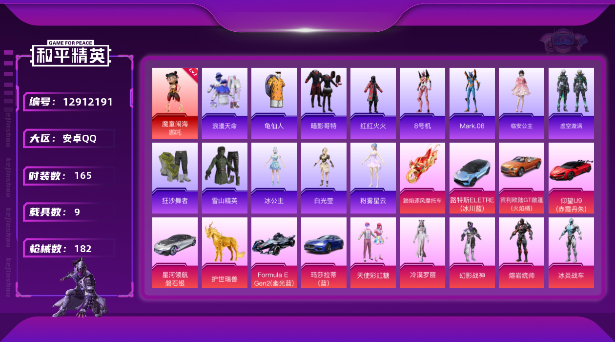 [12912191]素材身法号 安卓 手Q-1神装-10粉装-7特效枪-9载具-5粉色飞行器-7.3w热力值-13王牌印记-165套装-182枪皮【红色神装等级】:魔童闹海-哪吒(一级)【热门品类】:粉装-繁龙极客,套装-浪漫天命,套装-都市猎人,套装-派对舞王,套装-奇异狩猎者,套装-忍者信条,角色-忠真马岱,套装-龟仙人,套装-暗影哥特,套装-红红火火,角色-8号机,角色-Mark.06,大砍刀-青龙偃月刀【粉色载具】:路特斯ELETRE(冰川蓝),玛莎拉蒂Ghibli(蓝),宾利欧陆GT敞篷(火焰橘),仰望U9(赤霞丹朱),星河领航(磐石银),Formula E Gen2(幽光蓝),踏焰逐风摩托车,空客H135-蔚蓝之翼,护世瑞兽【粉色套装】:粉装-幻影战神,粉装-天使彩虹糖,粉装-新星烈龙,粉装-未来歌姬,角色-熔岩统帅,角色-冰炎战车,粉装-繁龙极客,角色-光极星,角色-守护天翼,角色-冷漠罗丽【粉色枪皮等级】:AKM-魔法神域(三级),SCAR-L-时空协奏(三级),SCAR-L-魔童闹海 哪吒(三级),Kar98K-创世·救赎(六级),Kar98K-巳巳如意(五级),DP-28-豹影疾电(五级),MG-36-沧焰双生(五级)【粉色飞行器】:齐天大圣飞行器,繁龙极客飞行器,深渊漩涡飞行器,万象金身飞行器,飞天猪飞行器