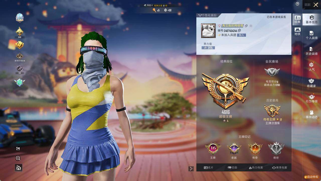 - PX_2093859-实名: 可修改 贵族等级: V5 英雄数: 46 皮肤数: 33 传说皮: 无双飞将,祥瑞亨通 限定皮: 愿照·山河定