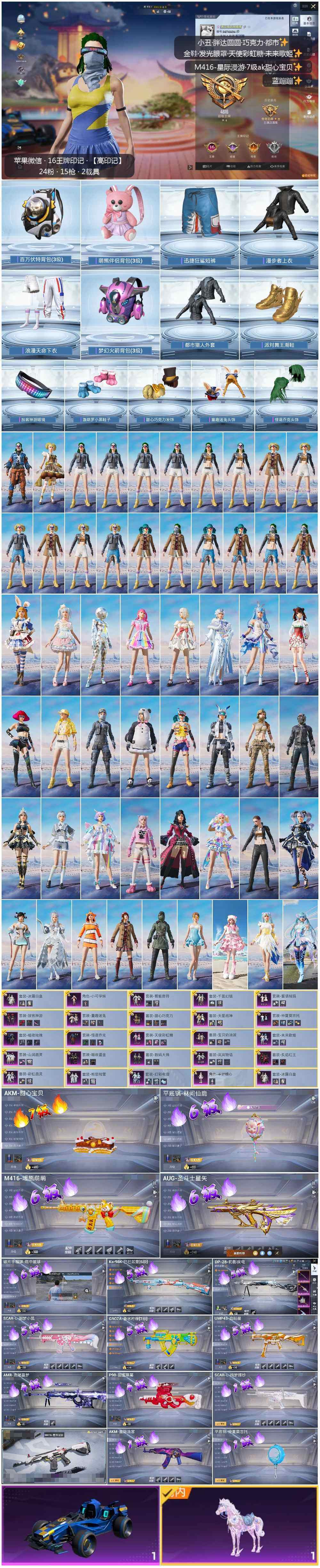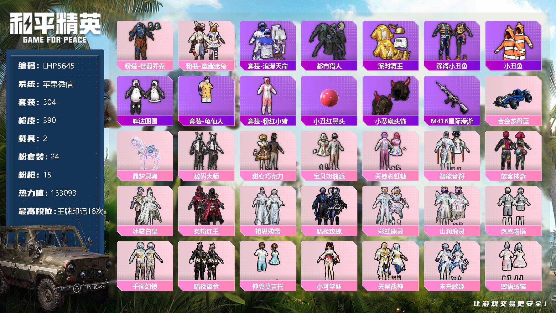 [12912203]素材身法号 苹果 微信-24粉装-15特效枪-2载具-11粉色飞行器-13.3w热力值-16王牌印记-304套装-390枪皮【热门品类】:粉装-怪诞乔克,粉装-童趣迷兔,套装-浪漫天命,套装-都市猎人,套装-派对舞王,套装-深海小丑鱼,套装-小丑鱼,套装-胖达圆圆,套装-龟仙人,套装-粉红小猪,小丑红鼻头,小恶魔头饰,M416-星际漫游【粉色载具】:合金龙骨(蓝),晶梦灵驹【粉色套装】:粉装-数码大师,粉装-怪诞乔克,粉装-甜心巧克力,粉装-宝贝奶油派,粉装-天使彩虹糖,粉装-智能音符,粉装-放客神游,粉装-冰霜白皇,粉装-童趣迷兔,粉装-炙焰红王,粉装-相思残雪,粉装-暗夜玫瑰,粉装-彩虹鹿灵,粉装-山涧鹿灵,粉装-岚岚物语,粉装-千面幻镜,粉装-暗夜鎏金,粉装-仲夏莫吉托,角色-小可学妹,粉装-天星战神,粉装-未来歌姬,粉装-蜜语绒猫,粉装-幻彩电音,角色-羊梦糖心【粉色枪皮等级】:AKM-甜心宝贝(七级),AKM-星际浪客(一级),SCAR-L-甜梦小狐(五级),SCAR-L-纯梦嫁纱(一级),M416-暖熊萌萌(六级),GROZA-香水柠檬(五级),AUG-圣斗士星矢(六级),UMP45-启明星(五级),P90-甜蜜草莓(四级),Kar98K-巳巳如意(五级),AMR-鸢尾晶梦(四级),DP-28-豹影疾电(五级),平底锅-林间仙鹿(六级),平底锅-仲夏莫吉托(一级),破片手榴弹-瓶中星球(六级)【粉色飞行器】:酣梦熊熊飞行器,相思残雪飞行器,千面幻镜飞行器,歌者泠鸢飞行器,祥瑞锦鲤飞行器,镜域双华-灵镜之阶,龙翔九天飞行器,晶梦幻蝶飞行器,终晖之翼飞行器
