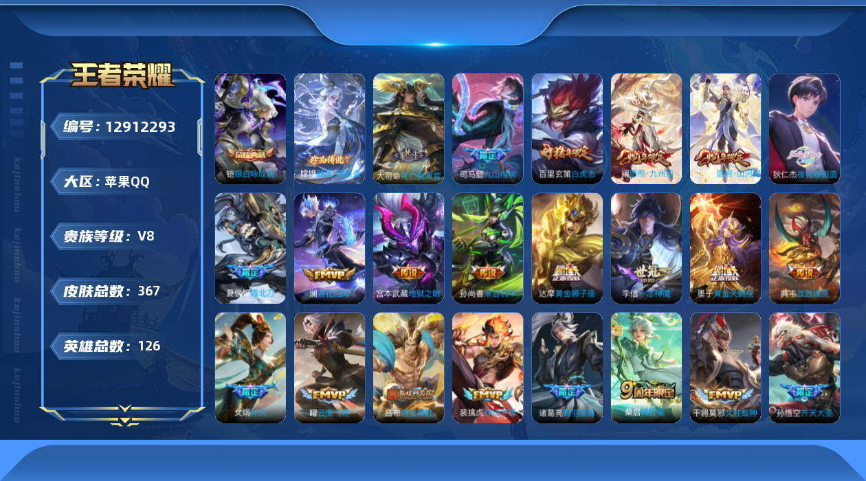 [12912293]苹果Q-V8-至尊星耀III段位-126英雄-367皮肤-1典藏-1珍品传说-45传说-107史诗