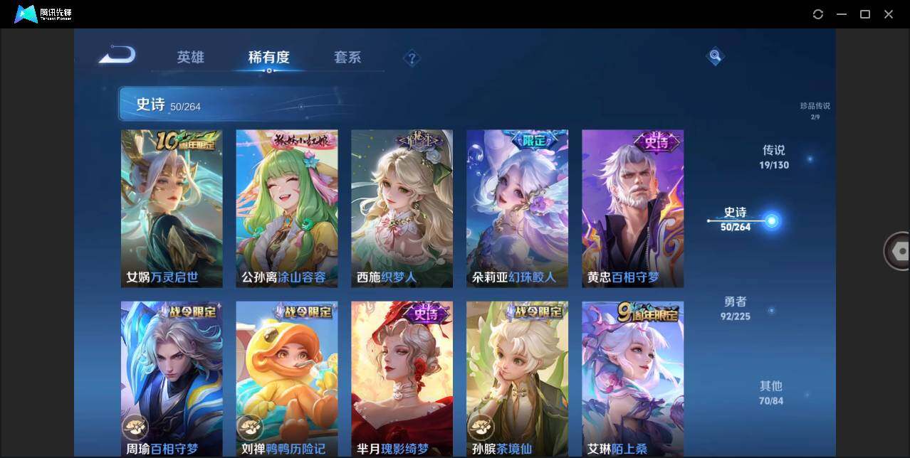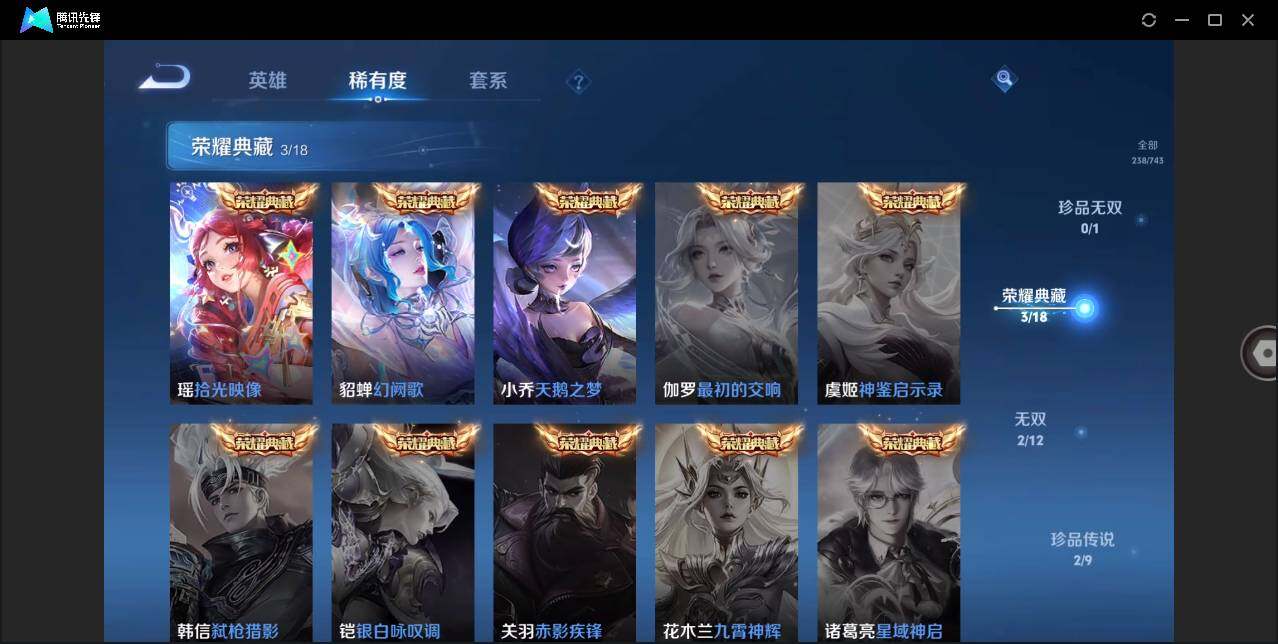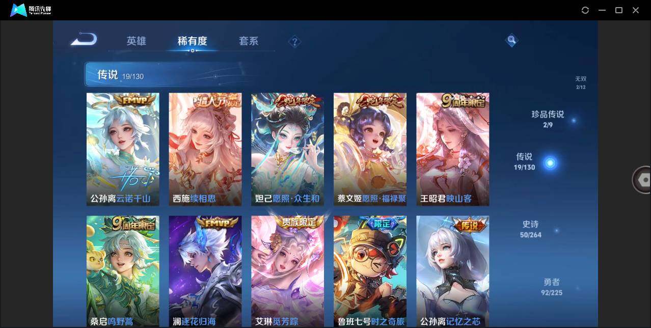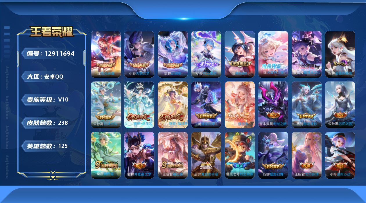 [12911694]安卓Q-V10-最强王者段位-125英雄-238皮肤-3典藏-2无双-2珍品传说-19传说-50史诗