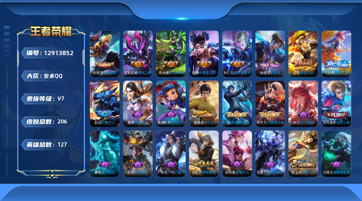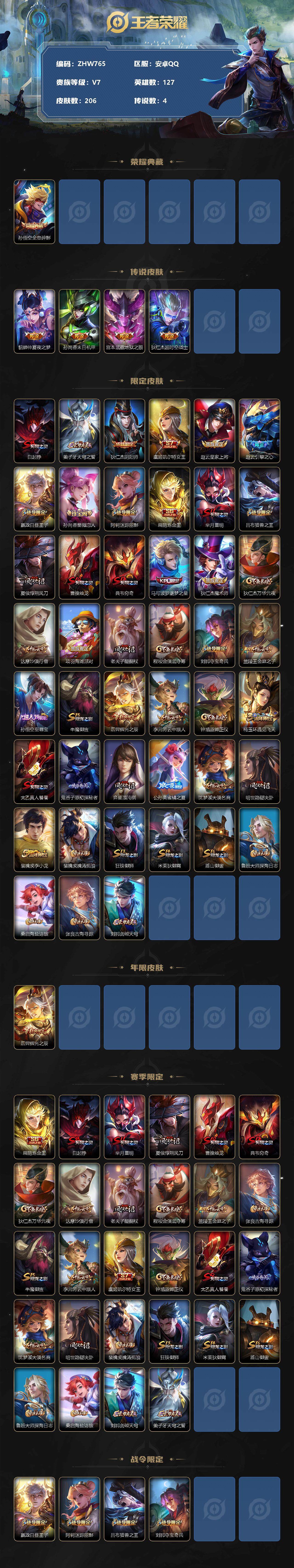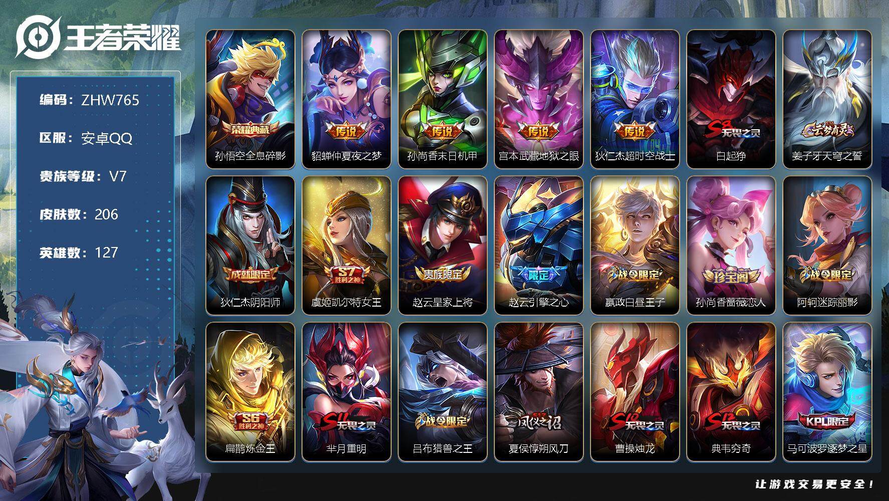 [12913852]亏本急出!安卓Q-V7-荣耀黄金III段位-127英雄-206皮肤-1典藏-0珍品无双-0无双-0珍品传说-4传说-38史诗
