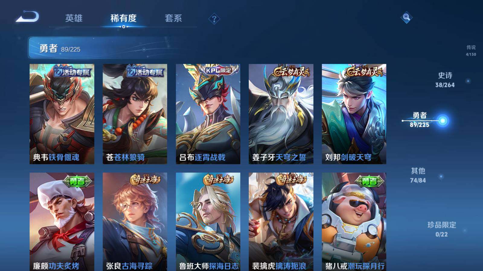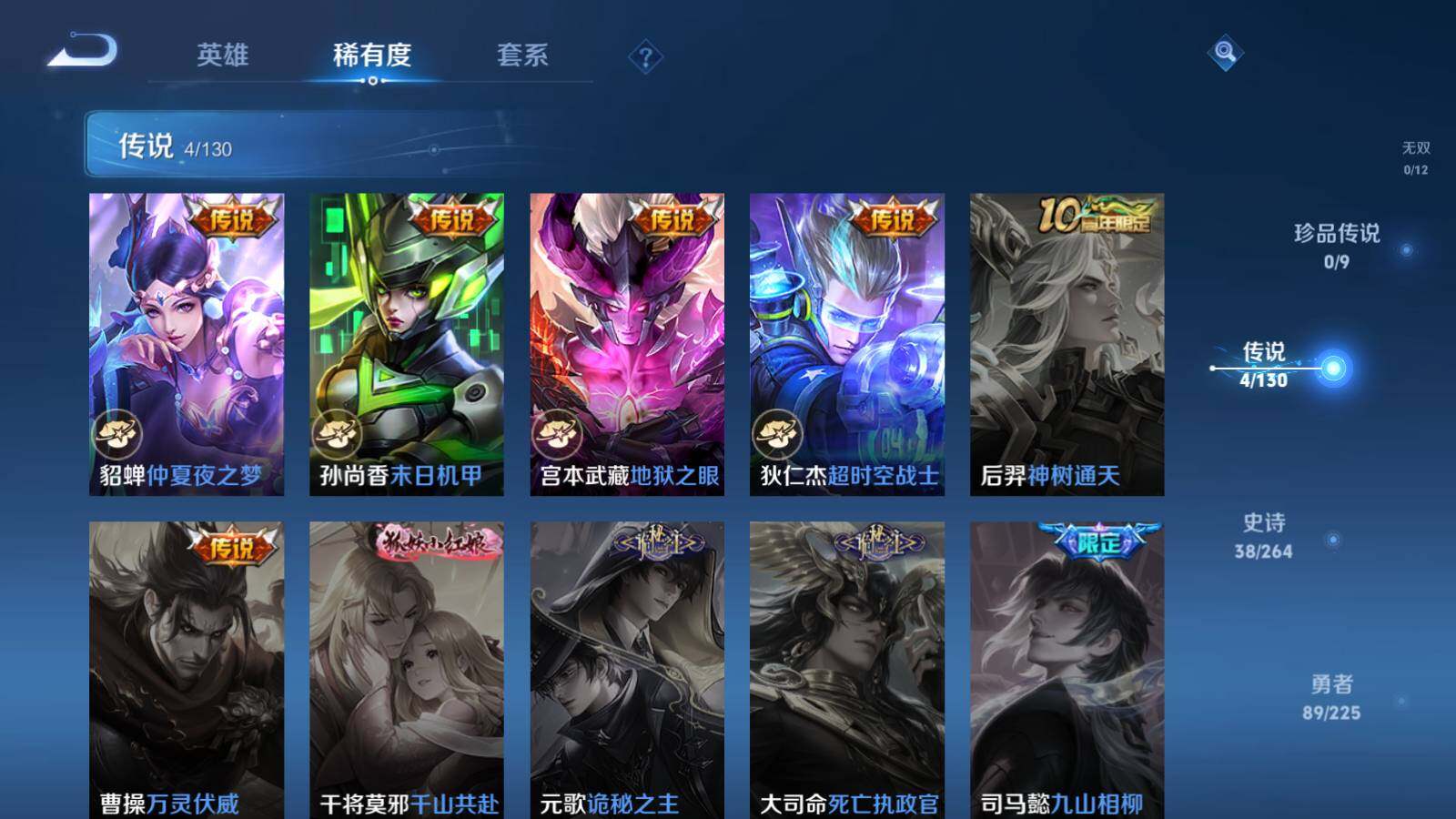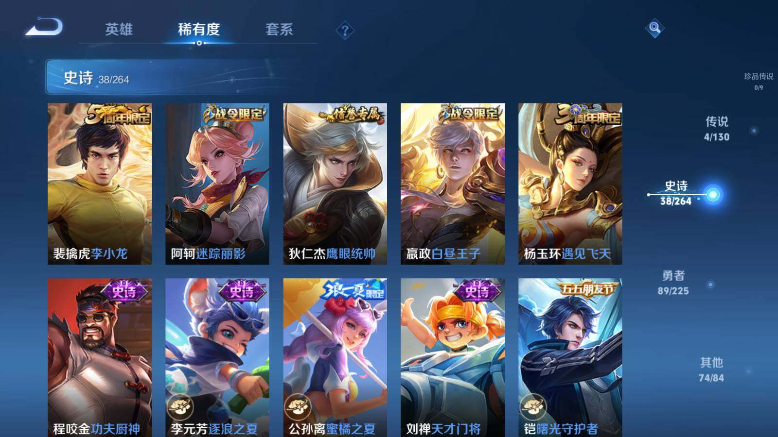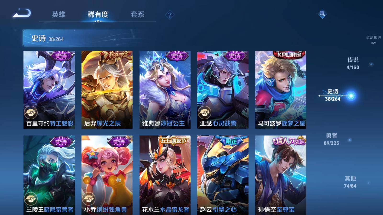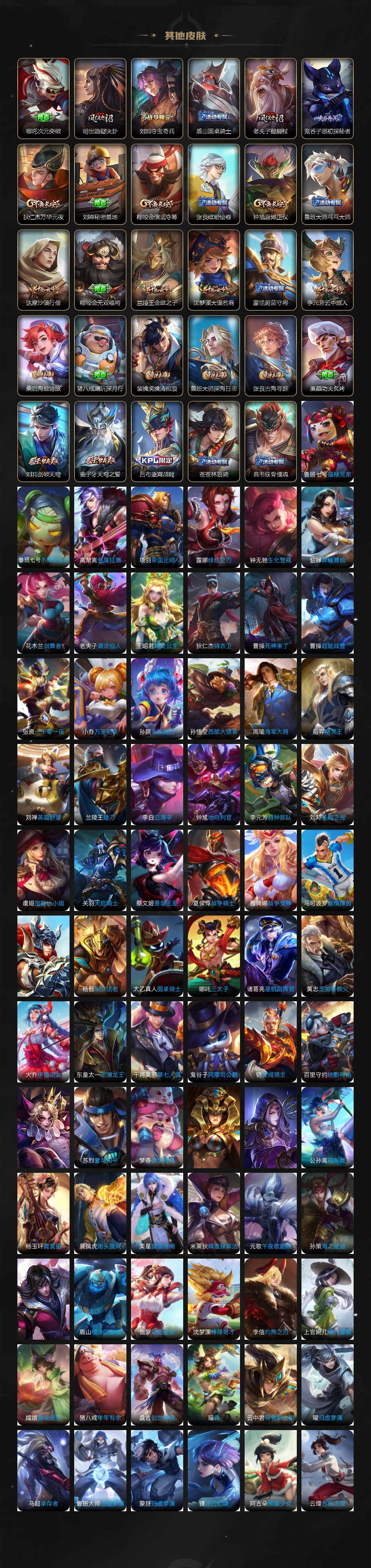 【限定皮肤】:白起狰,姜子牙天穹之誓,狄仁杰阴阳师,虞姬凯尔特女王,赵云皇家上将,赵云引擎之心,嬴政白昼王子,孙尚香蔷薇恋人,阿轲迷踪丽影,扁鹊炼金王,芈月重明,吕布猎兽之王,夏侯惇朔风刀,曹操烛龙,典韦穷奇,马可波罗逐梦之星,狄仁杰魔术师,狄仁杰万华元夜,达摩沙漠行僧,项羽海滩派对,老夫子醍醐杖,程咬金演武夺筹,刘邦夺宝奇兵,兰陵王金庭之子,孙悟空至尊宝,牛魔御旌,后羿辉光之辰,李元芳云中旅人,钟馗驱傩正仪,杨玉环遇见飞天,太乙真人饕餮,鬼谷子原初探秘者,弈星混沌棋,公孙离蜜橘之夏,沈梦溪大漠名商,明世隐疑决卦,裴擒虎李小龙,裴擒虎擒涛扼浪,狂铁御狮,米莱狄御霄,盾山御銮,鲁班大师探海日志,桑启海盐诗旅,张良古海寻踪,刘邦剑破天穹