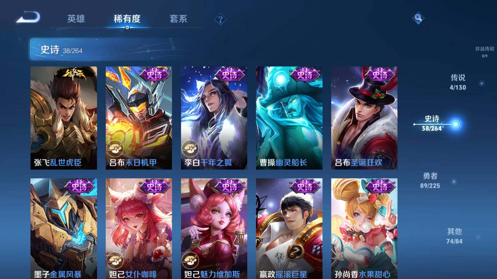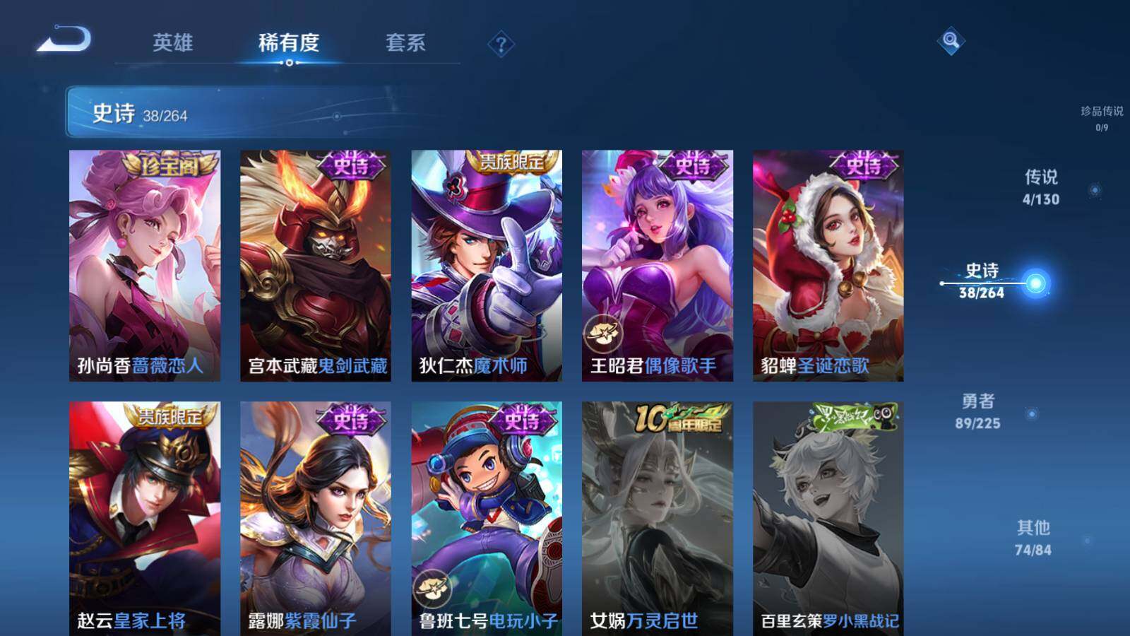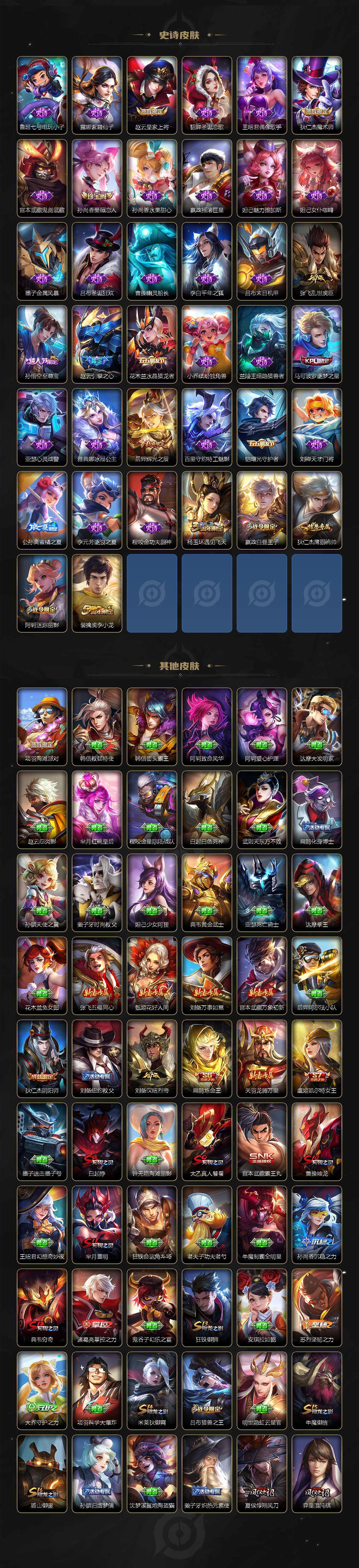 【史诗皮肤】:鲁班七号电玩小子,露娜紫霞仙子,赵云皇家上将,貂蝉圣诞恋歌,王昭君偶像歌手,狄仁杰魔术师,宫本武藏鬼剑武藏,孙尚香蔷薇恋人,孙尚香水果甜心,嬴政摇滚巨星,妲己魅力维加斯,妲己女仆咖啡,墨子金属风暴,吕布圣诞狂欢,曹操幽灵船长,李白千年之狐,吕布末日机甲,张飞乱世虎臣,孙悟空至尊宝,赵云引擎之心,花木兰水晶猎龙者,小乔缤纷独角兽,兰陵王暗隐猎兽者,马可波罗逐梦之星,亚瑟心灵战警,雅典娜冰冠公主,后羿辉光之辰,百里守约特工魅影,铠曙光守护者,刘禅天才门将,公孙离蜜橘之夏,李元芳逐浪之夏,程咬金功夫厨神,杨玉环遇见飞天,嬴政白昼王子,狄仁杰鹰眼统帅,阿轲迷踪丽影,裴擒虎李小龙