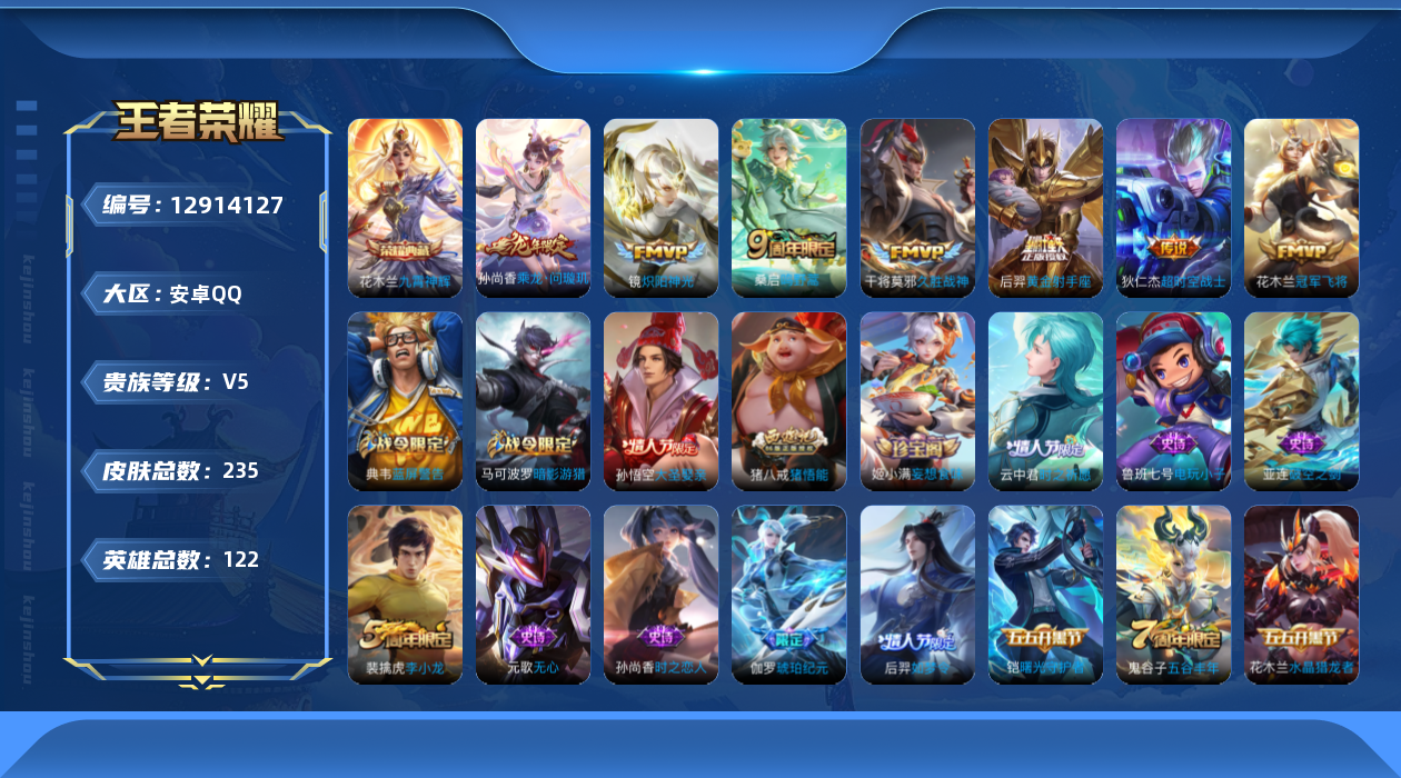 [12914127]安卓Q-V5-尊贵铂金I段位-122英雄-235皮肤-1典藏-0珍品无双-0无双-0珍品传说-7传说-63史诗 【荣耀典藏】:花木兰九霄神辉 【内测皮肤】:孙尚香蔷薇恋人,艾琳女武神,狂铁特工战影 【传说皮肤】:狄仁杰超时空战士,后羿黄金射手座,花木兰冠军飞将,干将莫邪久胜战神,镜炽阳神光,孙尚香乘龙问璇玑,桑启鸣野蒿 【限定皮肤】:白起狰,蒙犽顽岩魄,蔡文姬夏日便利店,大乔绒语心约,虞姬夏日便利店,姜子牙天穹之誓,狄仁杰阴阳师,虞姬凯尔特女王,赵云皇家上将,孙尚香蔷薇恋人,鲁班七号狮舞东方,庄周高山流水,高渐离死亡摇滚,芈月重明,元歌无心,夏侯惇朔风刀,甄姬游园惊梦,曹操烛龙,典韦穷奇,典韦蓝屏警告,马可波罗暗影游猎,狄仁杰魔术师,狄仁杰万华元夜,达摩沙漠行僧,项羽海滩派对,老夫子醍醐杖,程咬金演武夺筹,兰陵王金庭之子,孙悟空大圣娶亲,牛魔御旌,后羿如梦令,李元芳银河之约,李元芳云中旅人,钟馗神迹守卫,钟馗驱傩正仪,杨玉环遇见飞天,女娲朔望之晖,雅典娜黎明之约,蔡文姬繁星吟游,太乙真人饕餮,太乙真人华丽摇滚,鬼谷子原初探秘者,鬼谷子五谷丰年,苏烈千军破阵,百里玄策原初追逐者,弈星混沌棋,梦奇顽趣,沈梦溪星空之诺,沈梦溪大漠名商,明世隐疑决卦,裴擒虎李小龙,裴擒虎擒涛扼浪,狂铁御狮,米莱狄御霄,云中君纤云弄巧,云中君时之祈愿,盾山御銮,猪八戒西部大镖客,猪八戒猪悟能,上官婉儿梁祝,嫦娥拒霜思,鲁班大师探海日志,桑启海盐诗旅,艾琳女武神,张良古海寻踪,蒙恬荣光圣徽,高渐离燃音魔法,妲己灵卜魔法,鬼谷子天穹祈灯,伽罗琥珀纪元,姬小满妄想食味,孙尚香乘龙问璇玑,沈梦溪龙舞盛年,刘邦剑破天穹,程咬金群星魔术团,周瑜熔金海岸 【年限皮肤】:孙尚香乘龙问璇玑 【赛季限定】:白起狰,芈月重明,夏侯惇朔风刀,曹操烛龙,典韦穷奇,狄仁杰万华元夜,达摩沙漠行僧,老夫子醍醐杖,程咬金演武夺筹,兰陵王金庭之子,张良古海寻踪,牛魔御旌,李元芳云中旅人,虞姬凯尔特女王,钟馗驱傩正仪,雅典娜黎明之约,太乙真人饕餮,鬼谷子原初探秘者,苏烈千军破阵,百里玄策原初追逐者,弈星混沌棋,梦奇顽趣,沈梦溪大漠名商,明世隐疑决卦,裴擒虎擒涛扼浪,狂铁御狮,米莱狄御霄,盾山御銮,鲁班大师探海日志,桑启海盐诗旅,鬼谷子天穹祈灯,蒙恬荣光圣徽,刘邦剑破天穹,姜子牙天穹之誓 【战令限定】:蔡文姬夏日便利店,虞姬夏日