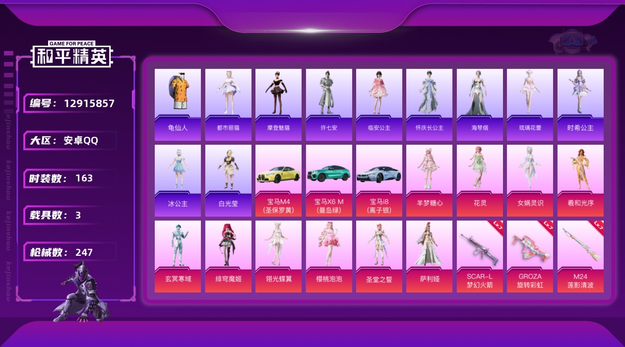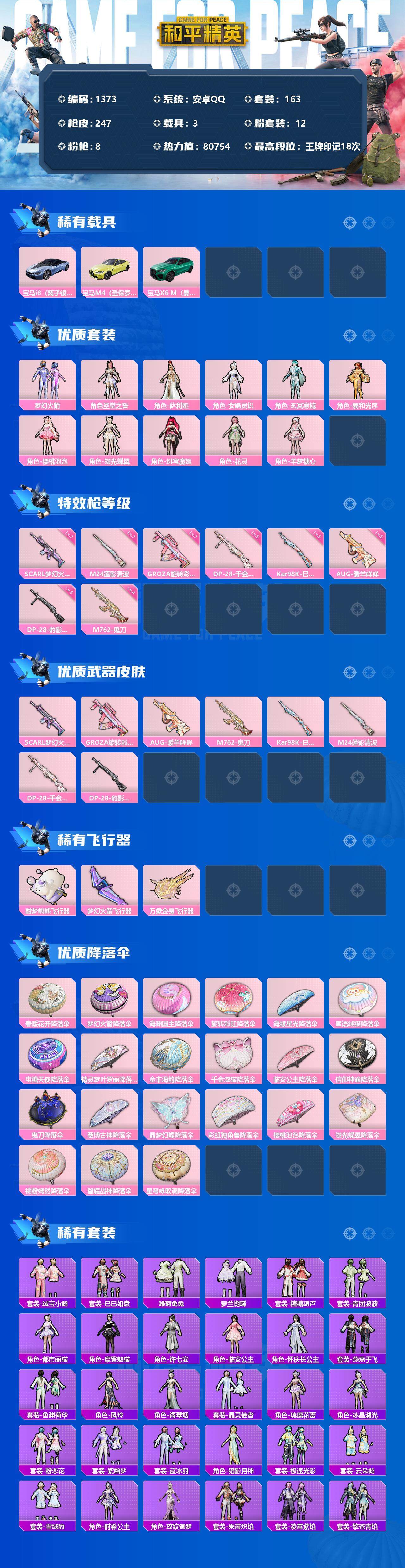 [12915857]安卓 手Q-12粉装-8特效枪-3载具-4粉色飞行器-80754热力值-18王牌印记-163套装-247枪皮