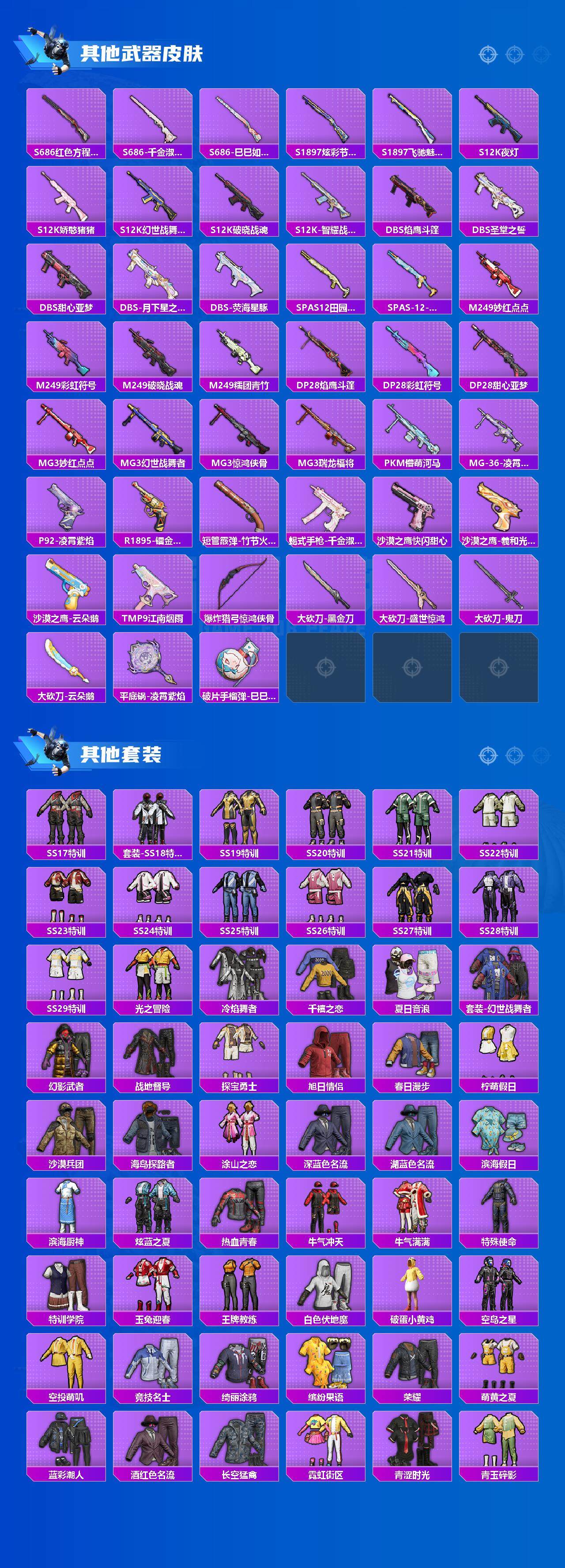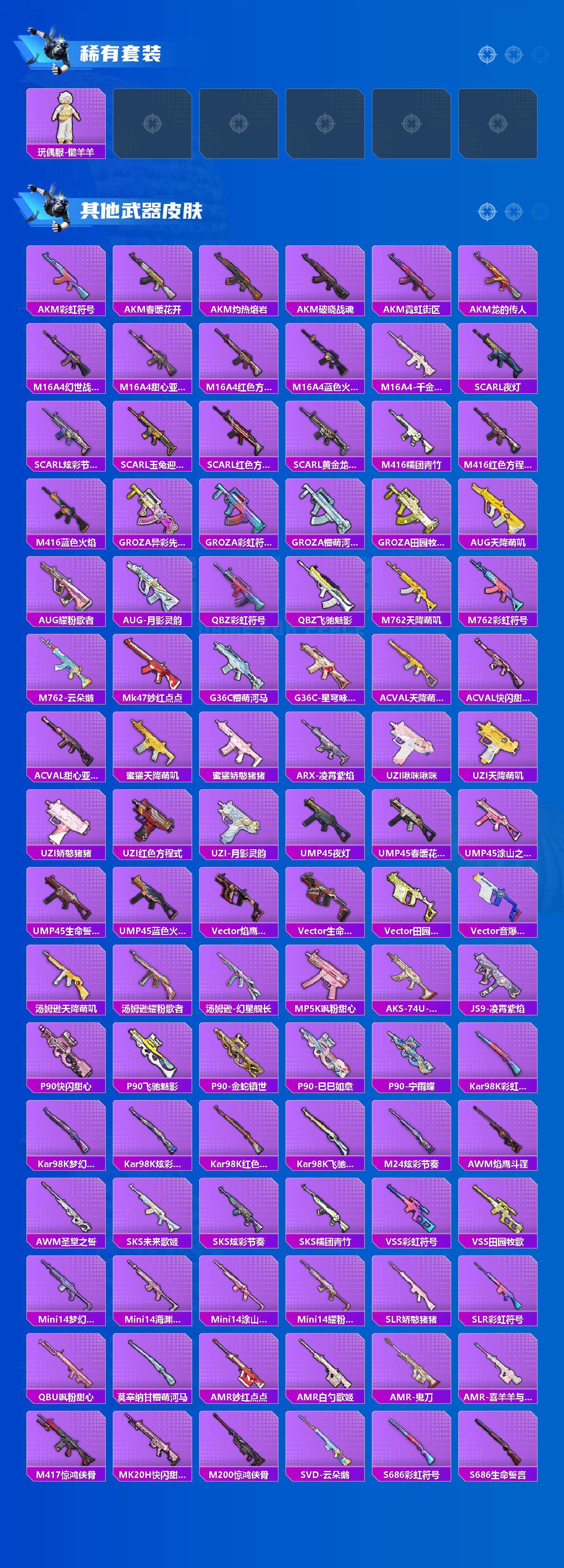 SCAR-L-梦幻火箭,GROZA-旋转彩虹,AUG-暖羊咩咩,M762-鬼刀,Kar98K-巳巳如意,M24-莲影清波,DP-28-千金淑猫