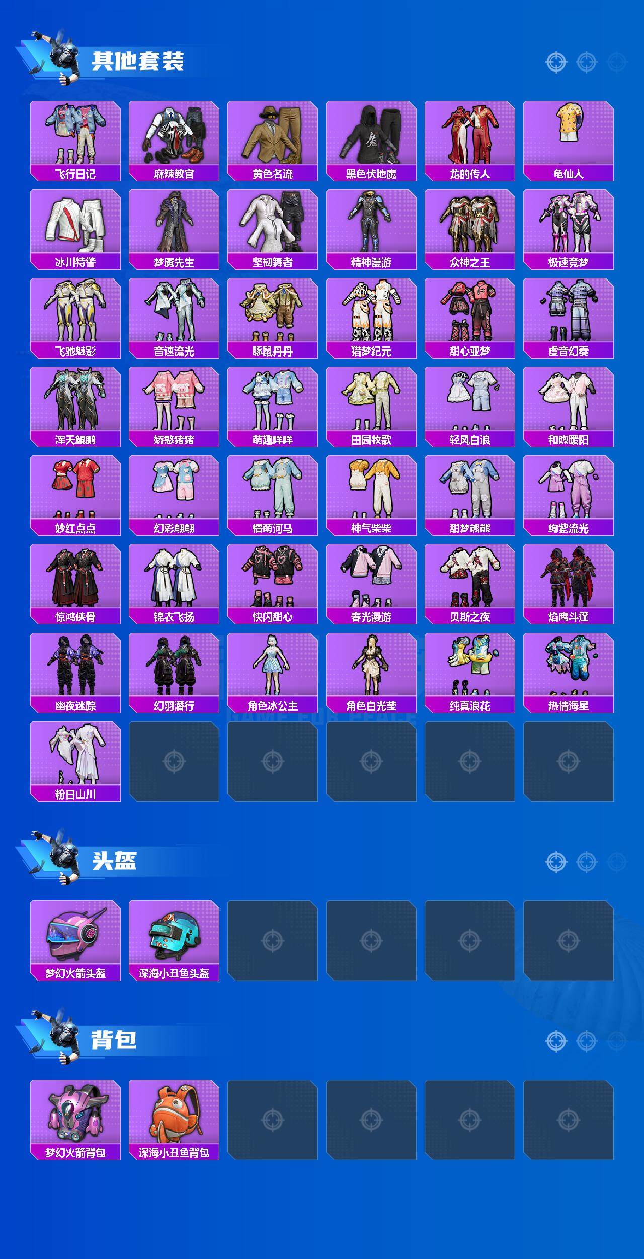 【稀有套装】:套装-龟仙人,套装-绒宝小鹅,套装-巳巳如意,套装-雏菊兔兔,套装-萝兰蝴蝶,套装-糖糖葫芦,套装-青团波波,角色-都市丽猫,角色-摩登魅猫,角色-许七安,角色-临安公主,角色-怀庆长公主,套装-燕燕于飞,套装-鱼渊荷华,角色-风玲,角色-海琴烟,套装-晶灵使者,角色-琉璃花蕾,角色-冰晶湖光,套装-粉恋花,套装-紫幽梦,套装-蓝冰羽,角色-猎影月神,套装-极速光影,套装-云朵鹅,套装-雪绒豹,角色-时希公主,角色-玫纹锢梦,套装-朱霞炽焰,套装-凌霄紫焰,套装-擎苍青焰,玩偶服-懒羊羊