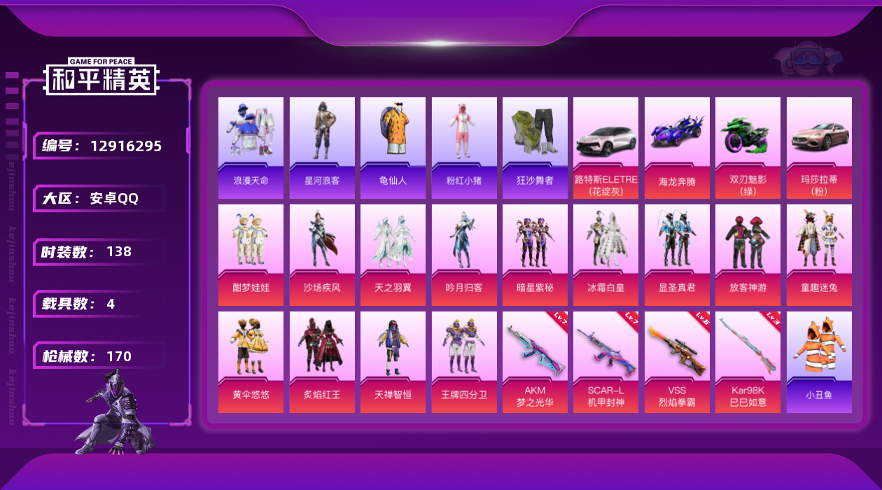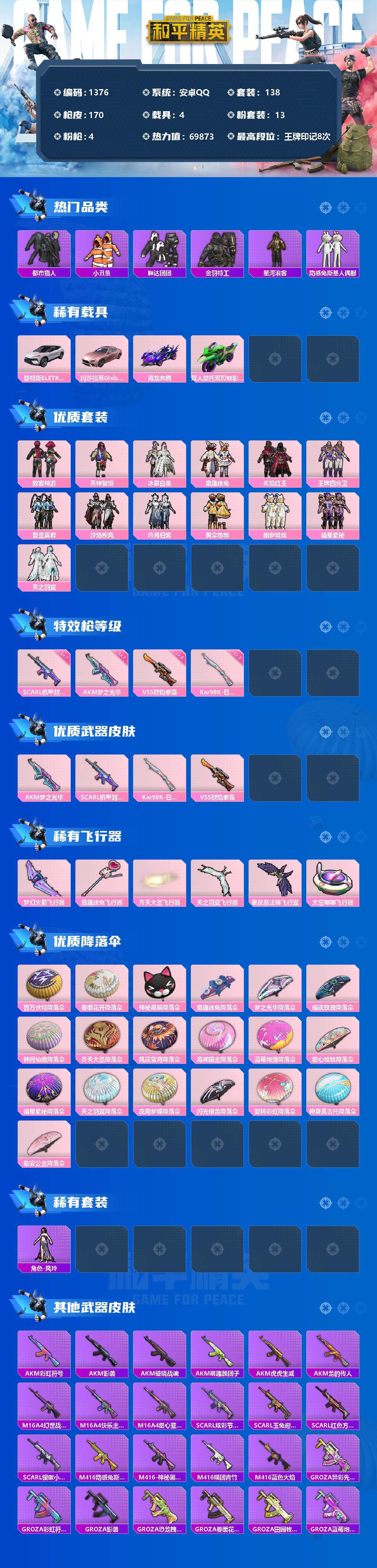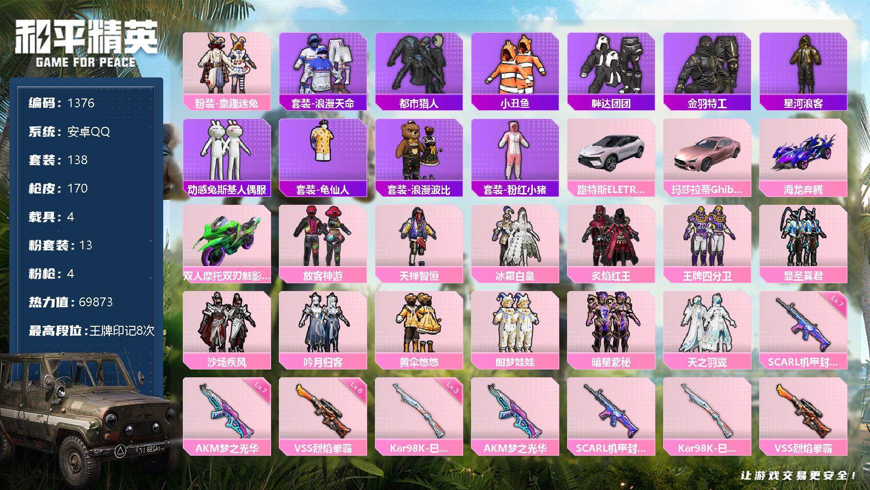 [12916295]安卓 手Q-13粉装-4特效枪-4载具-6粉色飞行器-69873热力值-8王牌印记-138套装-170枪皮