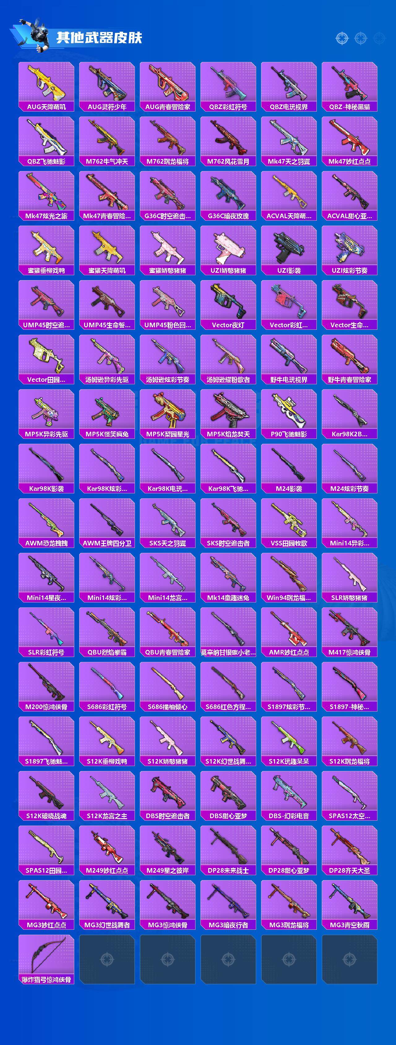 【稀有枪皮】:AKM-彩虹符号,AKM-影袭,AKM-破晓战魂,AKM-萌趣颜团子,AKM-虎虎生威,AKM-龙的传人,M16A4-幻世战舞者,M16A4-快乐主宰,M16A4-甜心亚梦,SCAR-L-炫彩节奏,SCAR-L-玉兔迎春,SCAR-L-红色方程式,SCAR-L-银碳小老虎,M416-动感兔斯基,M416-神秘黑猫,M416-糯团青竹,M416-蓝色火焰,GROZA-异彩先驱,GROZA-彩虹符号,GROZA-影袭,GROZA-恐龙拽拽,GROZA-春暖花开,GROZA-田园牧歌,GROZA-蓝莓炮弹,AUG-天降萌叽,AUG-灵符少年,AUG-青春冒险家,QBZ-彩虹符号,QBZ-电玩视界,QBZ-神秘黑猫,QBZ-飞驰魅影,M762