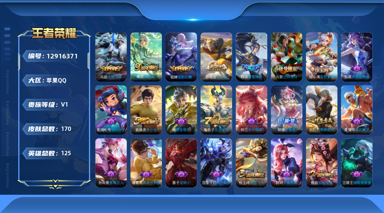 [12916371]苹果Q-V0-尊贵铂金IV段位-125英雄-170皮肤-3传说-37史诗 【英雄全皮】:空空儿全皮 【传说皮肤】:桑启鸣野蒿,马超无双飞将,貂蝉猫影幻舞 【限定皮肤】:白起狰,姜子牙天穹之誓,狄仁杰阴阳师,虞姬凯尔特女王,赵云皇家上将,孙尚香蔷薇恋人,庄周蜃楼王,庄周高山流水,孙膑妖精王,扁鹊炼金王,芈月重明,芈月幻夜卜梦,元歌云间偶戏,甄姬游园惊梦,曹操烛龙,典韦穷奇,狄仁杰魔术师,狄仁杰万华元夜,达摩沙漠行僧,项羽海滩派对,老夫子醍醐杖,程咬金演武夺筹,韩信傲雪梅枪,兰陵王金庭之子,亚瑟狮心王,孙悟空孙行者,后羿圣弓游侠,李元芳云中旅人,钟馗驱傩正仪,杨玉环遇见飞天,干将莫邪真爱魔法,太乙真人饕餮,鬼谷子原初探秘者,鬼谷子五谷丰年,黄忠火炮绅士,苏烈千军破阵,弈星混沌棋,沈梦溪大漠名商,明世隐疑决卦,裴擒虎李小龙,裴擒虎擒涛扼浪,狂铁御狮,嫦娥拒霜思,鲁班大师探海日志,桑启海盐诗旅,张良古海寻踪,鬼谷子天穹祈灯,姬小满妄想食味,沈梦溪龙舞盛年,刘邦剑破天穹,程咬金群星魔术团,刘备异域游侠 【赛季限定】:庄周蜃楼王,孙膑妖精王,扁鹊炼金王,白起狰,芈月重明,曹操烛龙,典韦穷奇,狄仁杰万华元夜,达摩沙漠行僧,老夫子醍醐杖,程咬金演武夺筹,兰陵王金庭之子,张良古海寻踪,亚瑟狮心王,李元芳云中旅人,虞姬凯尔特女王,钟馗驱傩正仪,太乙真人饕餮,鬼谷子原初探秘者,苏烈千军破阵,弈星混沌棋,沈梦溪大漠名商,明世隐疑决卦,裴擒虎擒涛扼浪,狂铁御狮,鲁班大师探海日志,桑启海盐诗旅,鬼谷子天穹祈灯,刘邦剑破天穹,姜子牙天穹之誓 【战令限定】:芈月幻夜卜梦,元歌云间偶戏,后羿圣弓游侠,干将莫邪真爱魔法,黄忠火炮绅士 【史诗皮肤】:鲁班七号电玩小子,项羽苍穹之光,赵云皇家上将,貂蝉圣诞恋歌,甄姬冰雪圆舞曲,狄仁杰魔术师,廉颇地狱岩魂,宫本武藏鬼剑武藏,孙尚香蔷薇恋人,孙尚香水果甜心,嬴政摇滚巨星,妲己魅力维加斯,妲己女仆咖啡,墨子龙骑士,墨子金属风暴,张飞乱世虎臣,夏侯惇乘风破浪,兰陵王暗隐猎兽者,诸葛亮黄金分割率,甄姬游园惊梦,雅典娜冰冠公主,百里守约特工魅影,程咬金功夫厨神,阿轲节奏热浪,杨玉环遇见飞天,狄仁杰鹰眼统帅,裴擒虎李小龙,元歌云间偶戏,干将莫邪真爱魔法,孙悟空孙行者,庄周高山流水,嫦娥拒霜思,黄忠火炮绅士,韩信傲雪梅枪,澜赏金猎手,鬼谷子五谷丰年,姬小满妄想食味 【其