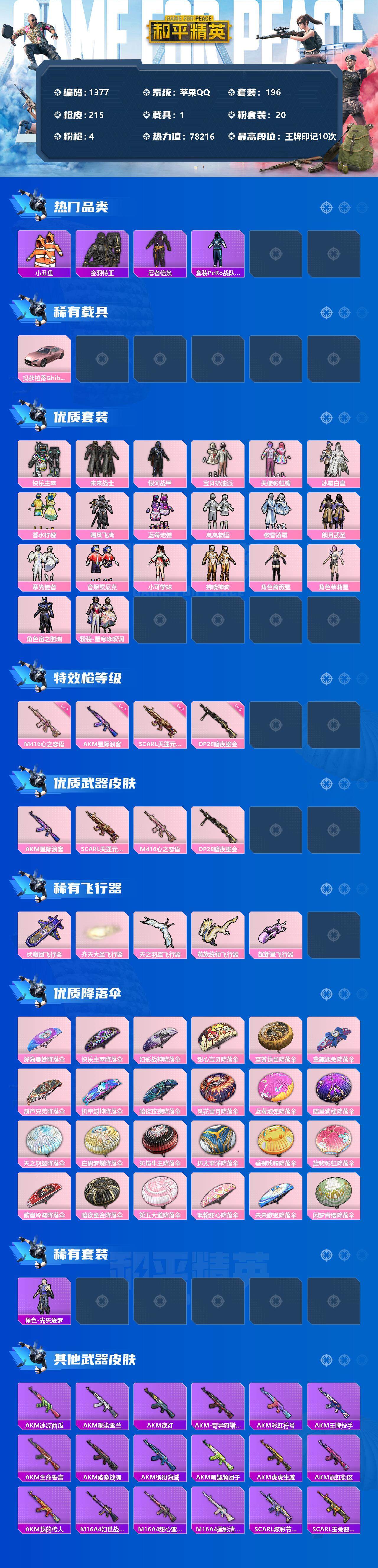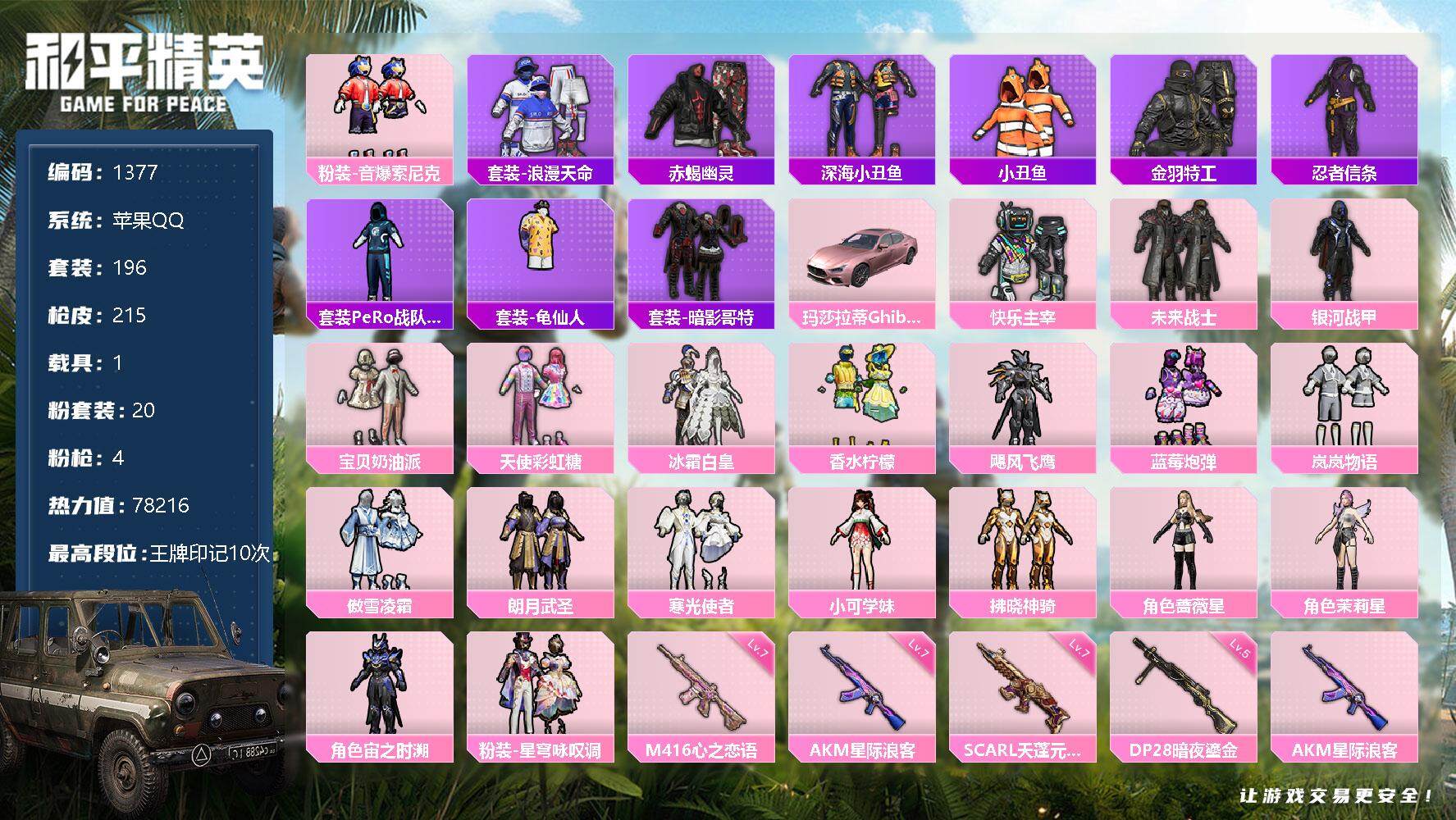 [12916430]苹果 手Q-20粉装-4特效枪-1载具-5粉色飞行器-78216热力值-10王牌印记-196套装-215枪皮 【热门品类】:粉装-音爆索尼克,套装-浪漫天命,套装-赤蝎幽灵,套装-深海小丑鱼,套装-小丑鱼,套装-金羽特工,套装-忍者信条,套装-PeRo战队服,套装-龟仙人,套装-暗影哥特 【粉色载具】:玛莎拉蒂Ghibli(粉) 【粉色套装】:粉装-快乐主宰,粉装-未来战士,粉装-银河战甲,粉装-宝贝奶油派,粉装-天使彩虹糖,粉装-冰霜白皇,粉装-香水柠檬,粉装-飓风飞鹰,粉装-蓝莓炮弹,粉装-岚岚物语,粉装-傲雪凌霜,粉装-朗月武圣,粉装-寒光使者,粉装-音爆索尼克,角色-小可学妹,粉装-拂晓神骑,角色-蔷薇星,角色-茉莉星,角色-宙之时溯,粉装-星穹咏叹调 【粉色枪皮等级】:AKM-星际浪客(七级),SCAR-L-天蓬元帅(七级),M416-心之恋语(七级),DP-28-暗夜鎏金(五级) 【粉色枪皮】:AKM-星际浪客,SCAR-L-天蓬元帅,M416-心之恋语,DP-28-暗夜鎏金 【粉色飞行器】:伏魔团飞行器,齐天大圣飞行器,天之羽翼飞行器,黄族统领飞行器,超新星飞行器 【粉色降落伞】:深海曼妙降落伞,快乐主宰降落伞,幻影战神降落伞,甜心宝贝降落伞,至尊龙雀降落伞,童趣迷兔降落伞,葫芦兄弟降落伞,机甲封神降落伞,暗夜玫瑰降落伞,风花雪月降落伞,蓝莓炮弹降落伞,暗星紫秘降落伞,天之羽翼降落伞,庄周梦蝶降落伞,炙焰牛王降落伞,环太平洋降落伞,垂柳戏鸭降落伞,旋转彩虹降落伞,歌者泠鸢降落伞,暗夜鎏金降落伞,第五大道降落伞,飒粉甜心降落伞,未来歌姬降落伞,闲梦青缨降落伞 【稀有套装】:套装-龟仙人,角色-光矢逐梦 【稀有枪皮】:AKM-冰凉西瓜,AKM-墨染幽兰,AKM-夜灯,AKM-奇异狩猎者,AKM-彩虹符号,AKM-王牌投手,AKM-生命誓言,AKM-破晓战魂,AKM-缤纷海域,AKM-萌趣颜团子,AKM-虎虎生威,AKM-霓虹街区,AKM-龙的传人,M16A4-幻世战舞者,M16A4-甜心亚梦,M16A4-莲影清波,SCAR-L-炫彩节奏,SCAR-L-玉兔迎春,SCAR-L-碧影闪光,SCAR-L-粉锦千层,SCAR-L-红色方程式,SCAR-L-黄金龙骨,M416-仓鼠灰灰,M416-摩登王国,M416-红色方程式,M416-绿野极光,M416-黄金狮
