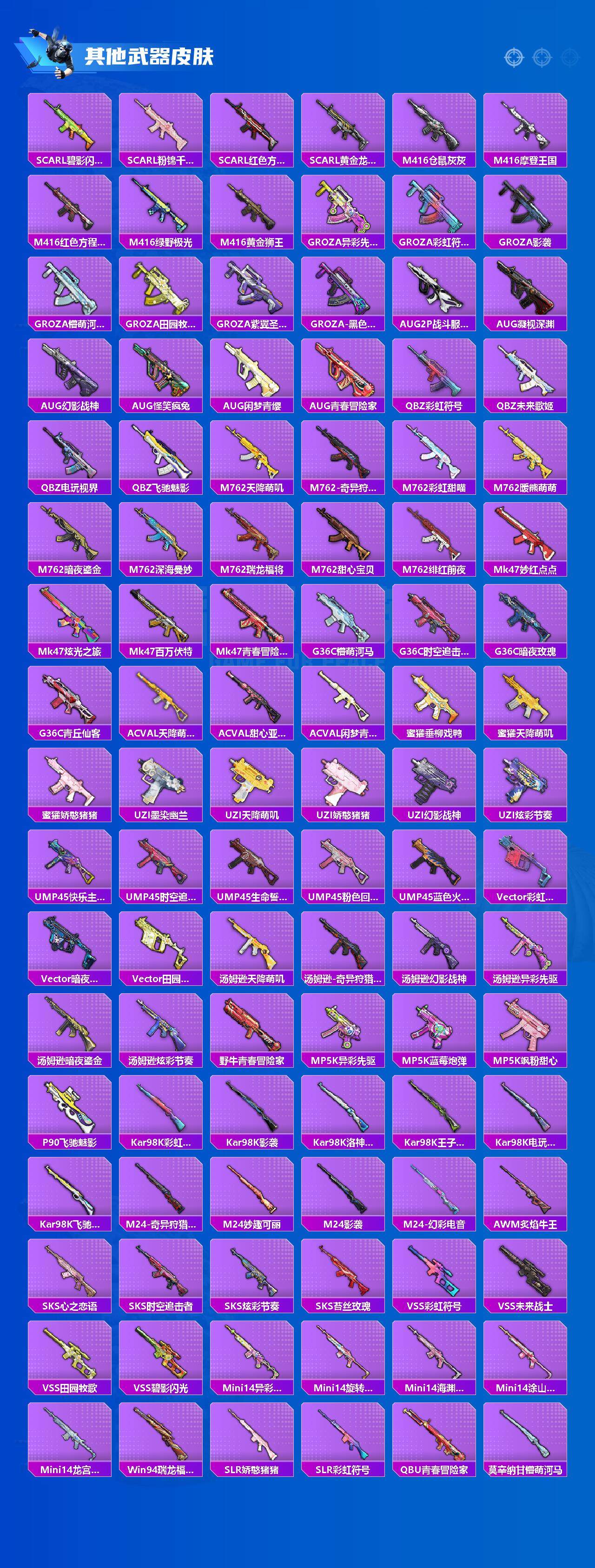 【稀有枪皮】:AKM-冰凉西瓜,AKM-墨染幽兰,AKM-夜灯,AKM-奇异狩猎者,AKM-彩虹符号,AKM-王牌投手,AKM-生命誓言,AKM-破晓战魂,AKM-缤纷海域,AKM-萌趣颜团子,AKM-虎虎生威,AKM-霓虹街区,AKM-龙的传人,M16A4-幻世战舞者,M16A4-甜心亚梦,M16A4-莲影清波,SCAR-L-炫彩节奏,SCAR-L-玉兔迎春,SCAR-L-碧影闪光,SCAR-L-粉锦千层,SCAR-L-红色方程式,SCAR-L-黄金龙骨,M416-仓鼠灰灰,M416-摩登王国,M416-红色方程式,M416-绿野极光,M416-黄金狮