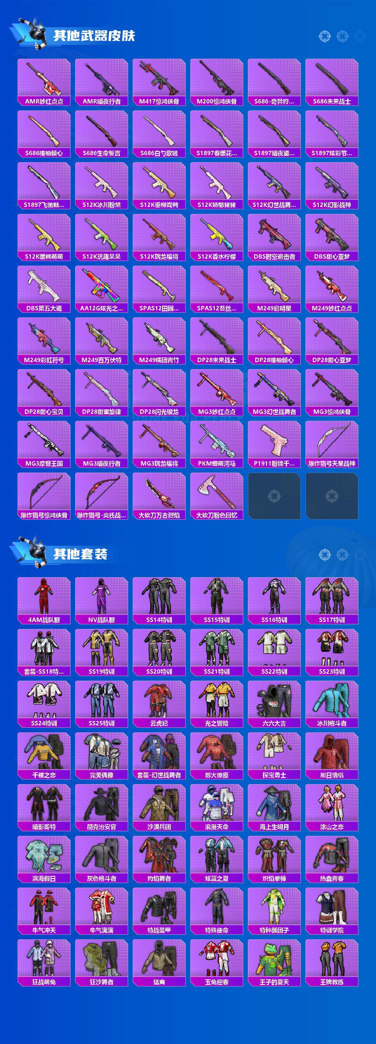 - PX_2096401- 安卓手Q-2王牌印记-9粉装-7特效枪-5载具-45479热力值-76套装-119枪皮-0卓越印记-0传奇印记 【9粉装】,新星烈龙,恐龙拽拽,庄周梦蝶,碧影闪光,酣梦娃娃,岚岚物语,冰霜白皇,彩虹鹿灵,天之羽翼 【7特效枪】AKM-百合蜜语-5级 SCAR-L-青春物语-1级 SCAR-L-童趣迷兔-4级 GROZA-焦糖拿铁-6级 M762-甜心娃娃-4级 Kar98K
