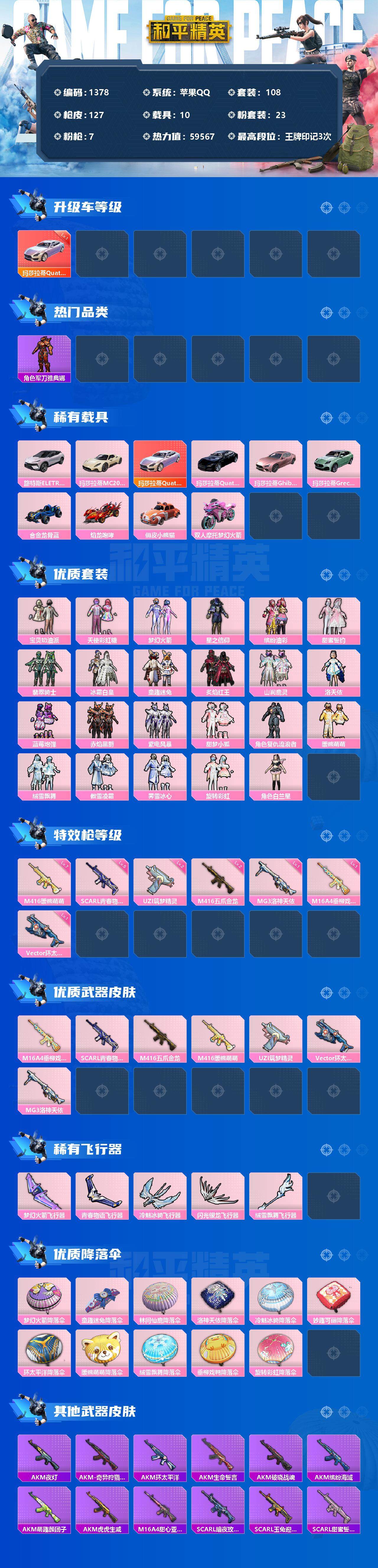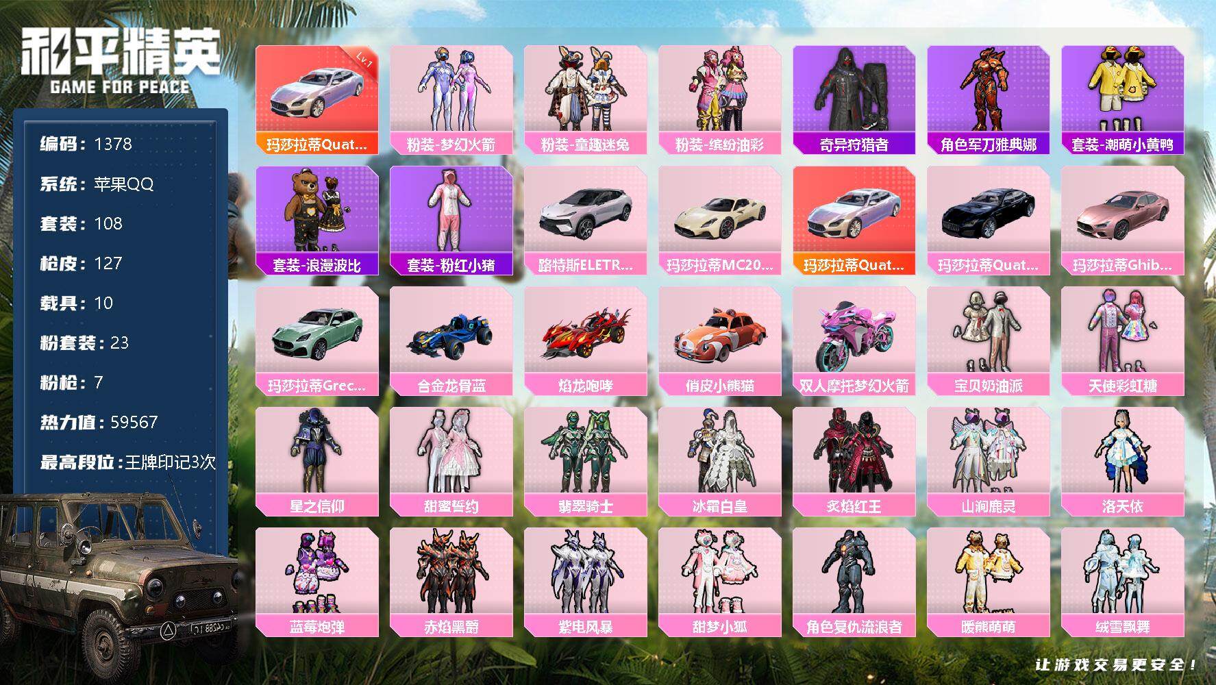 [12916523]苹果 手Q-23粉装-7特效枪-10载具-5粉色飞行器-59567热力值-3王牌印记-108套装-127枪皮 【红色载具】:玛莎拉蒂Quattroporte(幻星粉)(一级) 【热门品类】:粉装-梦幻火箭,粉装-童趣迷兔,粉装-缤纷油彩,套装-奇异狩猎者,角色-军刀雅典娜,套装-潮萌小黄鸭,套装-浪漫波比,套装-粉红小猪 【粉色载具】:路特斯ELETRE(花绽灰),玛莎拉蒂MC20(星石白),玛莎拉蒂Quattroporte(幻星粉),玛莎拉蒂Quattroporte(夜幕蓝),玛莎拉蒂Ghibli(粉),玛莎拉蒂Grecale(薄荷绿),合金龙骨(蓝),焰龙咆哮,俏皮小熊猫,双人摩托-梦幻火箭 【粉色套装】:粉装-宝贝奶油派,粉装-天使彩虹糖,粉装-梦幻火箭,粉装-星之信仰,粉装-缤纷油彩,粉装-甜蜜誓约,粉装-翡翠骑士,粉装-冰霜白皇,粉装-童趣迷兔,粉装-炙焰红王,粉装-山涧鹿灵,角色-洛天依,粉装-蓝莓炮弹,粉装-赤焰黑爵,粉装-紫电风暴,粉装-甜梦小狐,角色-复仇流浪者,粉装-暖熊萌萌,粉装-绒雪飘舞,粉装-傲雪凌霜,粉装-霁雪冰心,粉装-旋转彩虹,角色-白兰星 【粉色枪皮等级】:M16A4-垂柳戏鸭(一级),SCAR-L-青春物语(五级),M416-五爪金龙(二级),M416-暖熊萌萌(七级),UZI-筑梦精灵(二级),Vector-环太平洋(一级),MG3-洛神天依(一级) 【粉色枪皮】:M16A4-垂柳戏鸭,SCAR-L-青春物语,M416-五爪金龙,M416-暖熊萌萌,UZI-筑梦精灵,Vector-环太平洋,MG3-洛神天依 【粉色飞行器】:梦幻火箭飞行器,青春物语飞行器,冷魅冰骑飞行器,闪光银龙飞行器,绒雪飘舞飞行器 【粉色降落伞】:梦幻火箭降落伞,童趣迷兔降落伞,林间仙鹿降落伞,洛神天依降落伞,冷魅冰骑降落伞,妙趣可丽降落伞,环太平洋降落伞,暖熊萌萌降落伞,绒雪飘舞降落伞,垂柳戏鸭降落伞,旋转彩虹降落伞 【稀有枪皮】:AKM-夜灯,AKM-奇异狩猎者,AKM-环太平洋,AKM-生命誓言,AKM-破晓战魂,AKM-缤纷海域,AKM-萌趣颜团子,AKM-虎虎生威,M16A4-甜心亚梦,SCAR-L-暗夜玫瑰,SCAR-L-玉兔迎春,SCAR-L-甜蜜誓约,SCAR-L-红色方程式,SCAR-L-青丘仙客,M416-红色方程式,M416-绯红前夜