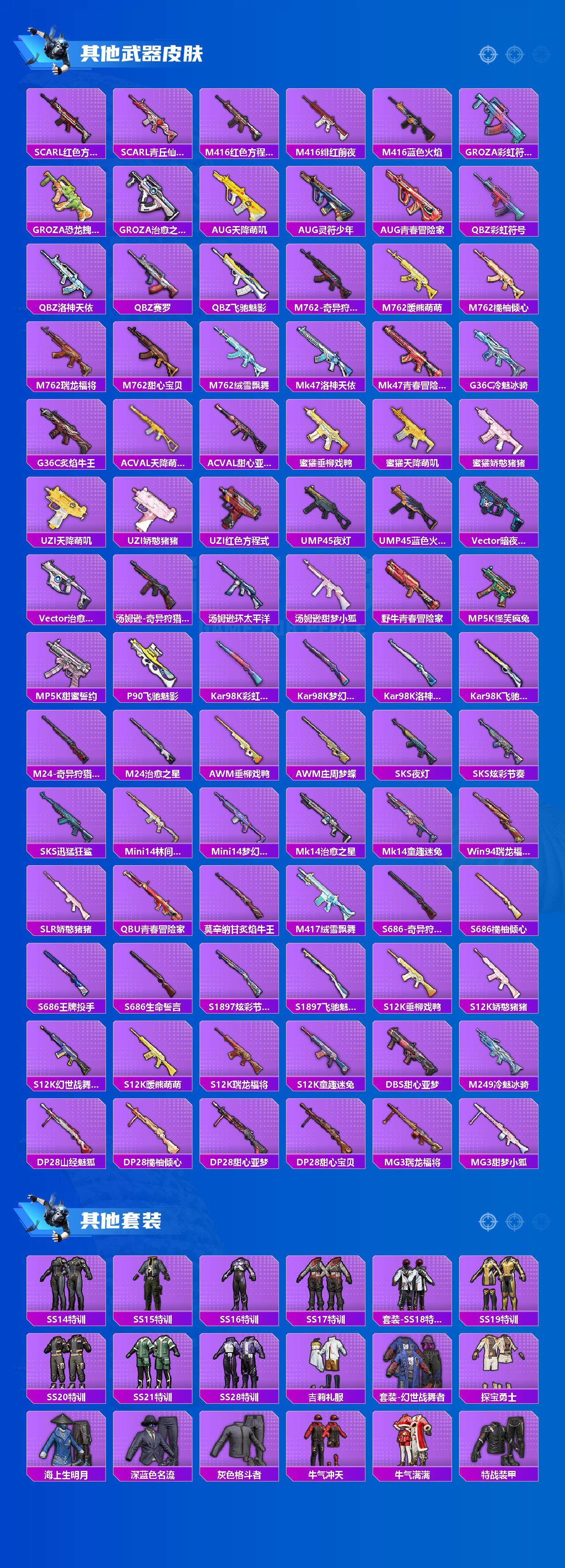 【稀有枪皮】:AKM-夜灯,AKM-奇异狩猎者,AKM-环太平洋,AKM-生命誓言,AKM-破晓战魂,AKM-缤纷海域,AKM-萌趣颜团子,AKM-虎虎生威,M16A4-甜心亚梦,SCAR-L-暗夜玫瑰,SCAR-L-玉兔迎春,SCAR-L-甜蜜誓约,SCAR-L-红色方程式,SCAR-L-青丘仙客,M416-红色方程式,M416-绯红前夜