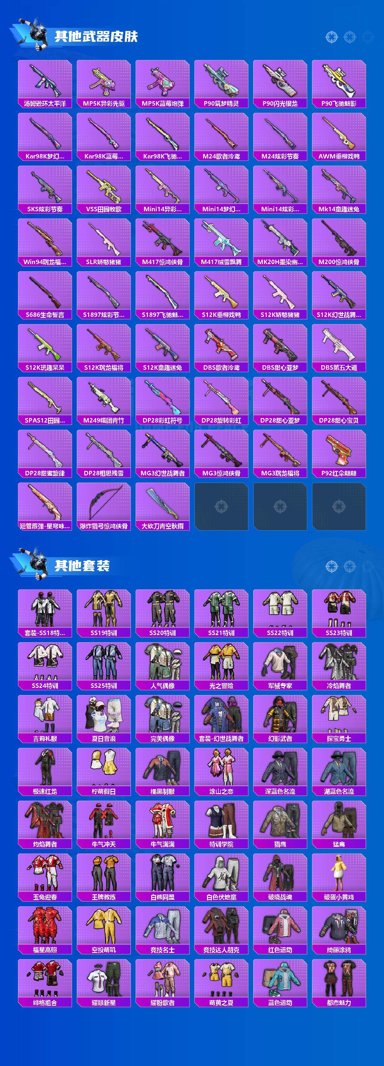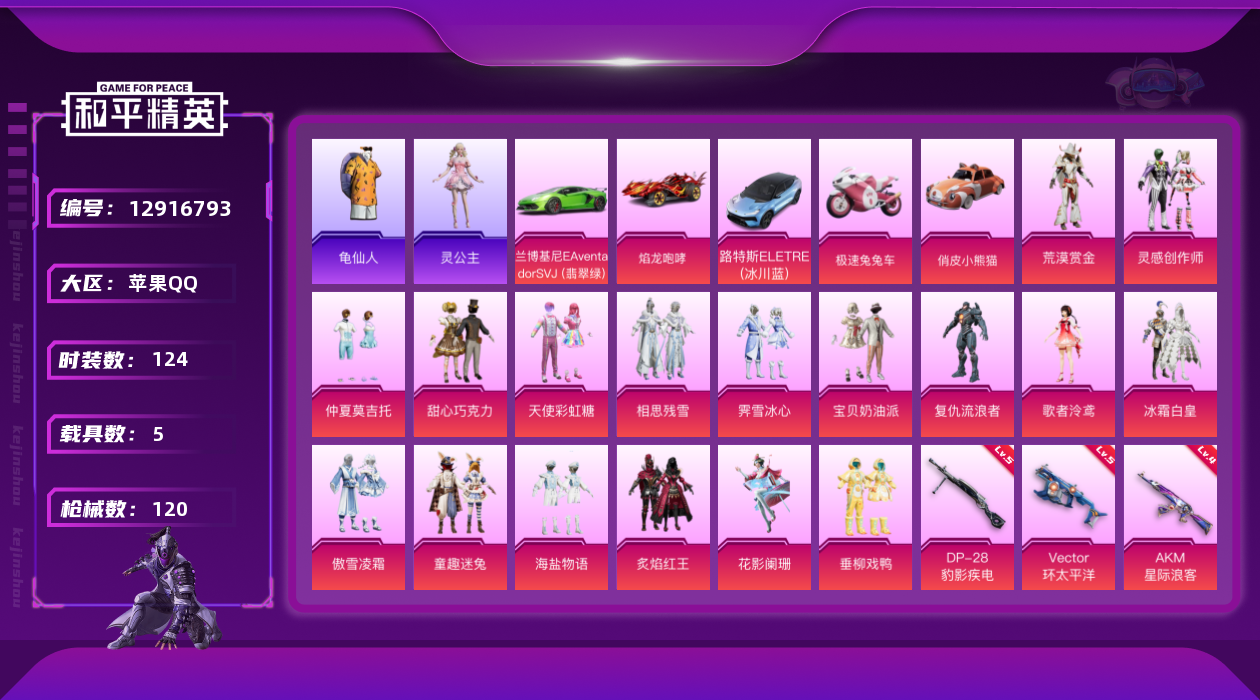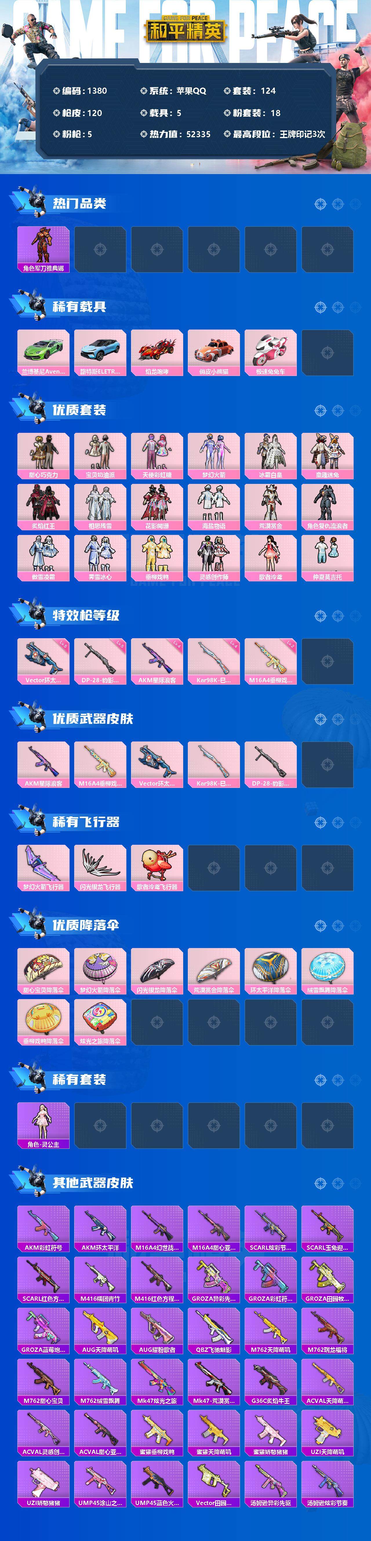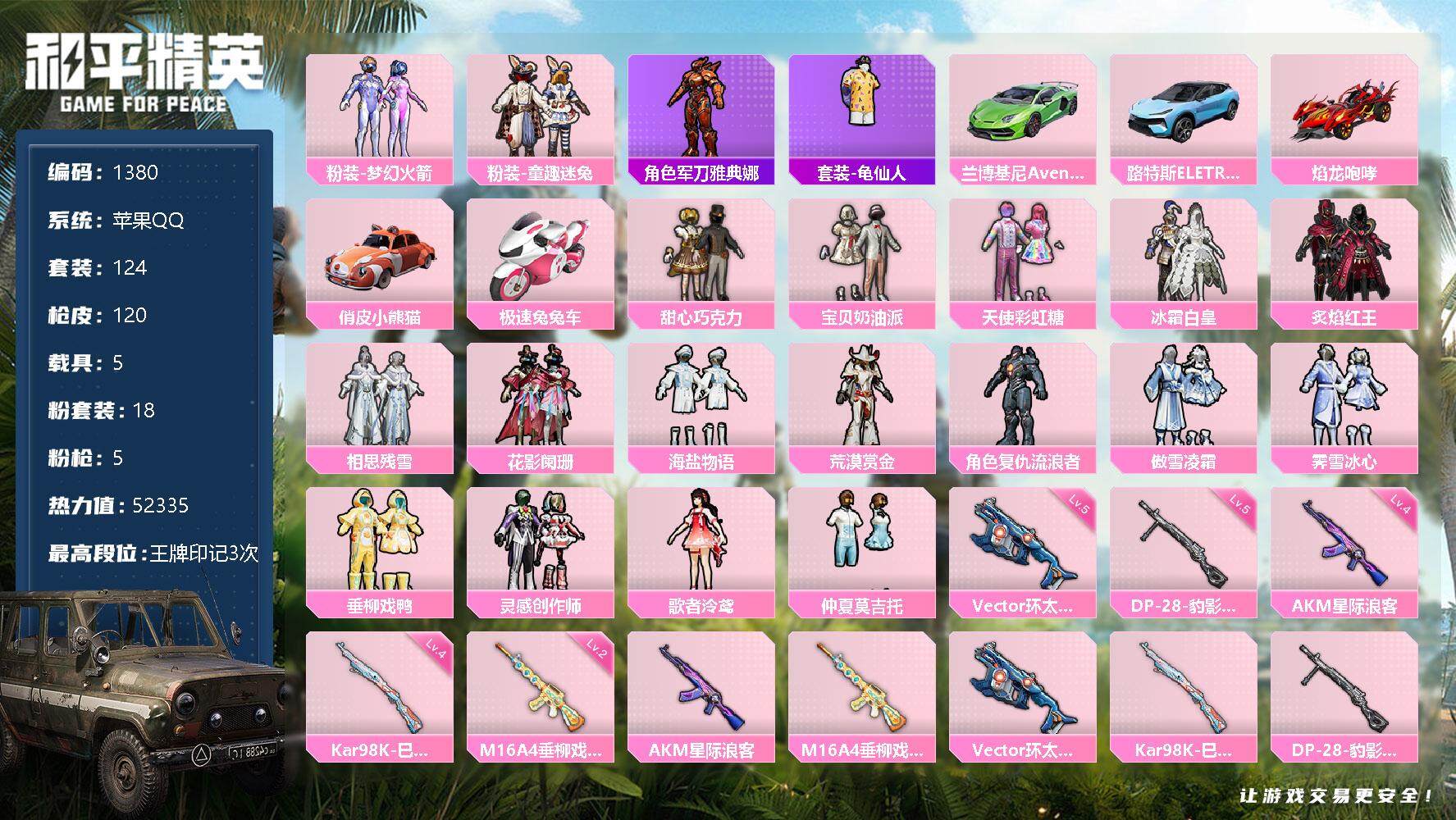 [12916793]苹果 手Q-18粉装-5特效枪-5载具-3粉色飞行器-52335热力值-3王牌印记-124套装-120枪皮 【热门品类】:粉装-梦幻火箭,粉装-童趣迷兔,角色-军刀雅典娜,套装-龟仙人 【粉色载具】:兰博基尼Aventador SVJ(翡翠绿),路特斯ELETRE(冰川蓝),焰龙咆哮,俏皮小熊猫,极速兔兔车 【粉色套装】:粉装-甜心巧克力,粉装-宝贝奶油派,粉装-天使彩虹糖,粉装-梦幻火箭,粉装-冰霜白皇,粉装-童趣迷兔,粉装-炙焰红王,粉装-相思残雪,粉装-花影阑珊,粉装-海盐物语,粉装-荒漠赏金,角色-复仇流浪者,粉装-傲雪凌霜,粉装-霁雪冰心,粉装-垂柳戏鸭,粉装-灵感创作师,角色-歌者泠鸢,粉装-仲夏莫吉托 【粉色枪皮等级】:AKM-星际浪客(四级),M16A4-垂柳戏鸭(二级),Vector-环太平洋(五级),Kar98K-巳巳如意(四级),DP-28-豹影疾电(五级) 【粉色枪皮】:AKM-星际浪客,M16A4-垂柳戏鸭,Vector-环太平洋,Kar98K-巳巳如意,DP-28-豹影疾电 【粉色飞行器】:梦幻火箭飞行器,闪光银龙飞行器,歌者泠鸢飞行器 【粉色降落伞】:甜心宝贝降落伞,梦幻火箭降落伞,闪光银龙降落伞,荒漠赏金降落伞,环太平洋降落伞,绒雪飘舞降落伞,垂柳戏鸭降落伞,炫光之旅降落伞 【稀有套装】:套装-龟仙人,角色-灵公主 【稀有枪皮】:AKM-彩虹符号,AKM-环太平洋,M16A4-幻世战舞者,M16A4-甜心亚梦,SCAR-L-炫彩节奏,SCAR-L-玉兔迎春,SCAR-L-红色方程式,M416-糯团青竹,M416-红色方程式,GROZA-异彩先驱,GROZA-彩虹符号,GROZA-田园牧歌,GROZA-蓝莓炮弹,AUG-天降萌叽,AUG-耀粉歌者,QBZ-飞驰魅影,M762-天降萌叽,M762-瑞龙福将,M762-甜心宝贝,M762-绒雪飘舞,Mk47-炫光之旅,Mk47-荒漠赏金,G36C-炙焰牛王,AC-VAL-天降萌叽,AC-VAL-灵感创作师,AC-VAL-甜心亚梦,蜜獾-垂柳戏鸭,蜜獾-天降萌叽,蜜獾-娇憨猪猪,UZI-天降萌叽,UZI-娇憨猪猪,UMP45-涂山之恋,UMP45-蓝色火焰,Vector-田园牧歌,汤姆逊-异彩先驱,汤姆逊-炫彩节奏,汤姆逊-环太平洋,MP5K-异彩先驱,MP5K-蓝莓炮弹,P90-筑梦精灵,