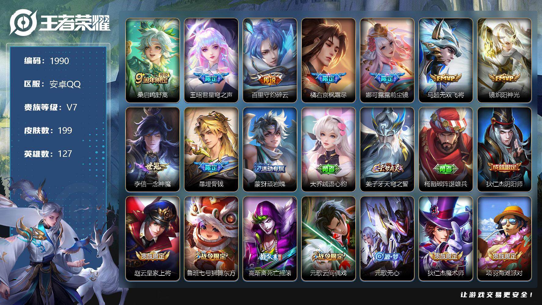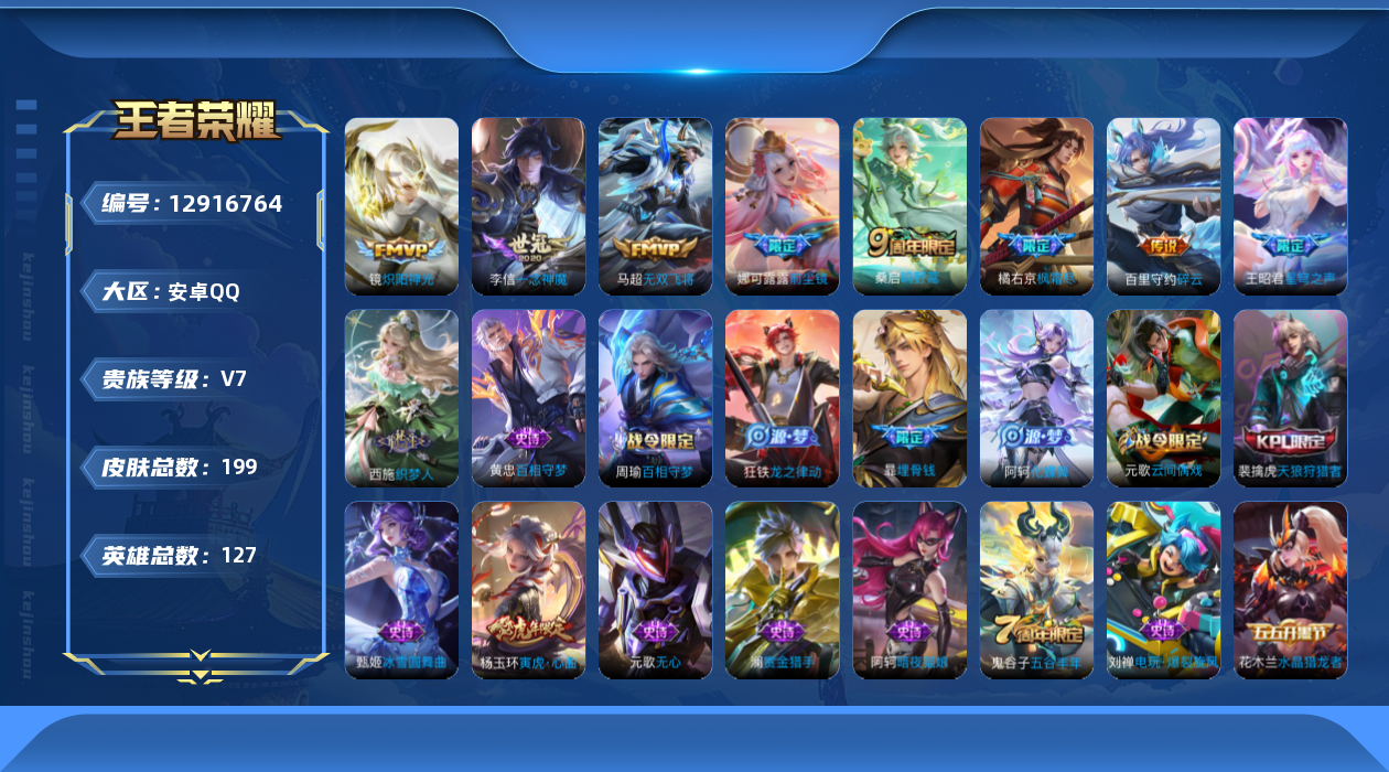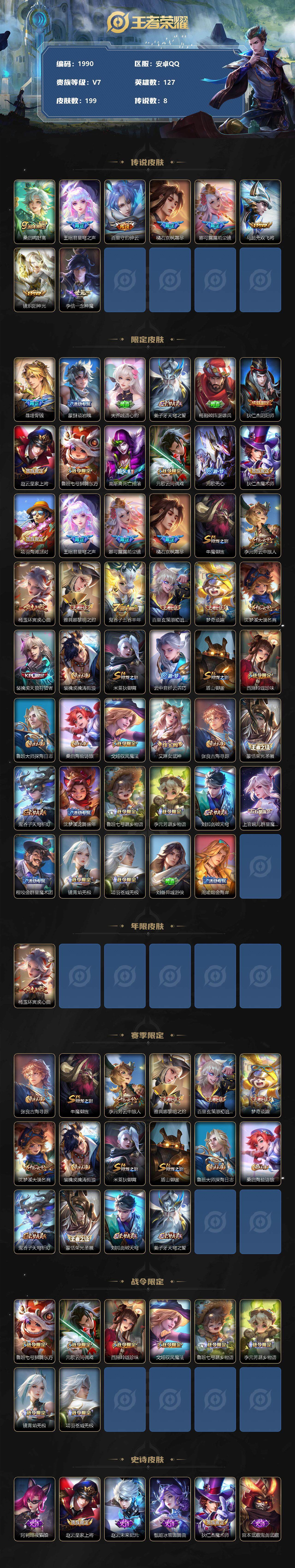 [12916764]安卓Q-V7-最强王者段位-127英雄-199皮肤-0典藏-0珍品无双-0无双-0珍品传说-8传说-51史诗
