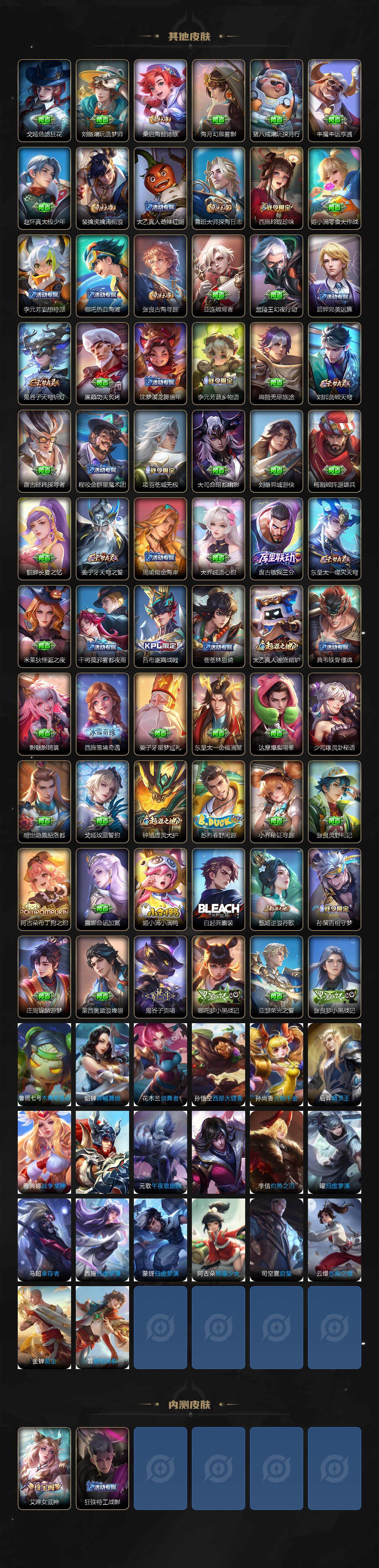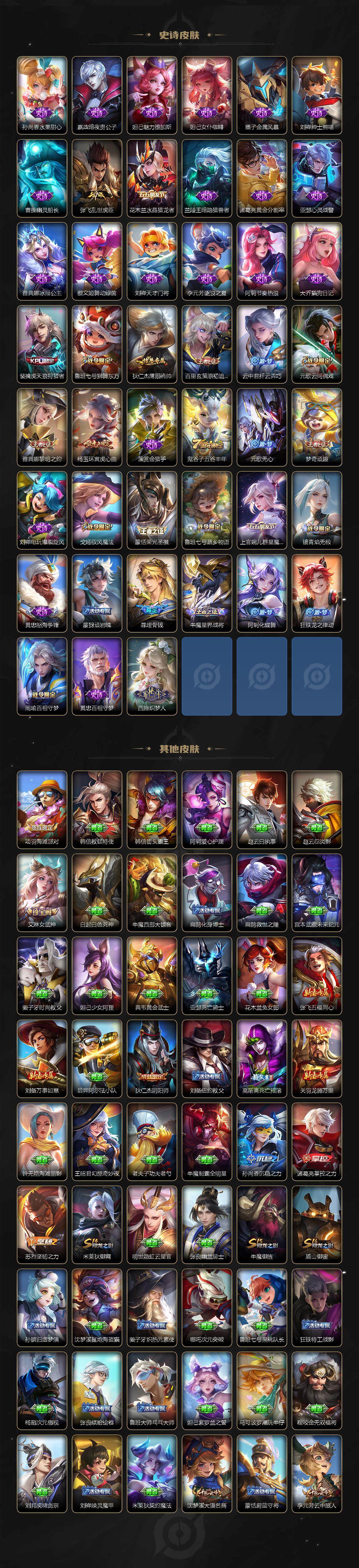 【史诗皮肤】:阿轲暗夜猫娘,赵云皇家上将,赵云未来纪元,甄姬冰雪圆舞曲,狄仁杰魔术师,宫本武藏鬼剑武藏,孙尚香水果甜心,嬴政暗夜贵公子,妲己魅力维加斯,妲己女仆咖啡,墨子金属风暴,刘禅绅士熊喵,曹操幽灵船长,张飞乱世虎臣,花木兰水晶猎龙者,兰陵王暗隐猎兽者,诸葛亮黄金分割率,亚瑟心灵战警,雅典娜冰冠公主,蔡文姬舞动绿茵,刘禅天才门将,李元芳逐浪之夏,阿轲节奏热浪,大乔猫狗日记,裴擒虎天狼狩猎者,鲁班七号狮舞东方,狄仁杰鹰眼统帅,百里玄策原初追逐者,云中君纤云弄巧,元歌云间偶戏,雅典娜黎明之约,杨玉环寅虎心曲,澜赏金猎手,鬼谷子五谷丰年,元歌无心,梦奇顽趣,刘禅电玩爆裂旋风,戈娅驭风魔法,蒙恬荣光圣徽,鲁班七