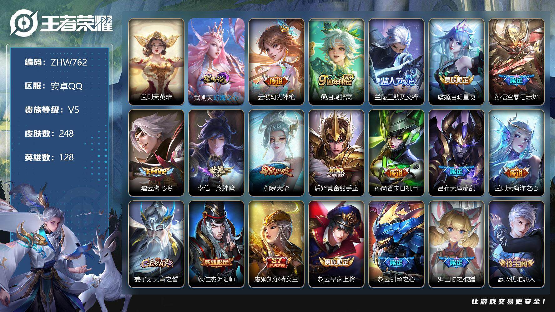 [12916802]安卓Q-V5-最强王者段位-128英雄-248皮肤-1典藏-1星传说-12传说-70史诗 【英雄全皮】:鬼谷子全皮 【荣耀典藏】:武则天英雄 【传说皮肤】:云缨幻光神枪,桑启鸣野蒿,兰陵王默契交锋,虞姬启明星使,孙悟空零号赤焰,曜云鹰飞将,李信一念神魔,伽罗太华,后羿黄金射手座,孙尚香末日机甲,吕布天魔缭乱,武则天海洋之心 【限定皮肤】:姜子牙天穹之誓,狄仁杰阴阳师,虞姬凯尔特女王,赵云皇家上将,赵云引擎之心,妲己时之彼端,嬴政优雅恋人,嬴政白昼王子,孙尚香蔷薇恋人,鲁班七号狮舞东方,庄周高山流水,芈月重明,吕布天魔缭乱,吕布猎兽之王,周瑜赤莲之焰,元歌无心,夏侯惇朔风刀,甄姬游园惊梦,曹操烛龙,典韦穷奇,典韦蓝屏警告,典韦岱宗,狄仁杰魔术师,狄仁杰万华元夜,达摩沙漠行僧,项羽海滩派对,老夫子醍醐杖,程咬金演武夺筹,兰陵王默契交锋,兰陵王驯魔猎人,兰陵王金庭之子,花木兰青春决赛季,花木兰默契交锋,孙悟空零号赤焰,孙悟空孙行者,牛魔御旌,李元芳银河之约,李元芳云中旅人,虞姬启明星使,钟馗神迹守卫,钟馗驱傩正仪,杨玉环遇见飞天,女娲朔望之晖,蔡文姬繁星吟游,太乙真人饕餮,鬼谷子原初探秘者,鬼谷子五谷丰年,铠青龙志,苏烈千军破阵,百里玄策原初追逐者,弈星混沌棋,沈梦溪星空之诺,沈梦溪大漠名商,明世隐疑决卦,裴擒虎李小龙,狂铁御狮,米莱狄御霄,云中君纤云弄巧,伽罗太华,伽罗天狼溯光者,盾山御銮,上官婉儿梁祝,桑启海盐诗旅,鬼谷子天穹祈灯,刘邦剑破天穹,周瑜熔金海岸 【年限皮肤】:铠青龙志,伽罗太华,典韦岱宗 【赛季限定】:芈月重明,夏侯惇朔风刀,曹操烛龙,典韦穷奇,狄仁杰万华元夜,达摩沙漠行僧,老夫子醍醐杖,程咬金演武夺筹,兰陵王金庭之子,牛魔御旌,李元芳云中旅人,虞姬凯尔特女王,钟馗驱傩正仪,太乙真人饕餮,鬼谷子原初探秘者,苏烈千军破阵,百里玄策原初追逐者,弈星混沌棋,沈梦溪大漠名商,明世隐疑决卦,狂铁御狮,米莱狄御霄,盾山御銮,桑启海盐诗旅,鬼谷子天穹祈灯,刘邦剑破天穹,姜子牙天穹之誓 【战令限定】:嬴政白昼王子,鲁班七号狮舞东方,吕布猎兽之王,周瑜赤莲之焰,典韦蓝屏警告,兰陵王驯魔猎人,李元芳银河之约,钟馗神迹守卫,女娲朔望之晖,沈梦溪星空之诺 【史诗皮肤】:鲁班七号电玩小子,项羽苍穹之光,阿轲暗夜猫娘,赵云皇家上将,赵云未来纪元,貂蝉圣诞恋歌,甄姬冰雪圆舞曲,王昭