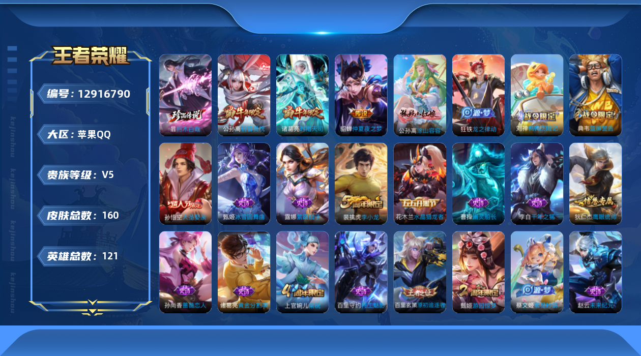 [12916790]苹果Q-V5-最强王者段位-121英雄-160皮肤-1珍品传说-3传说-30史诗