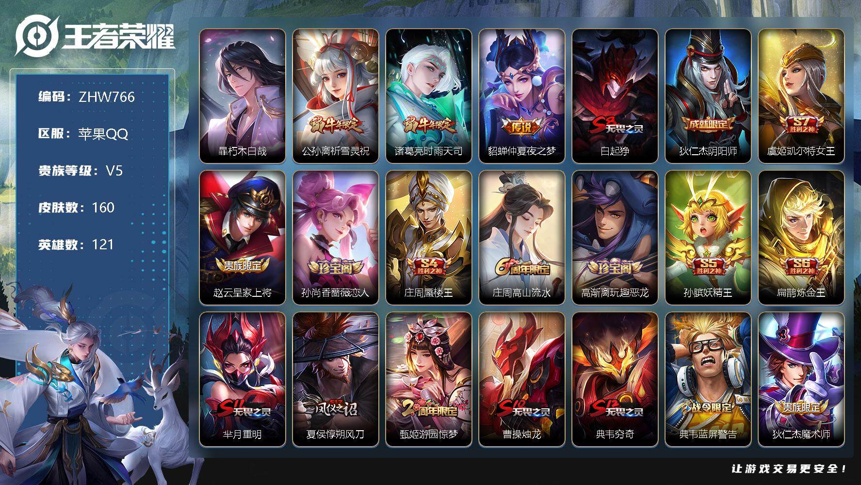 [12916790]苹果Q-V5-最强王者段位-121英雄-160皮肤-1珍品传说-3传说-30史诗 【珍品传说】:暃朽木白哉 【传说皮肤】:公孙离祈雪灵祝,诸葛亮时雨天司,貂蝉仲夏夜之梦 【限定皮肤】:白起狰,狄仁杰阴阳师,虞姬凯尔特女王,赵云皇家上将,孙尚香蔷薇恋人,庄周蜃楼王,庄周高山流水,高渐离玩趣恶龙,孙膑妖精王,扁鹊炼金王,芈月重明,夏侯惇朔风刀,甄姬游园惊梦,曹操烛龙,典韦穷奇,典韦蓝屏警告,狄仁杰魔术师,狄仁杰万华元夜,达摩沙漠行僧,项羽海滩派对,老夫子醍醐杖,程咬金演武夺筹,兰陵王金庭之子,孙悟空大圣娶亲,牛魔御旌,钟馗驱傩正仪,女娲朔望之晖,雅典娜黎明之约,蔡文姬繁星吟游,太乙真人饕餮,鬼谷子原初探秘者,诸葛亮时雨天司,苏烈千军破阵,百里玄策原初追逐者,弈星混沌棋,公孙离祈雪灵祝,沈梦溪大漠名商,明世隐疑决卦,裴擒虎李小龙,狂铁御狮,米莱狄御霄,盾山御銮,上官婉儿梁祝,蒙犽狂想玩偶喵 【年限皮肤】:公孙离祈雪灵祝,诸葛亮时雨天司 【赛季限定】:庄周蜃楼王,孙膑妖精王,扁鹊炼金王,白起狰,芈月重明,夏侯惇朔风刀,曹操烛龙,典韦穷奇,狄仁杰万华元夜,达摩沙漠行僧,老夫子醍醐杖,程咬金演武夺筹,兰陵王金庭之子,牛魔御旌,虞姬凯尔特女王,钟馗驱傩正仪,雅典娜黎明之约,太乙真人饕餮,鬼谷子原初探秘者,苏烈千军破阵,百里玄策原初追逐者,弈星混沌棋,沈梦溪大漠名商,明世隐疑决卦,狂铁御狮,米莱狄御霄,盾山御銮 【战令限定】:典韦蓝屏警告,女娲朔望之晖,蒙犽狂想玩偶喵 【史诗皮肤】:露娜紫霞仙子,赵云皇家上将,赵云未来纪元,甄姬冰雪圆舞曲,王昭君偶像歌手,狄仁杰魔术师,孙尚香蔷薇恋人,孙尚香水果甜心,妲己魅力维加斯,墨子金属风暴,曹操幽灵船长,李白千年之狐,花木兰水晶猎龙者,诸葛亮黄金分割率,甄姬游园惊梦,百里守约特工魅影,孙悟空大圣娶亲,典韦蓝屏警告,狄仁杰鹰眼统帅,上官婉儿梁祝,蔡文姬繁星吟游,蒙犽狂想玩偶喵,百里玄策原初追逐者,裴擒虎李小龙,百里玄策热力回旋,庄周高山流水,雅典娜黎明之约,刘禅鸭鸭历险记,狂铁龙之律动,公孙离涂山容容 【其他皮肤】:项羽海滩派对,韩信教廷特使,韩信街头霸王,露娜哥特玫瑰,阿轲致命风华,阿轲爱心护理,达摩大发明家,赵云忍炎影,芈月红桃皇后,扁鹊化身博士,宫本武藏未来纪元,孙膑天使之翼,姜子牙时尚教父,妲己少女阿狸,典韦黄金武士,亚瑟死亡骑士,达