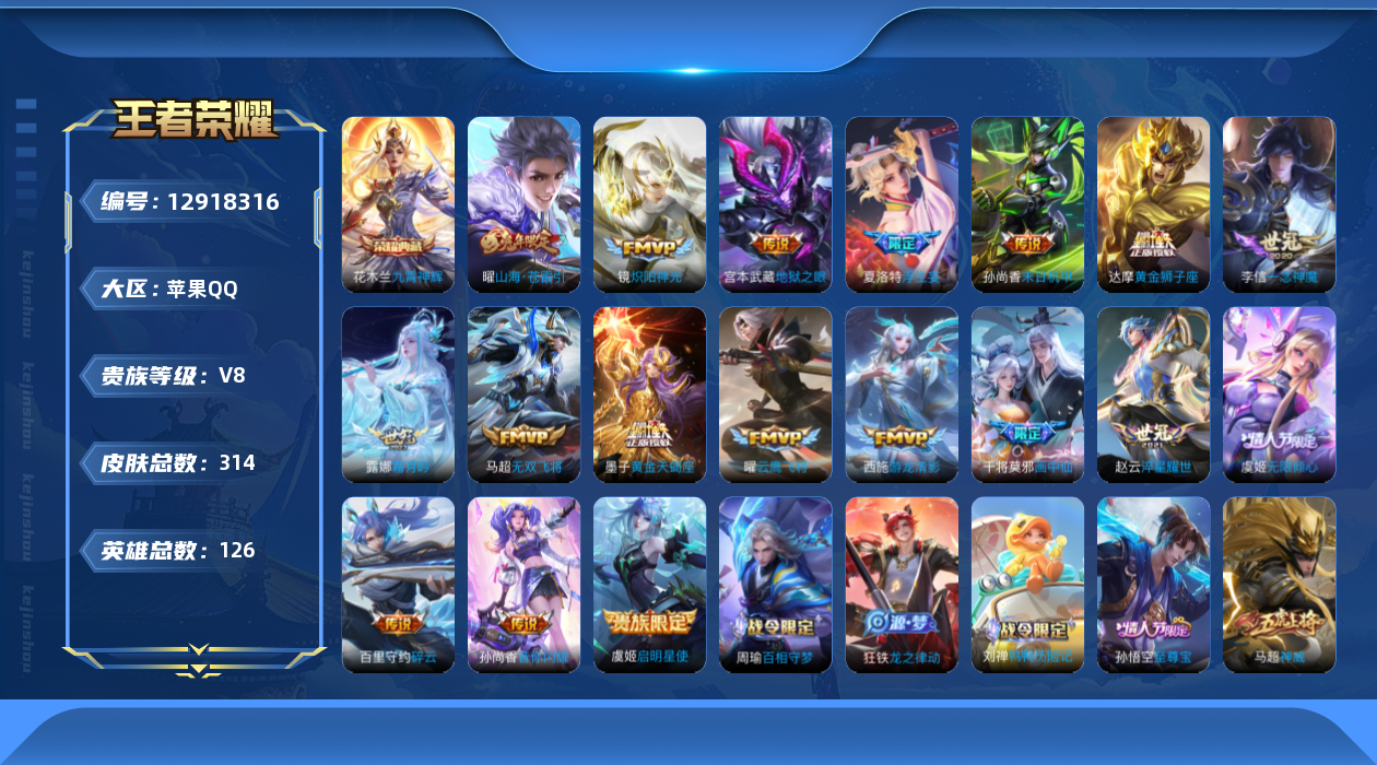 [12918316]苹果Q-V8-永恒钻石V段位-126英雄-314皮肤-1典藏-0珍品无双-0无双-0珍品传说-18传说-81史诗