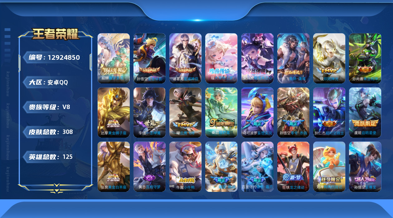 [12924850]安卓Q-V8-至尊星耀III段位-125英雄-308皮肤-2典藏-1珍品无双-0无双-3珍品传说-11传说-88史诗