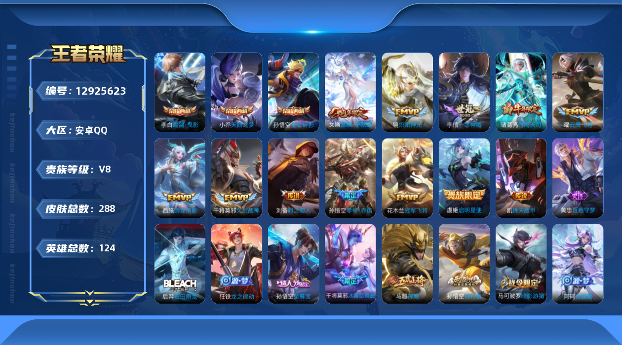 [12925623]安卓Q-V8-最强王者段位-124英雄-288皮肤-3典藏-0珍品无双-0无双-0珍品传说-12传说-96史诗